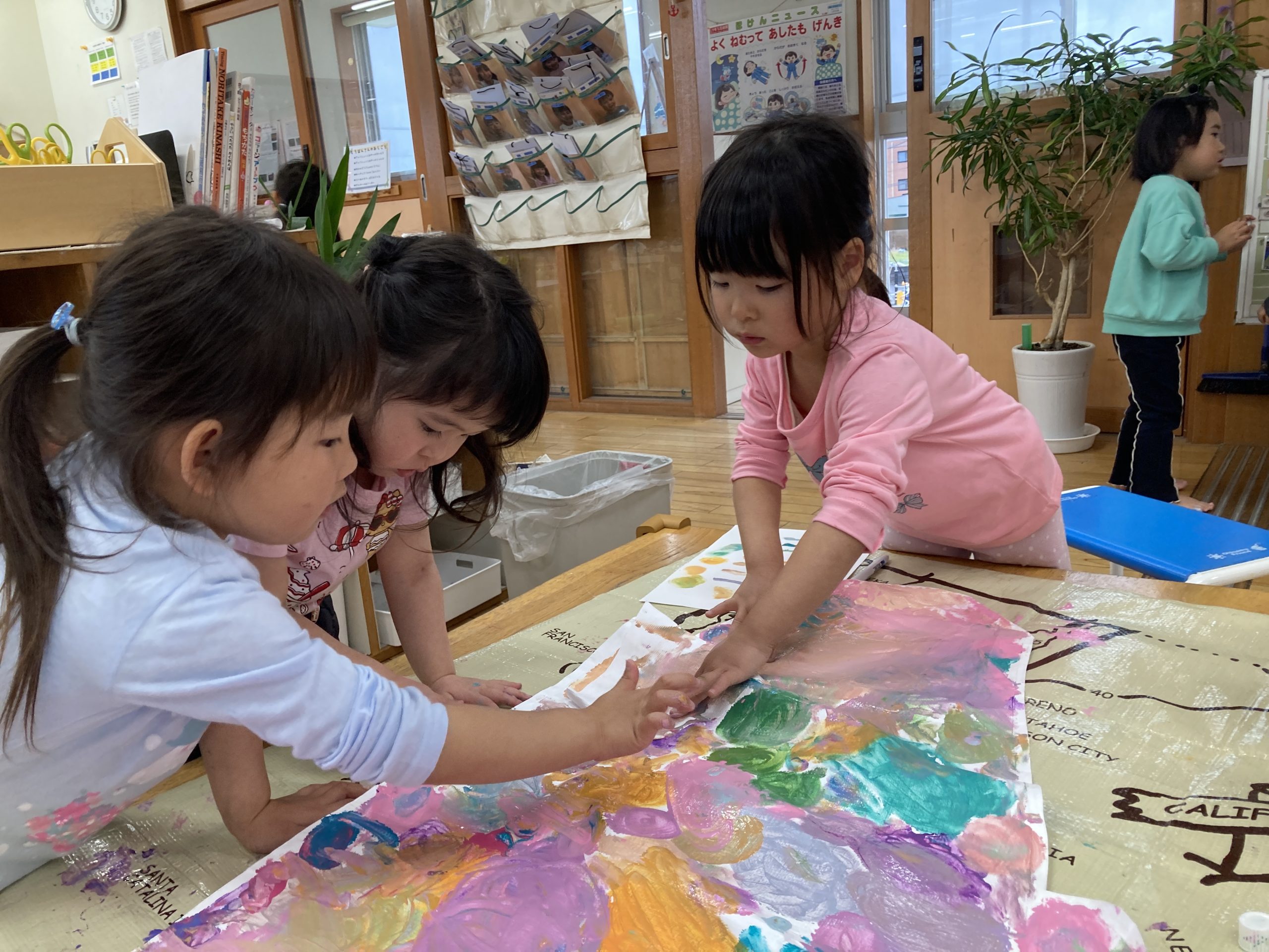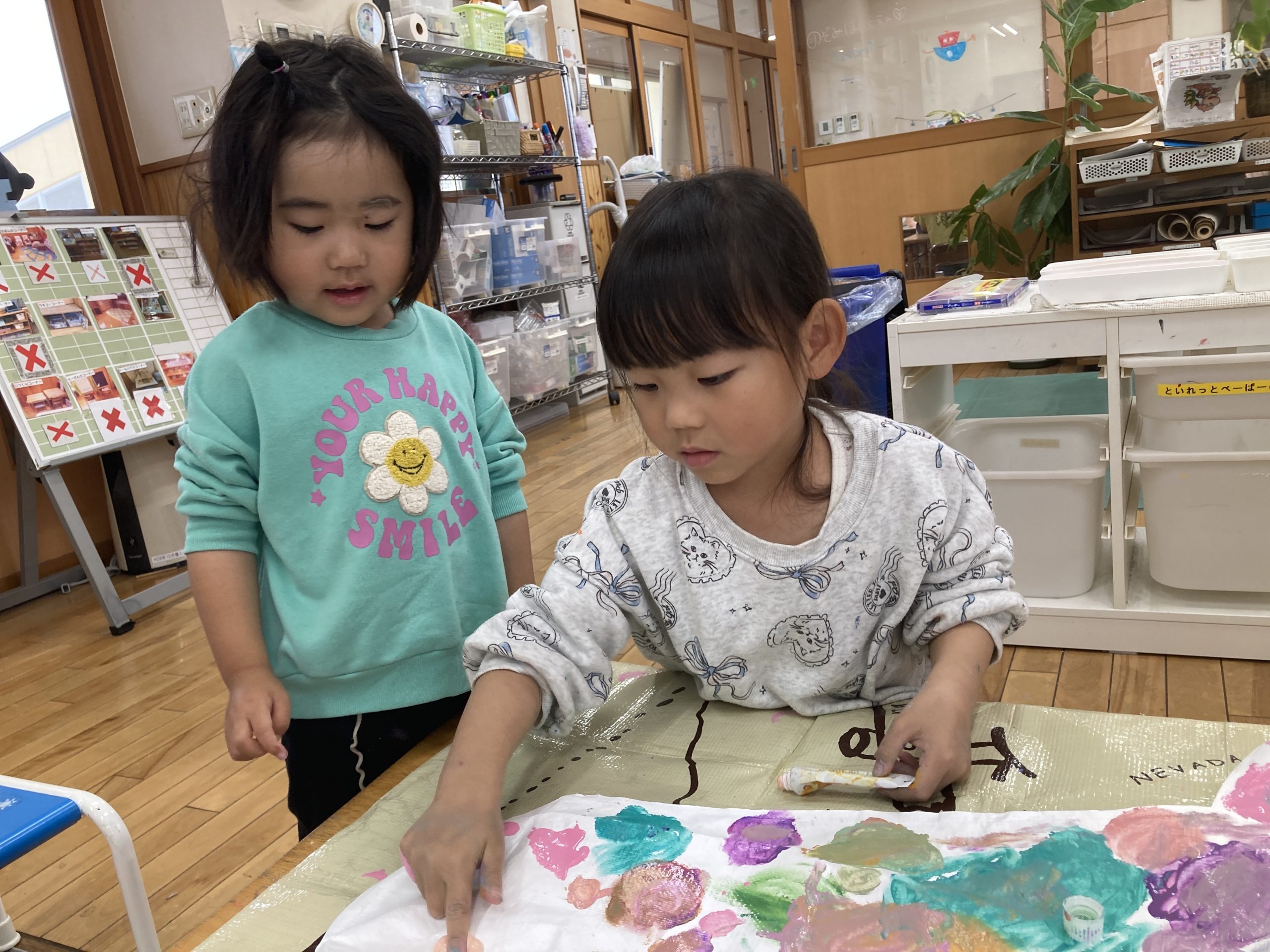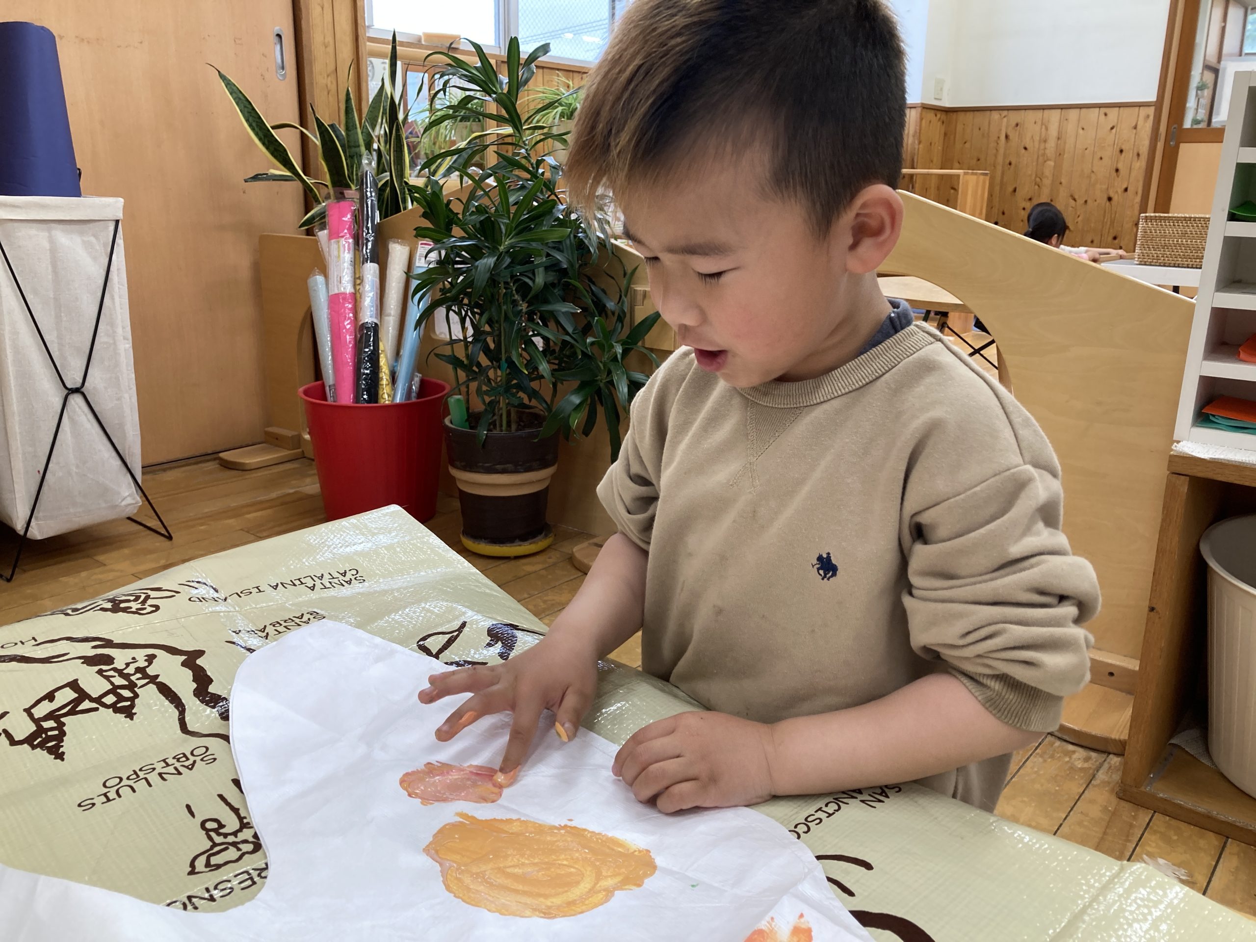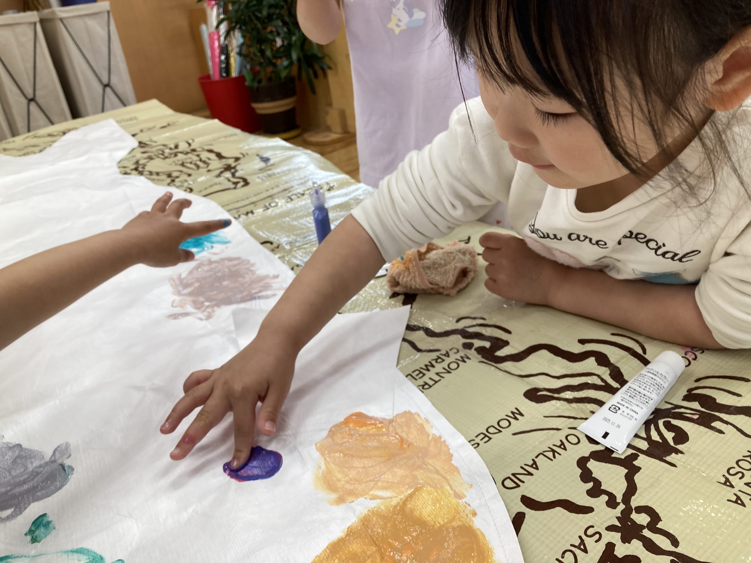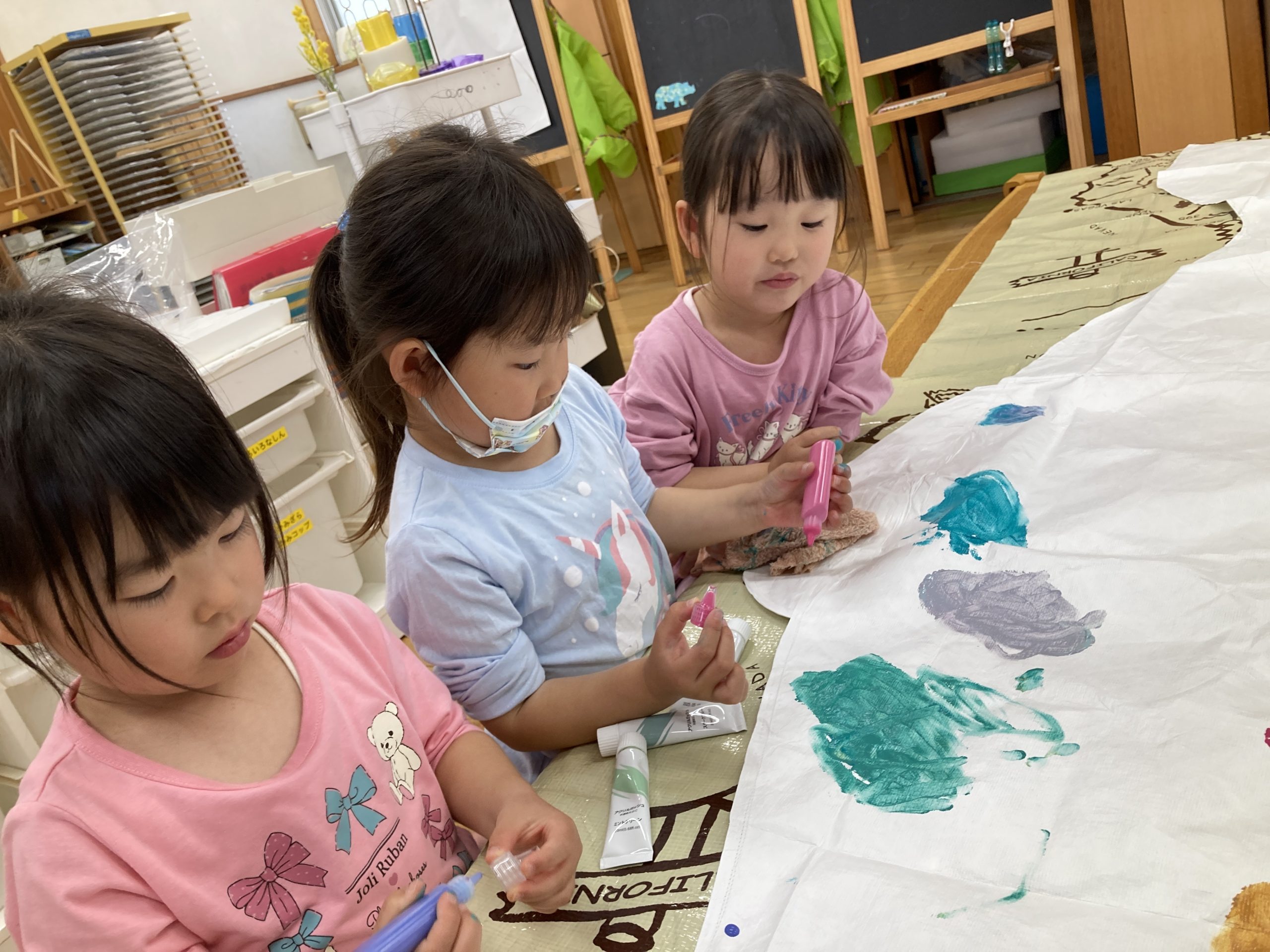 今日は造形あそびで、『こいのぼり制作』をしました。チューブに入った絵の具を2色選んで、白のこいのぼりの土台に指で混ぜながら、色を塗りました。🎏白い部分がなくなるようにいろんな色を使って、たくさん絵の具を塗って遊びました。