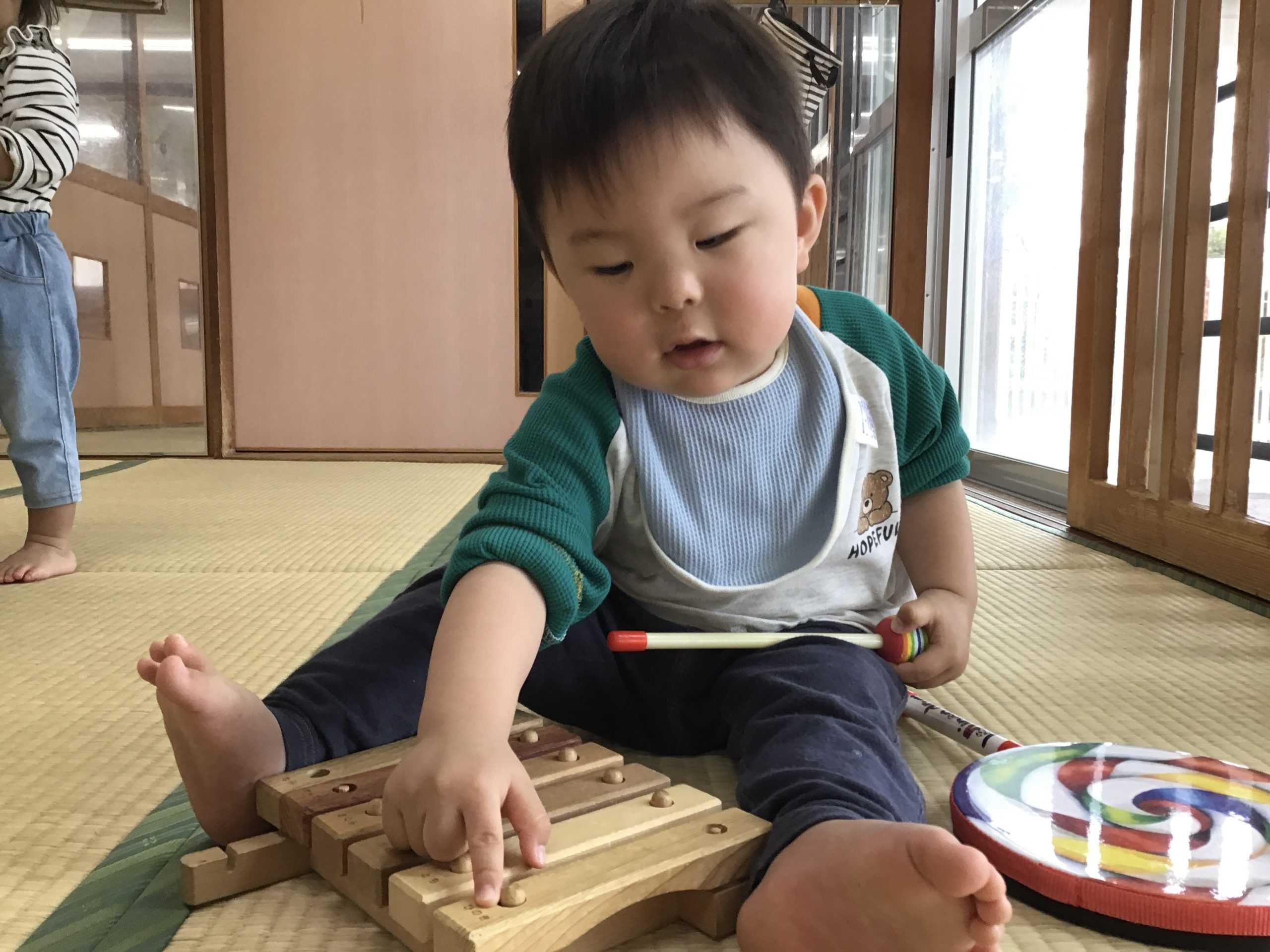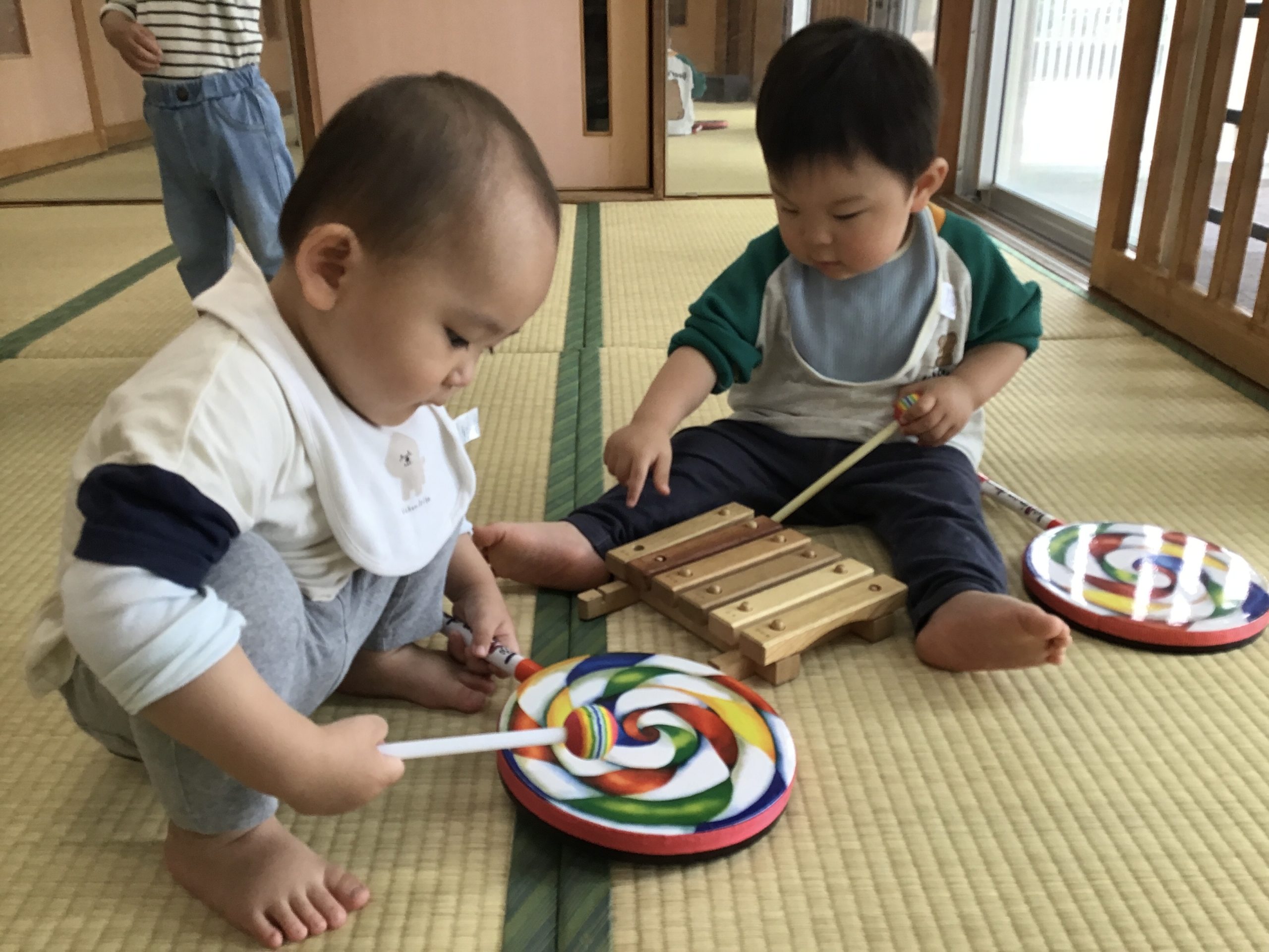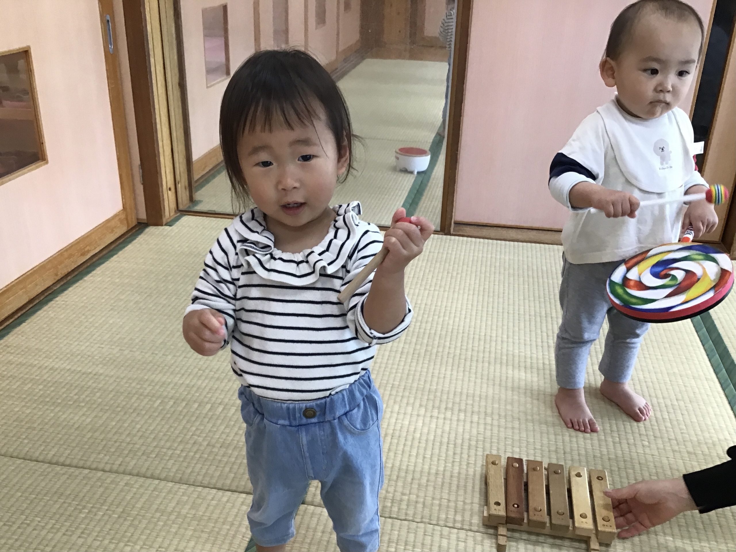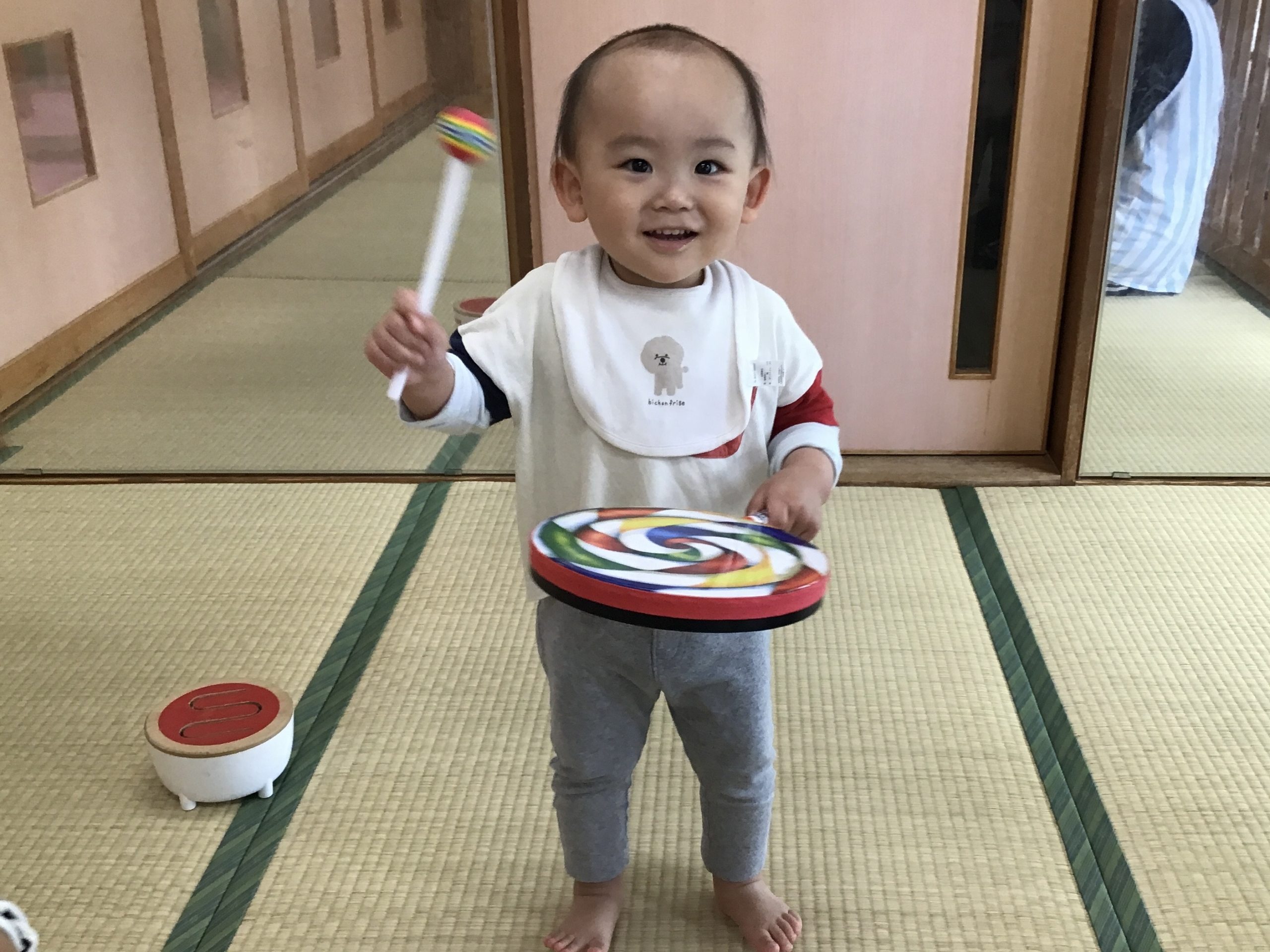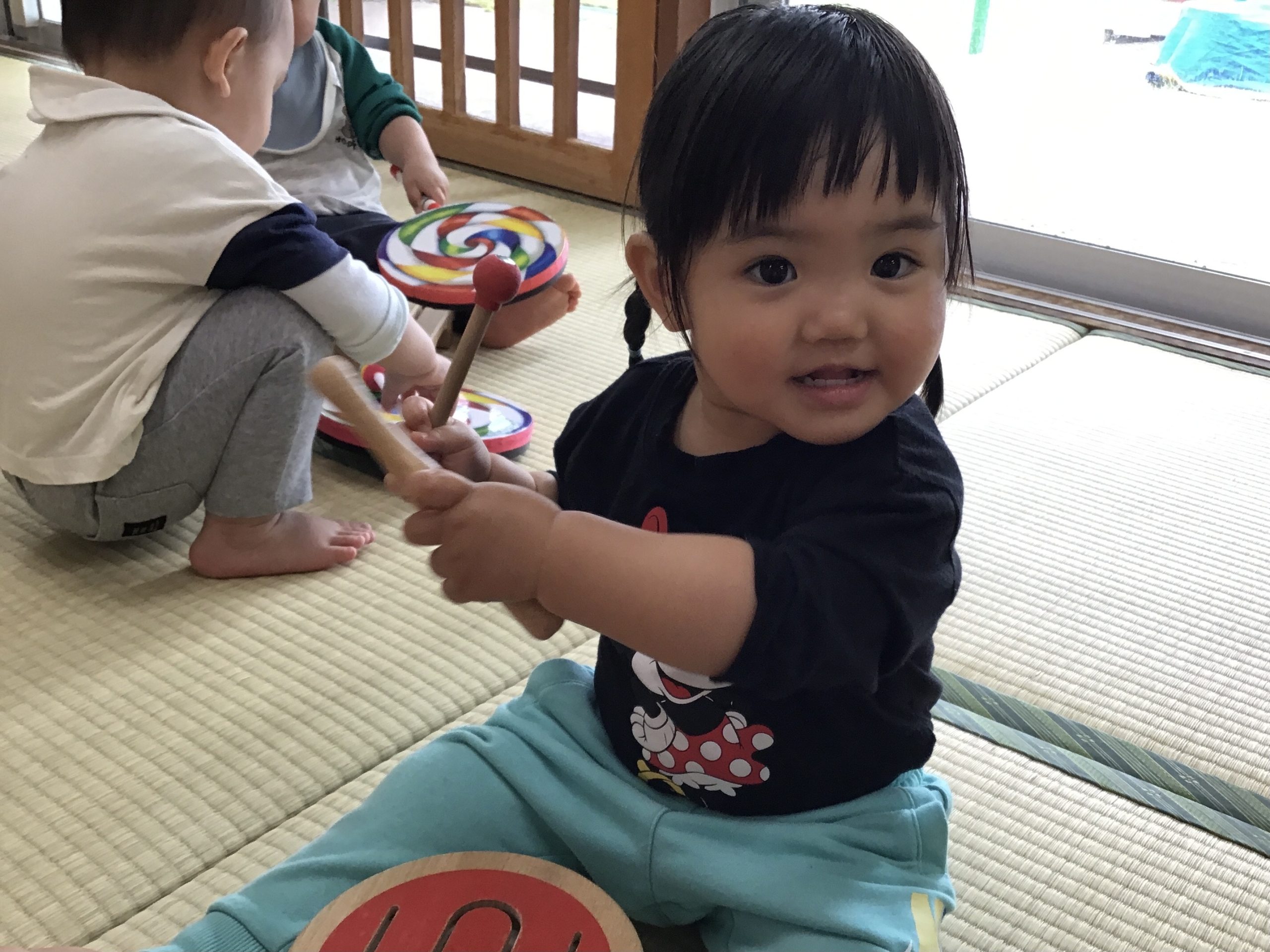 今日は、畳の部屋で楽器遊びをしました!音楽に合わせてタンバリンや太鼓を楽しそうに叩いていましたよ🥁🌟