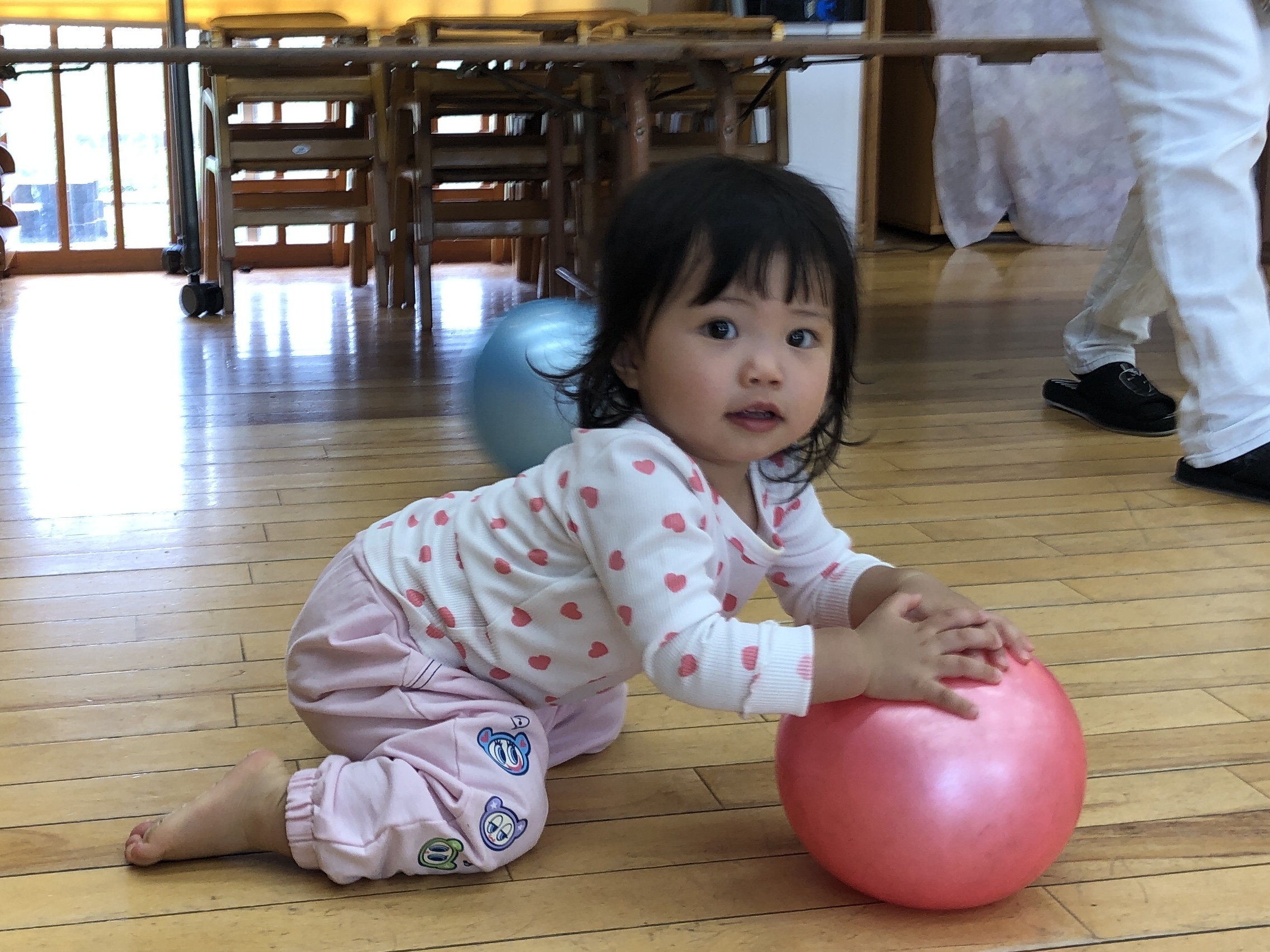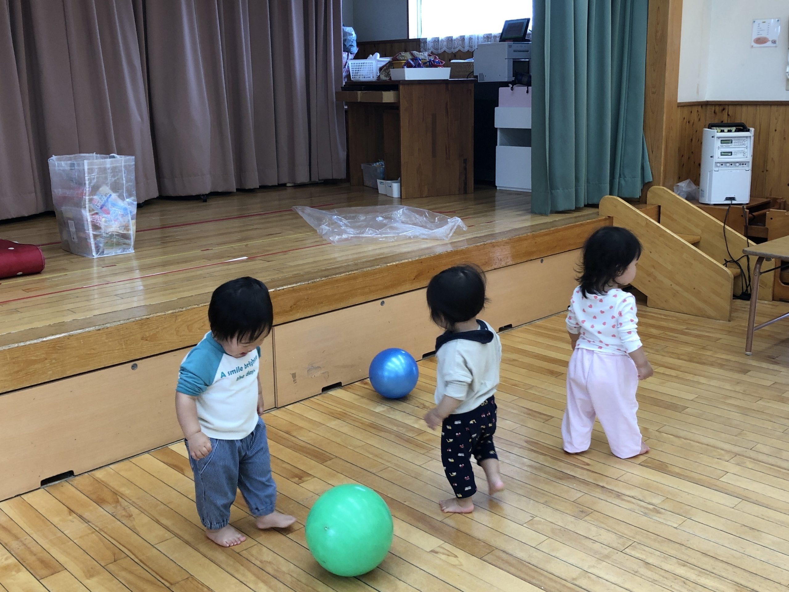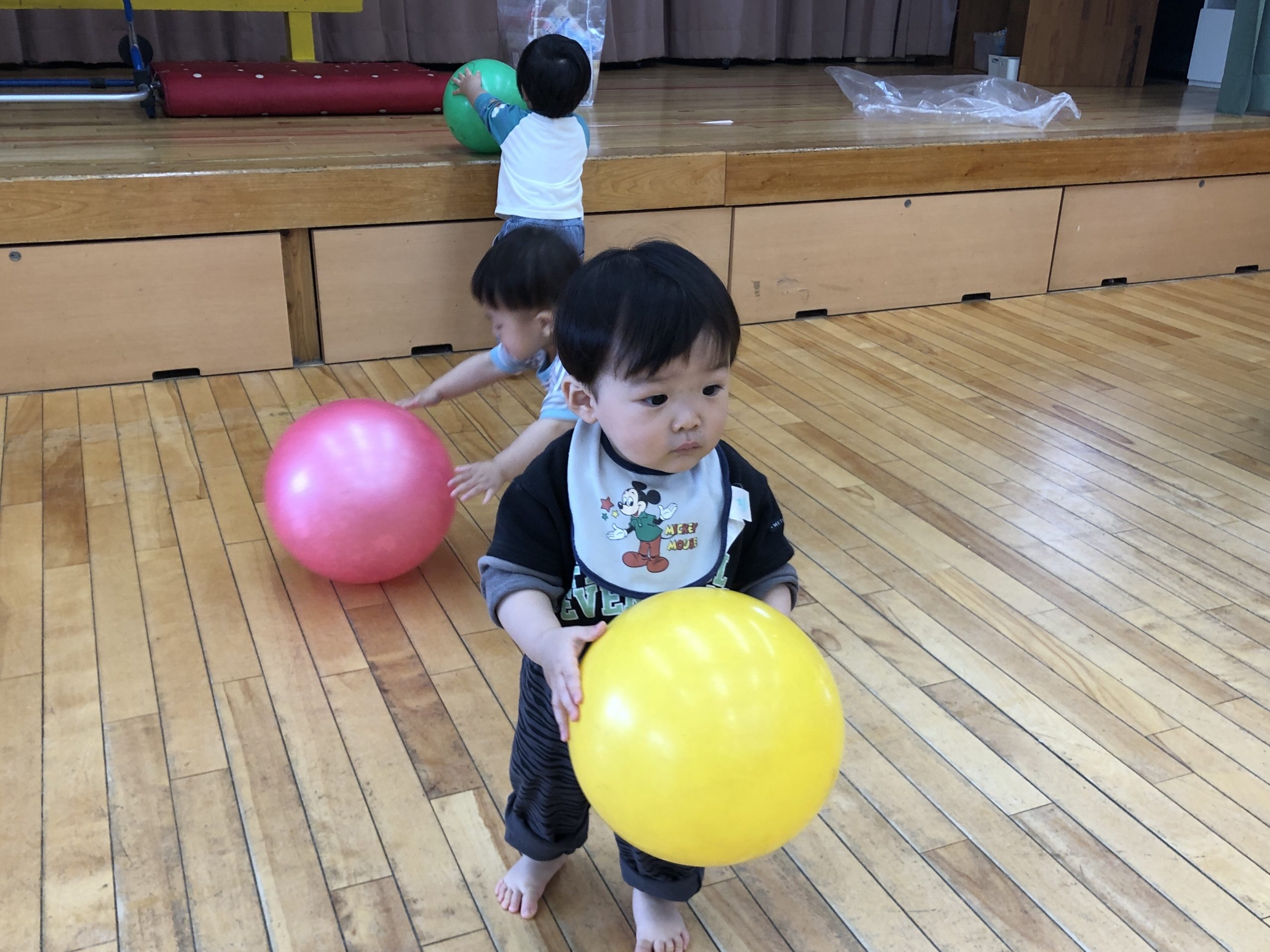 今日は、ホールでボール遊びをしました!いつもより大きいボールに大興奮の子どもたち💗体をたくさん動かして遊びましたよ✨その後はリズム遊びや手遊びをしました🎵
