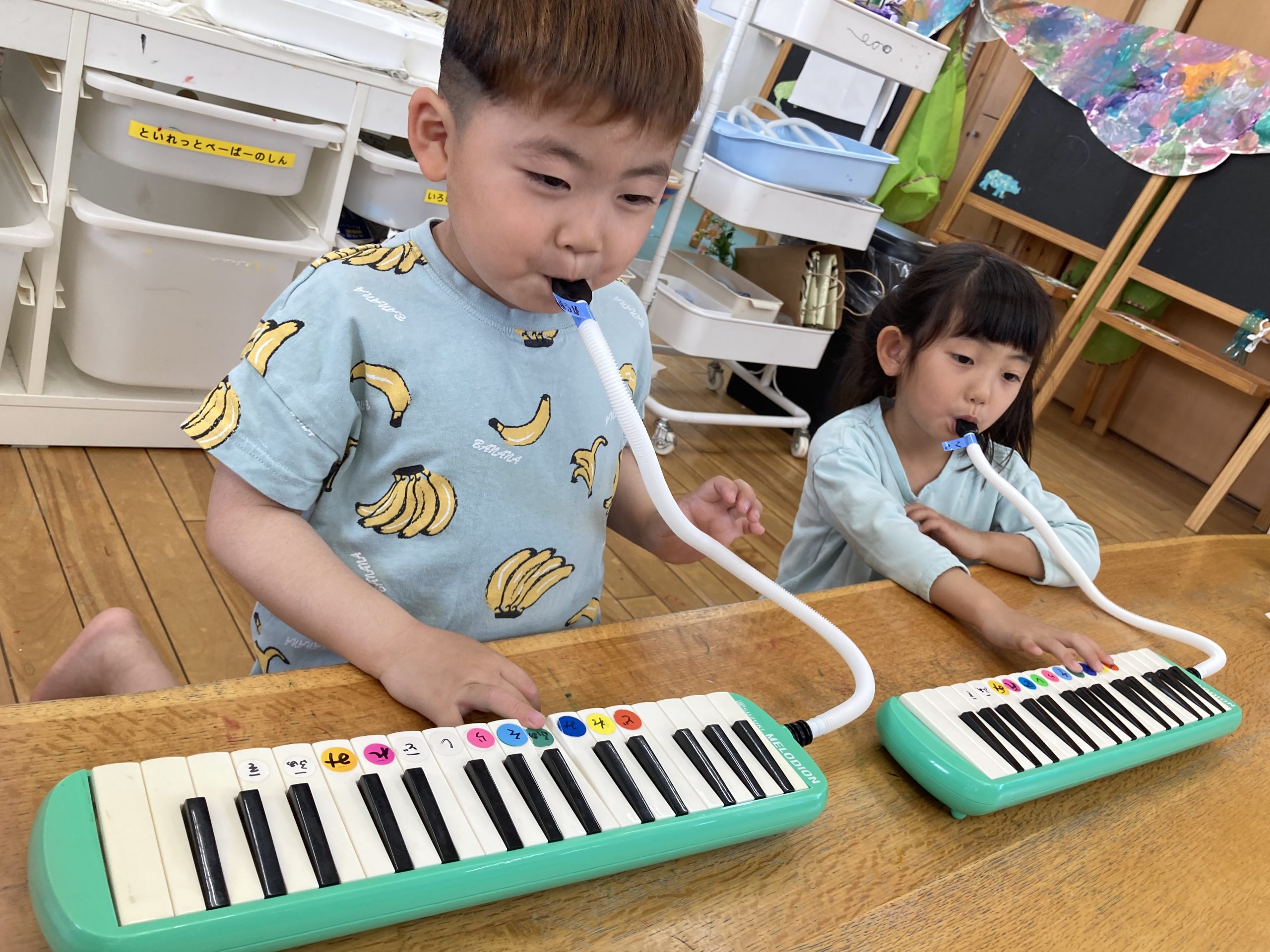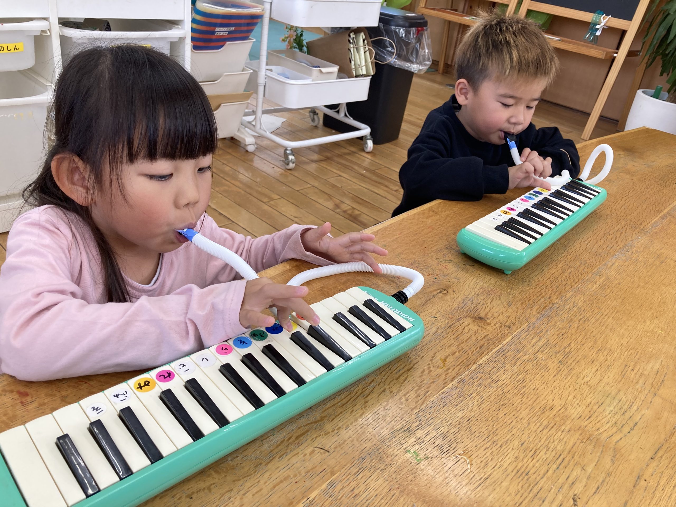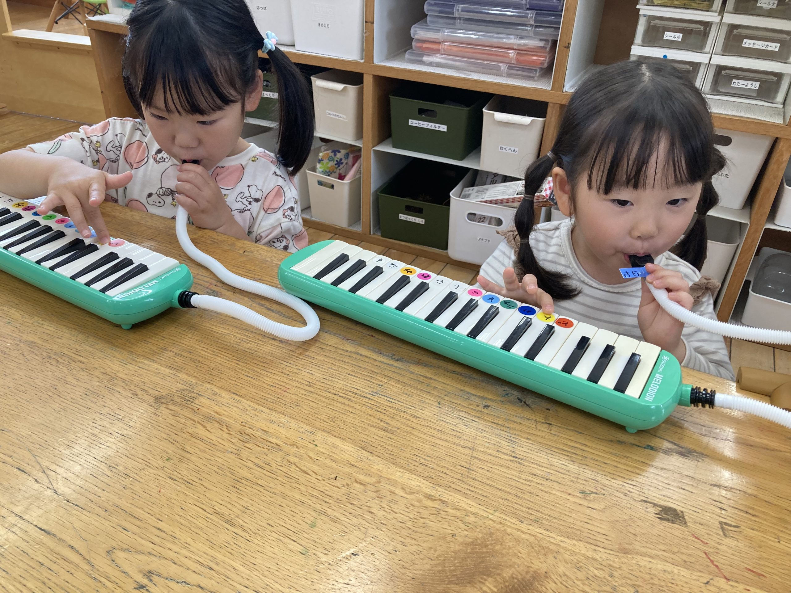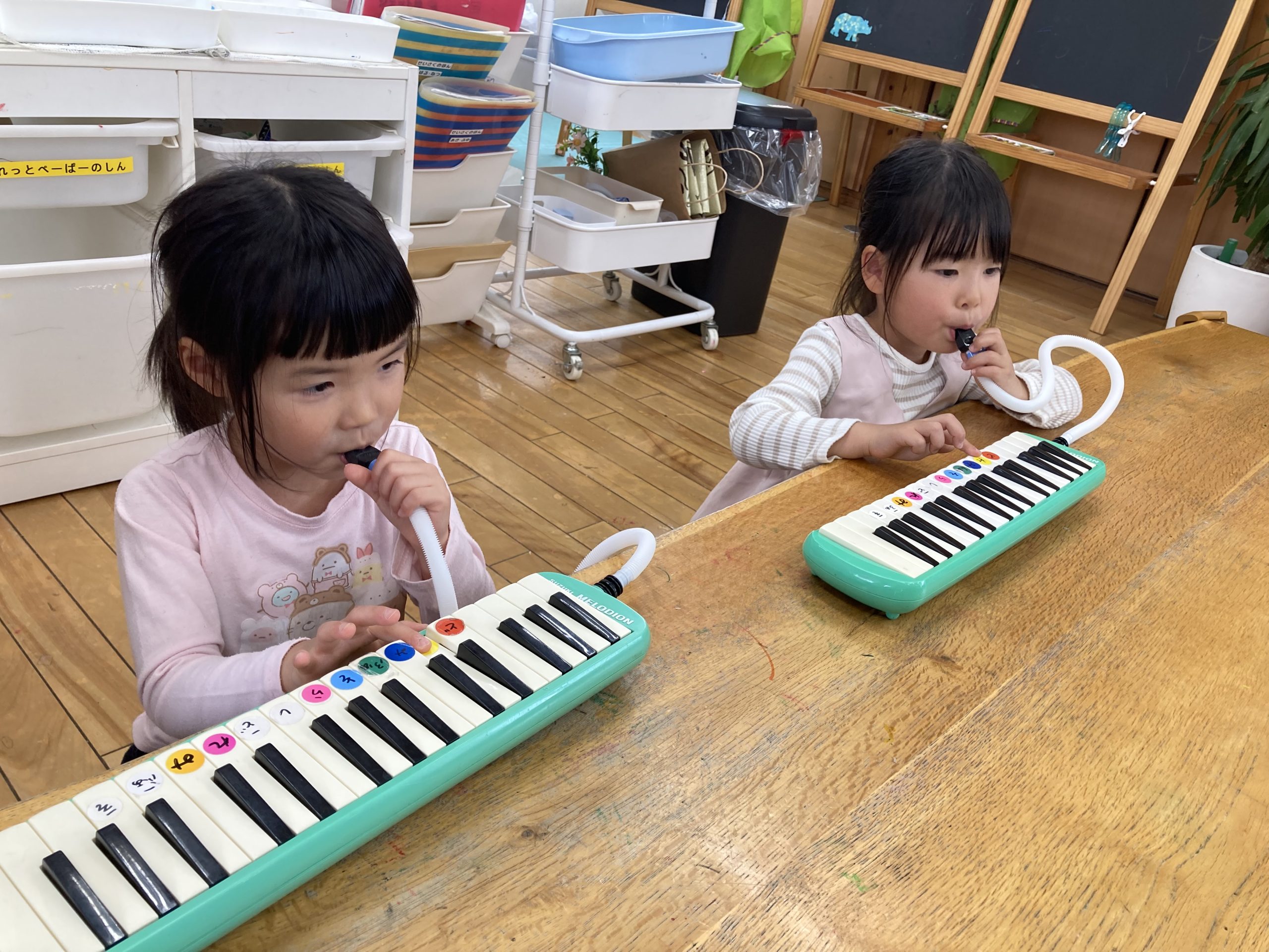 今日は『楽器あそび』で、『ピアニカ』の練習をしました。鍵盤だけを押さえて、指を動かす練習をして、ホースで息を吹きながら、音を鳴らす練習もしました🎹指づかいが難しいようでしたが、がんばって弾いていました✨