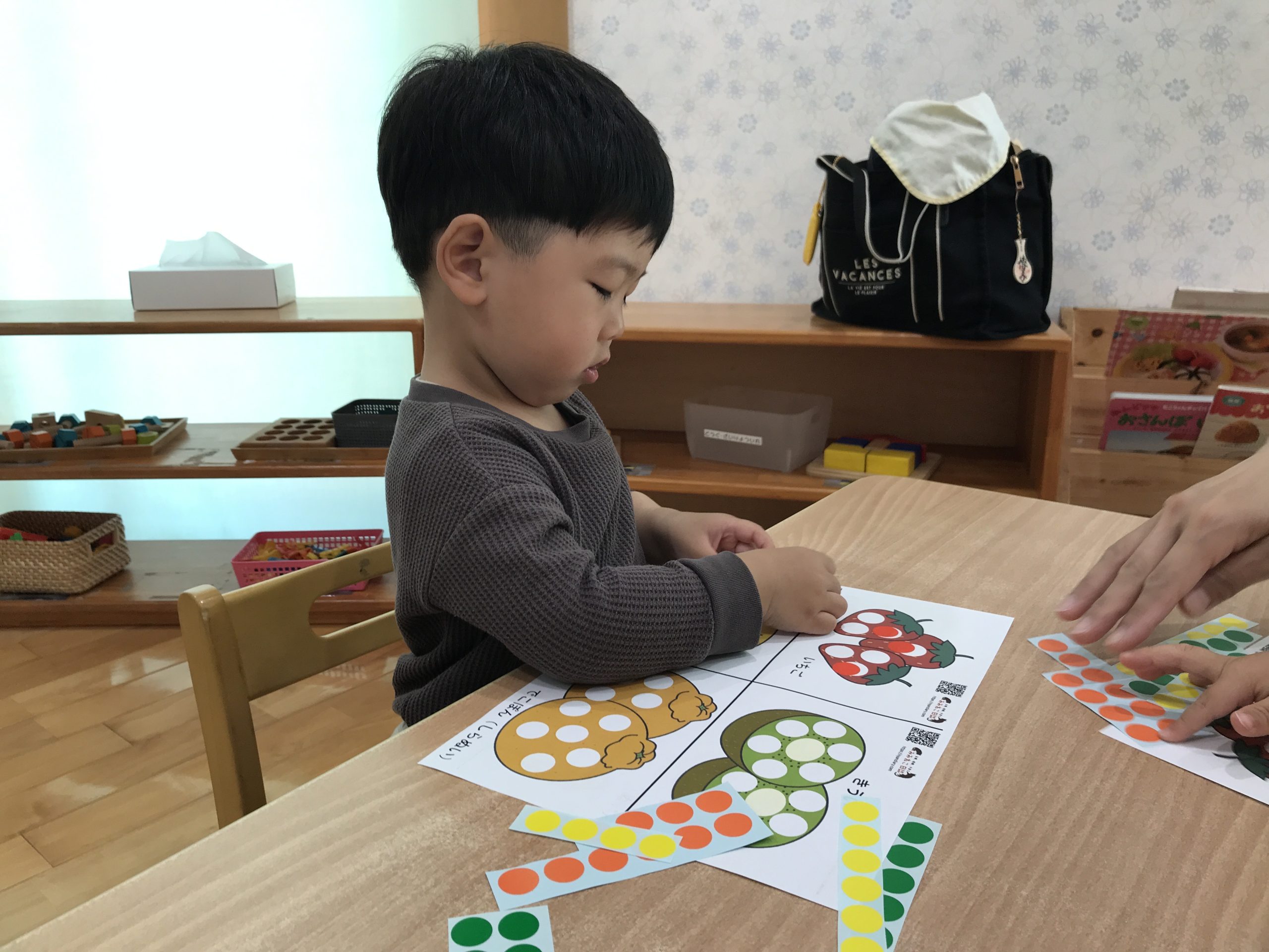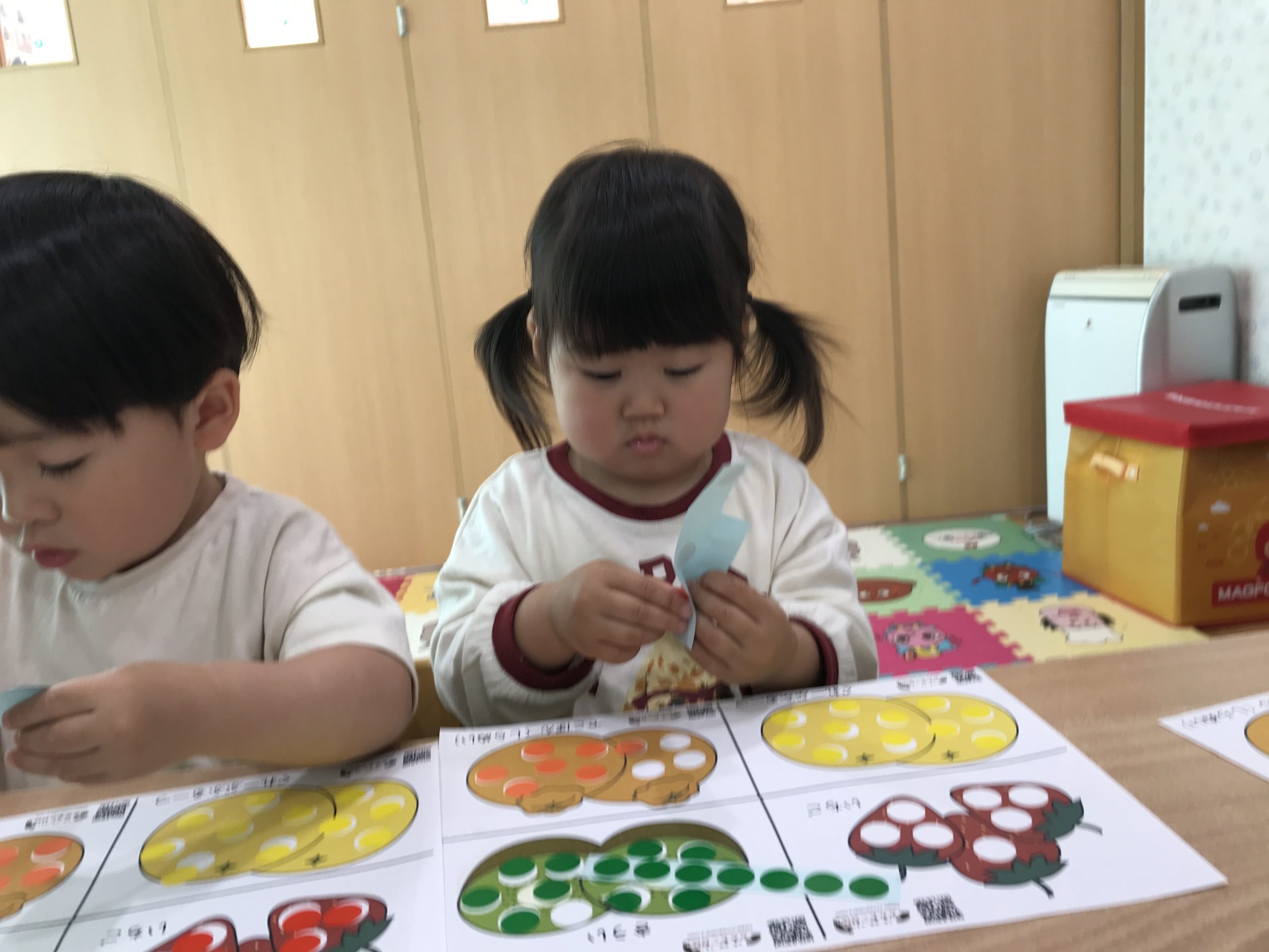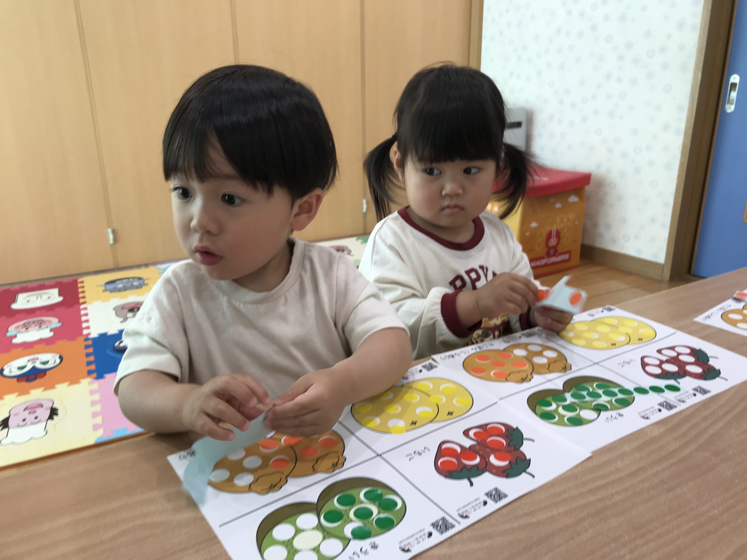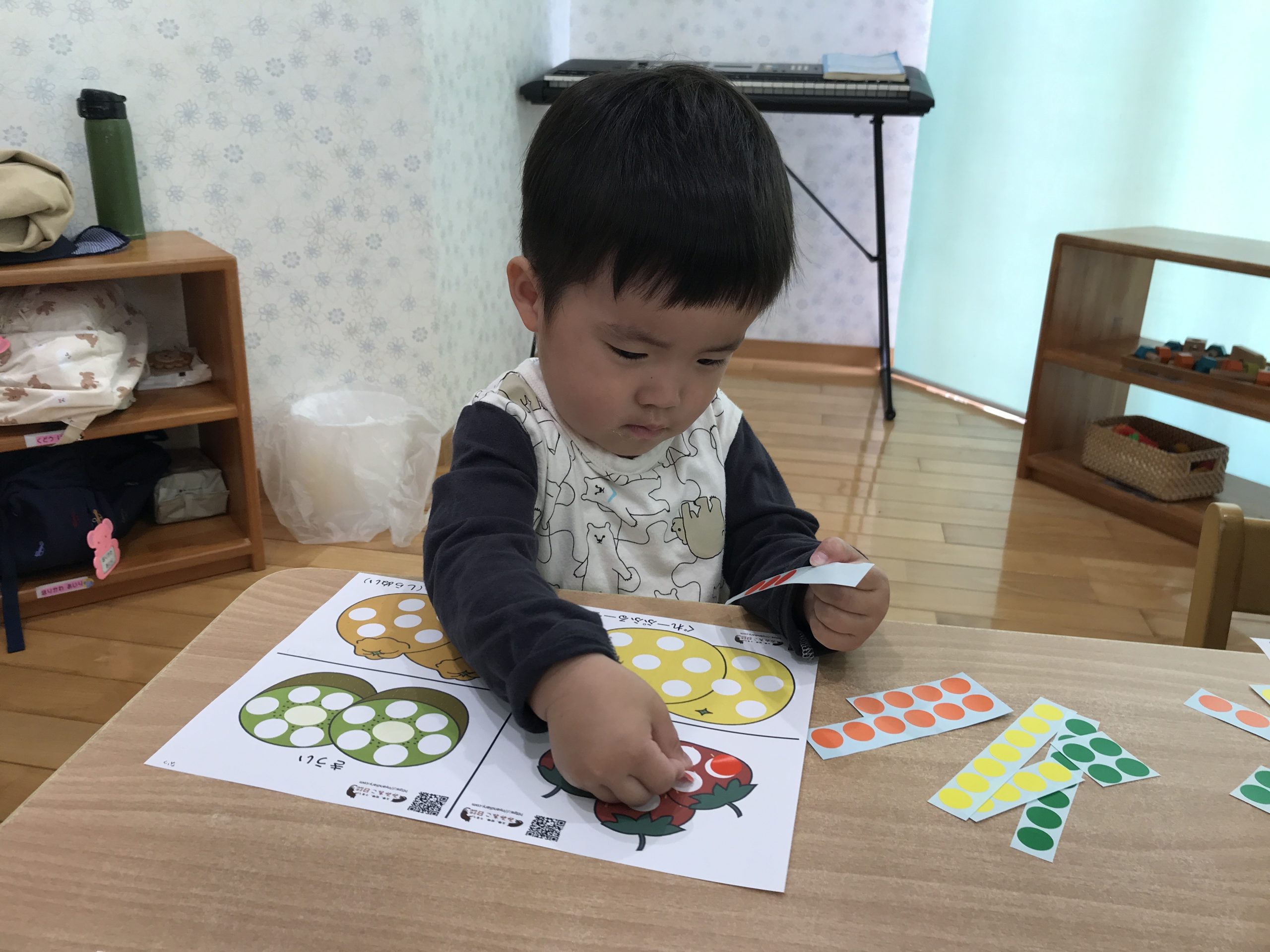 今日は、シール遊びをしました♪イラストの色と同じ色のシールを貼ることができましたよ😊