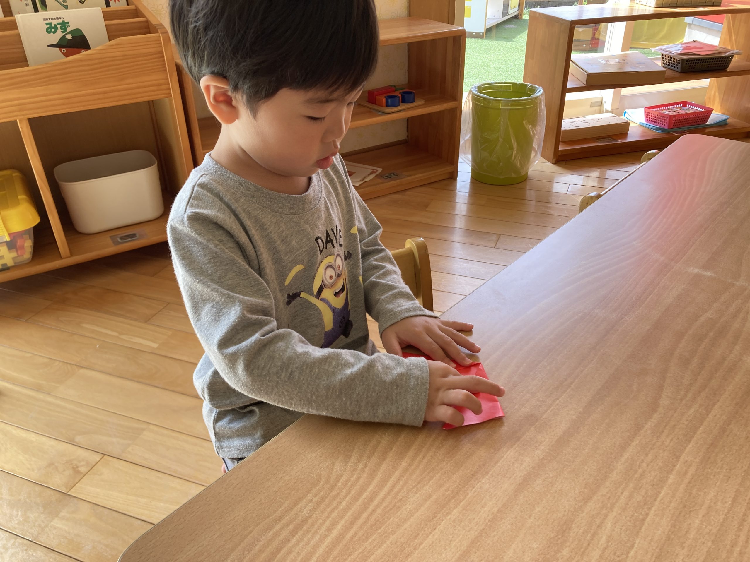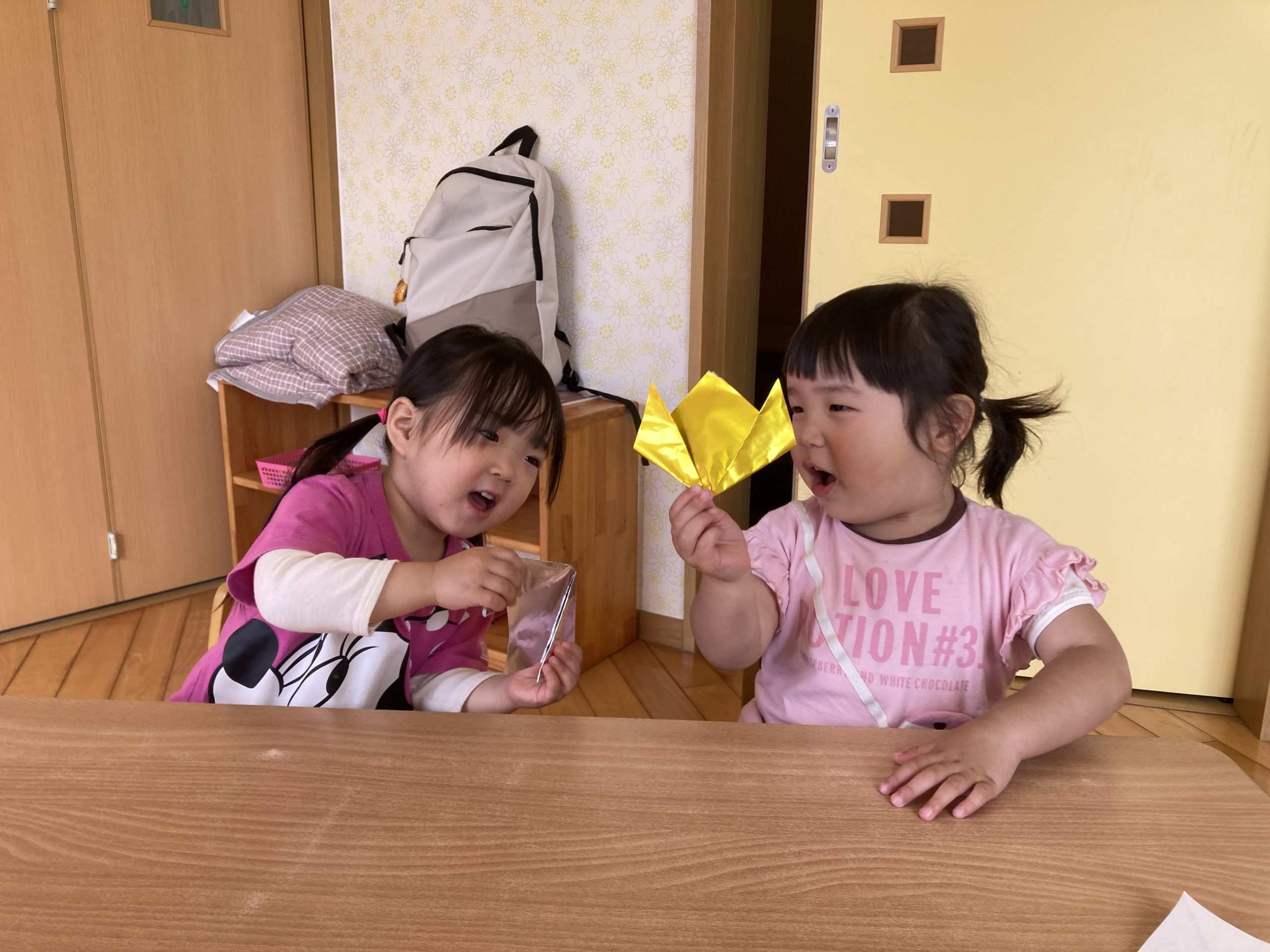 今日は、折り紙でチューリップを折りました🌷好きな色を選んで折りました。お部屋に飾ると喜んでいました。終わった後は園庭で遊びました。