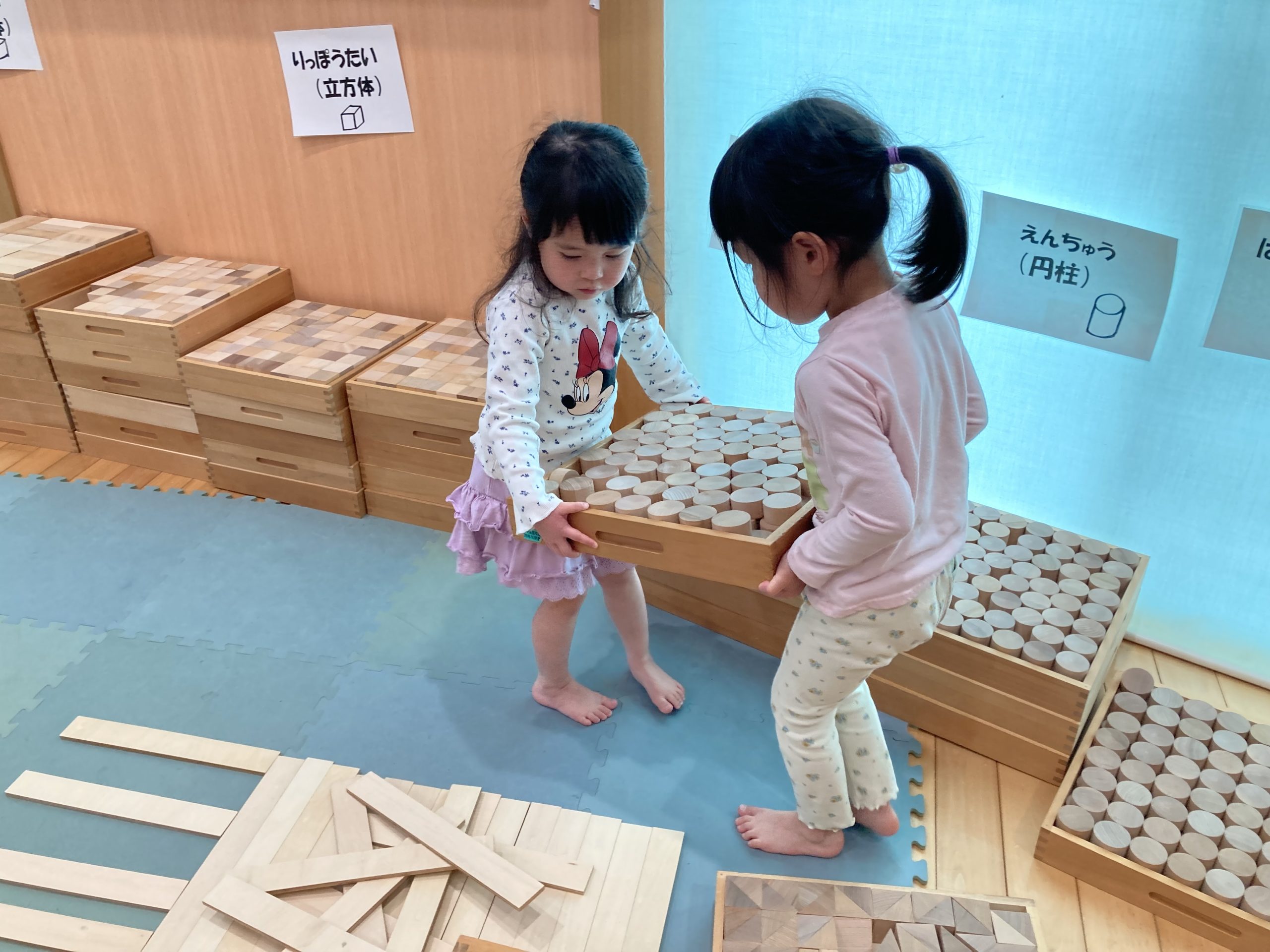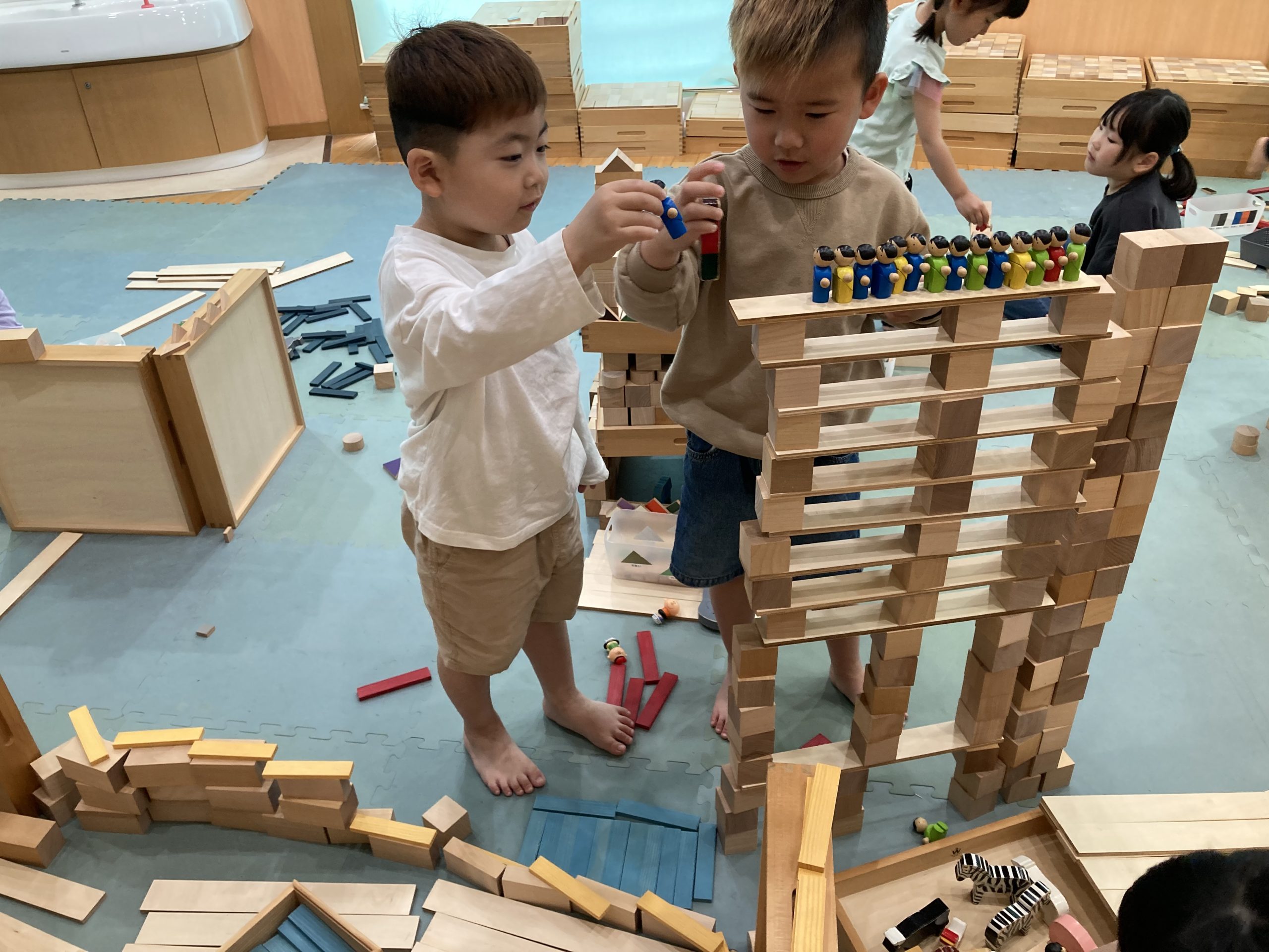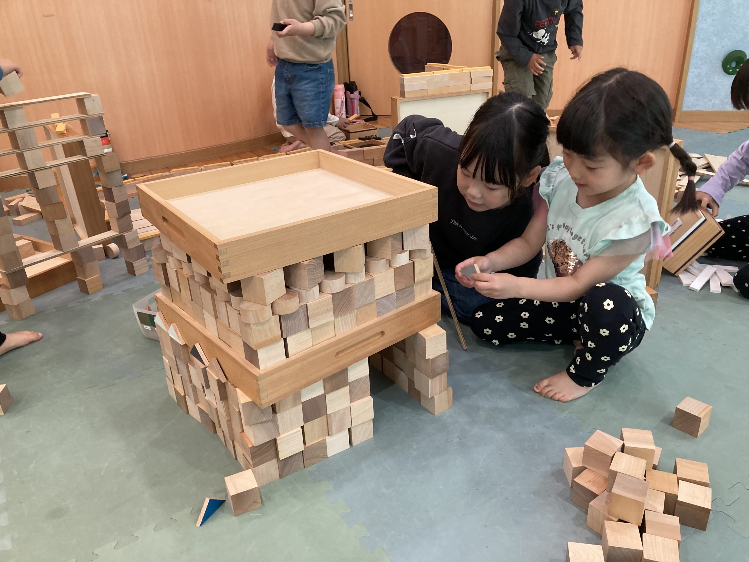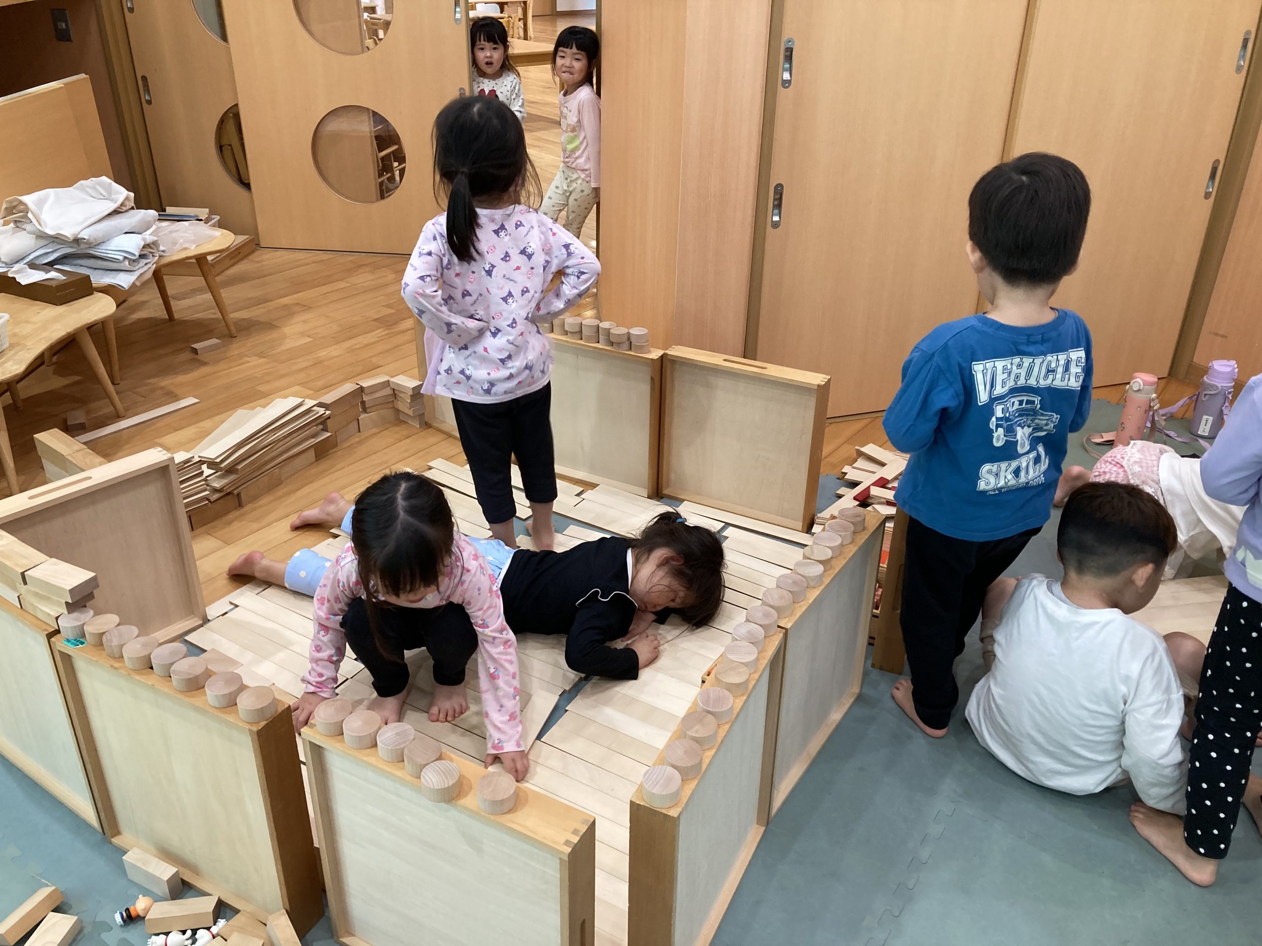 今日は天気が悪かったので、積み木遊びをしました。話し合いで、家、城、イオン、滑り台、ベッドを作りたいと言う意見が出たので、つくりたいものが一緒の友達と力を合わせて作っていました。