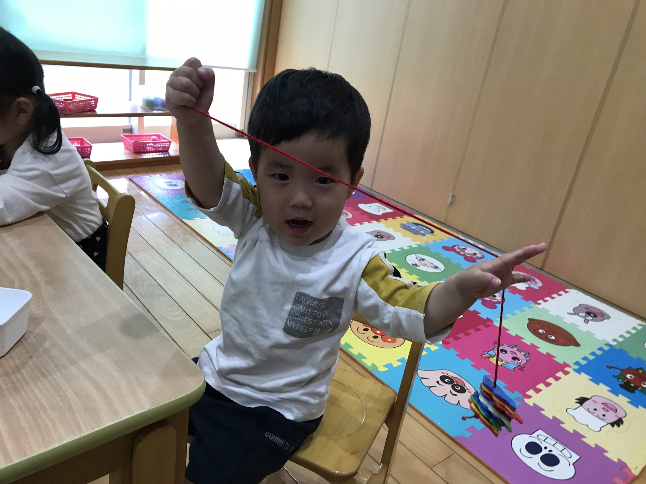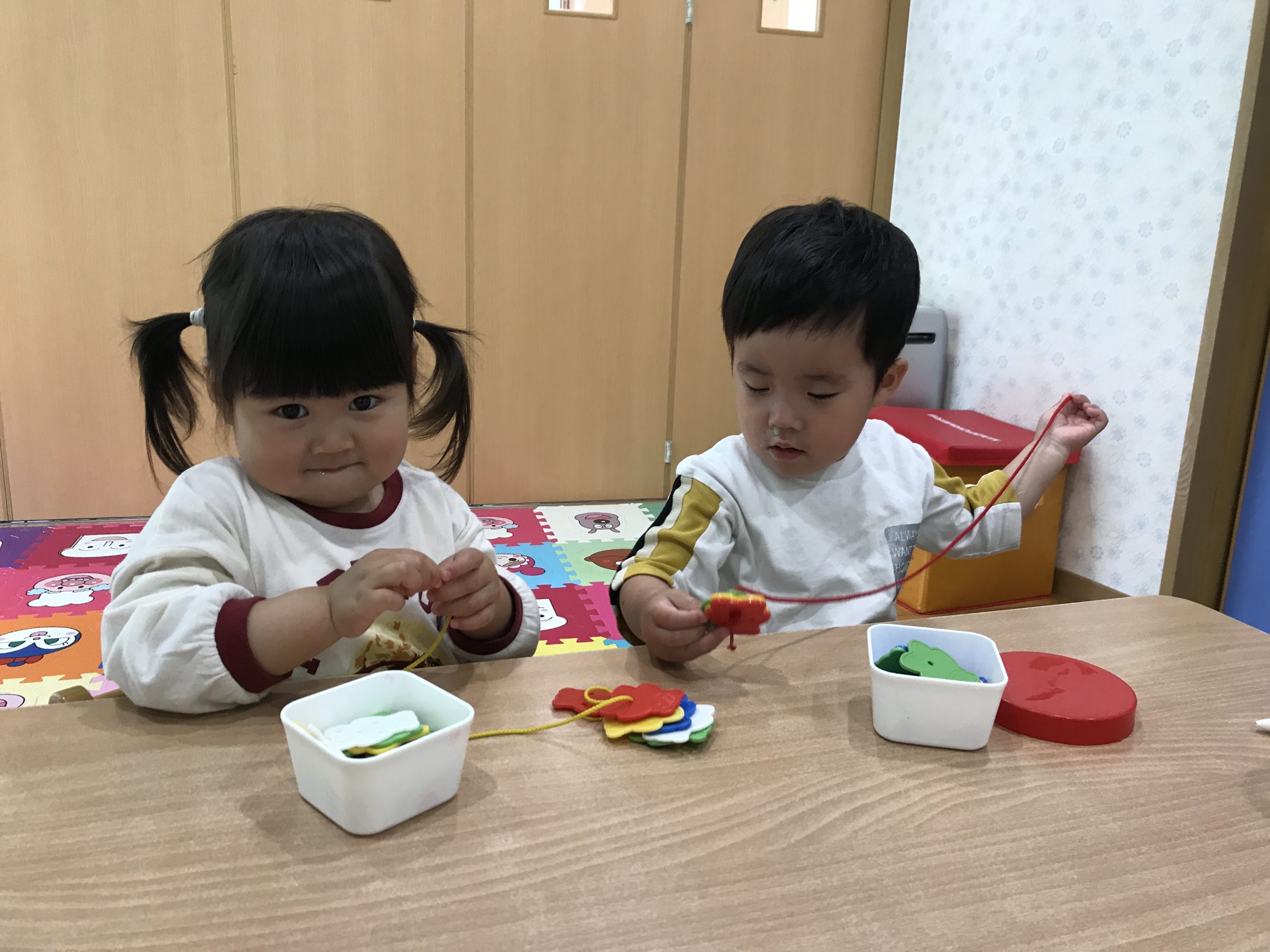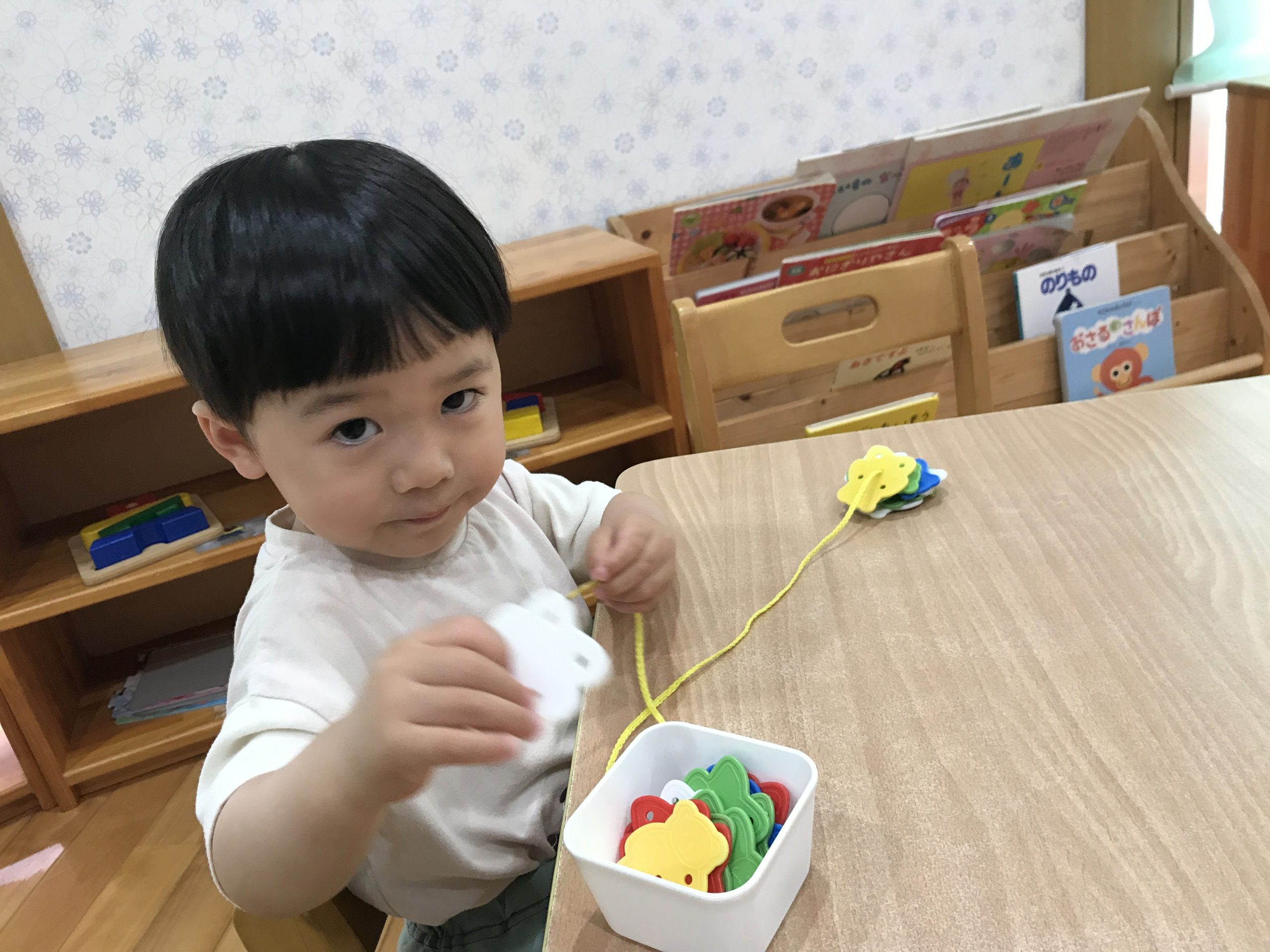 今日は、ひも通しをしました🧸小さい穴にひもを通しながら、頑張って取り組むことが出来ていましたよ~🎶