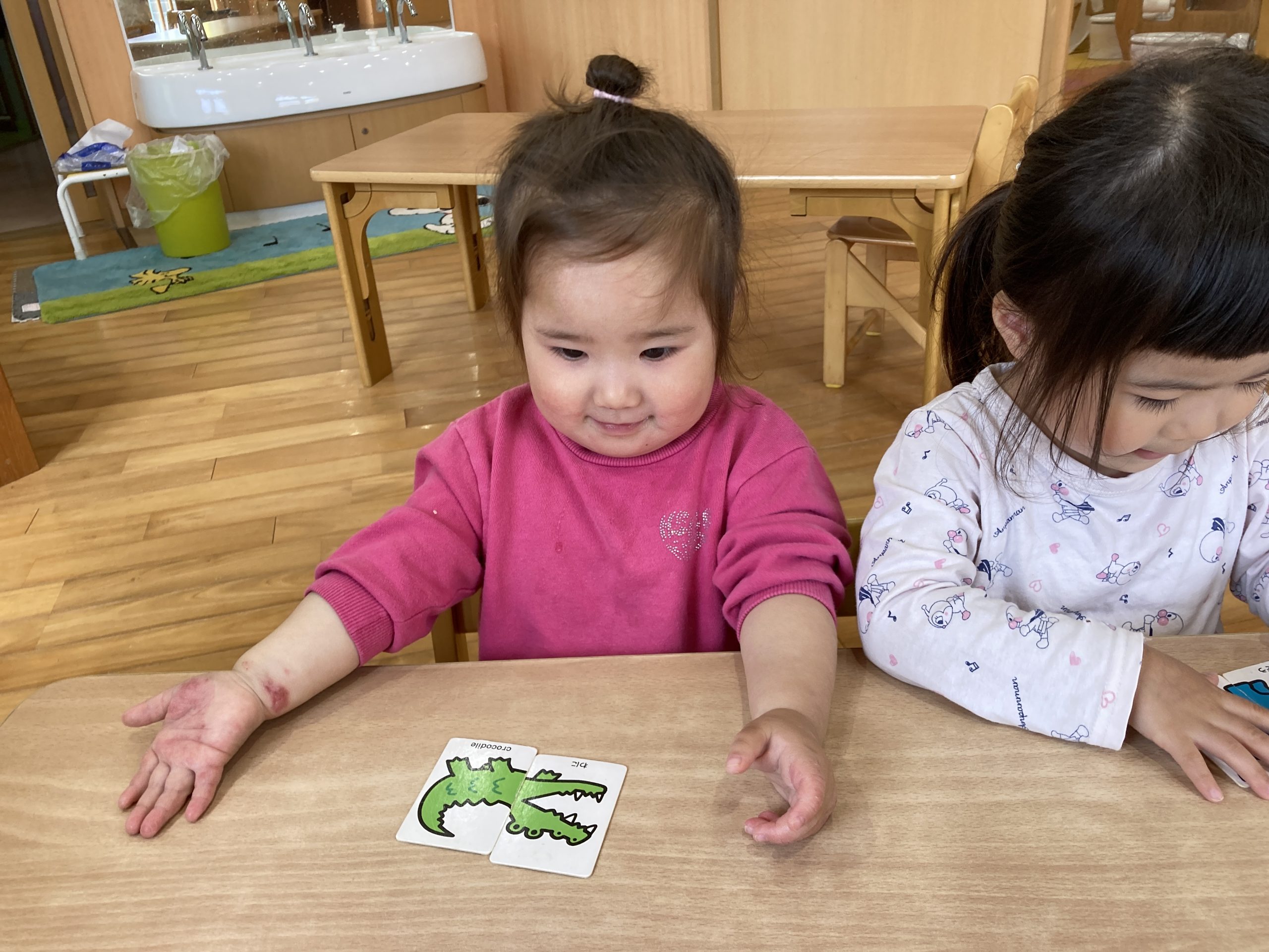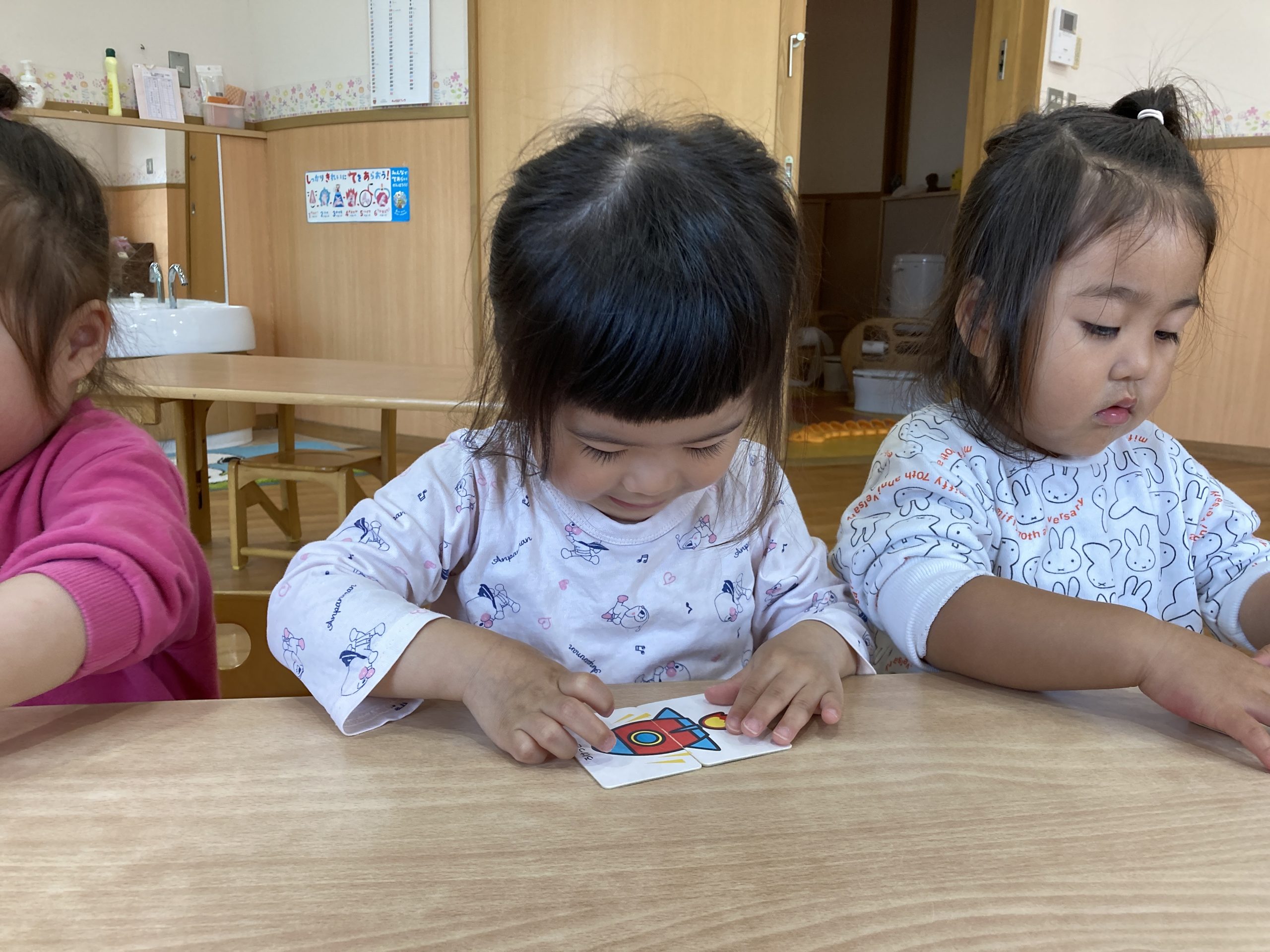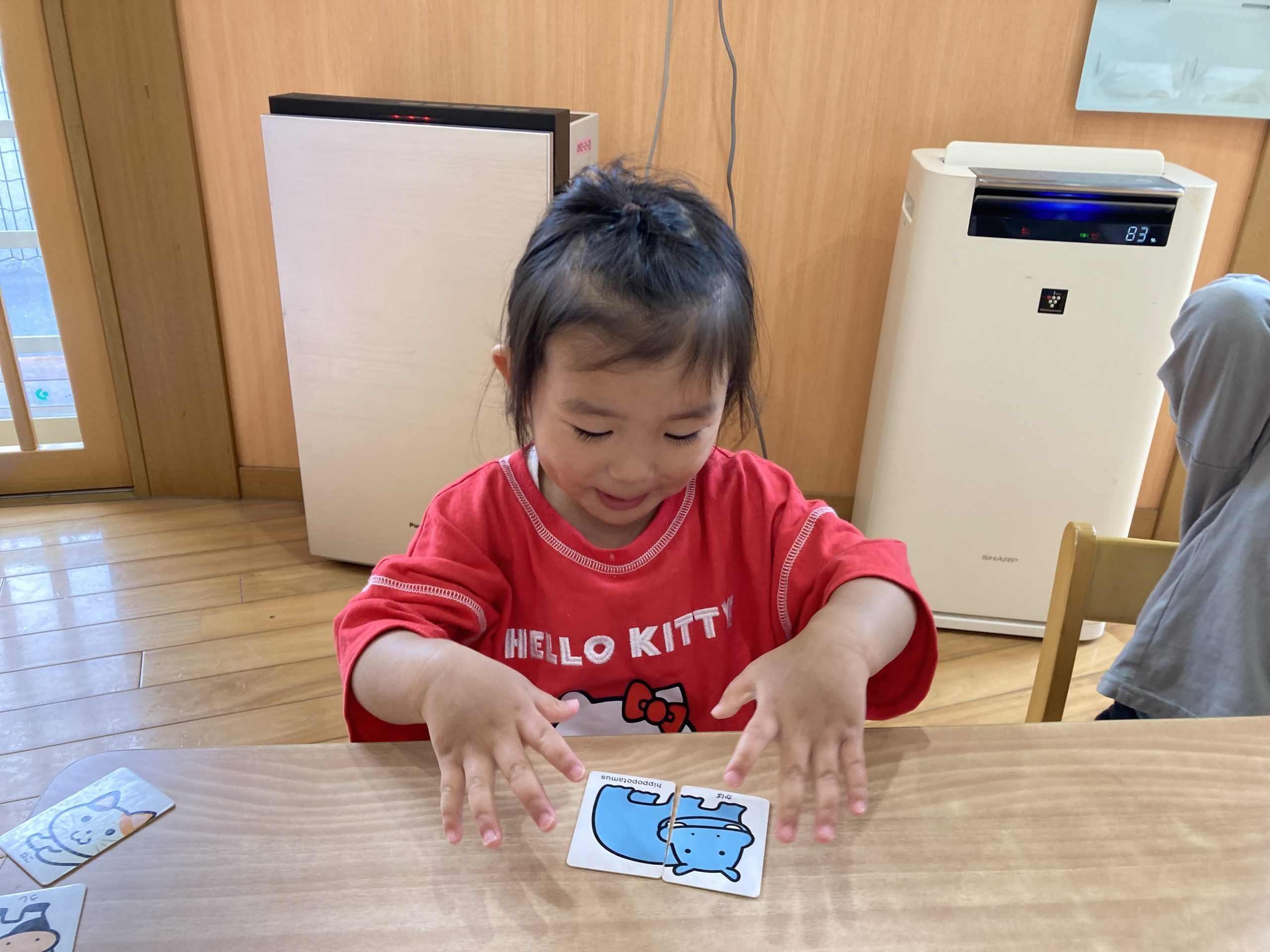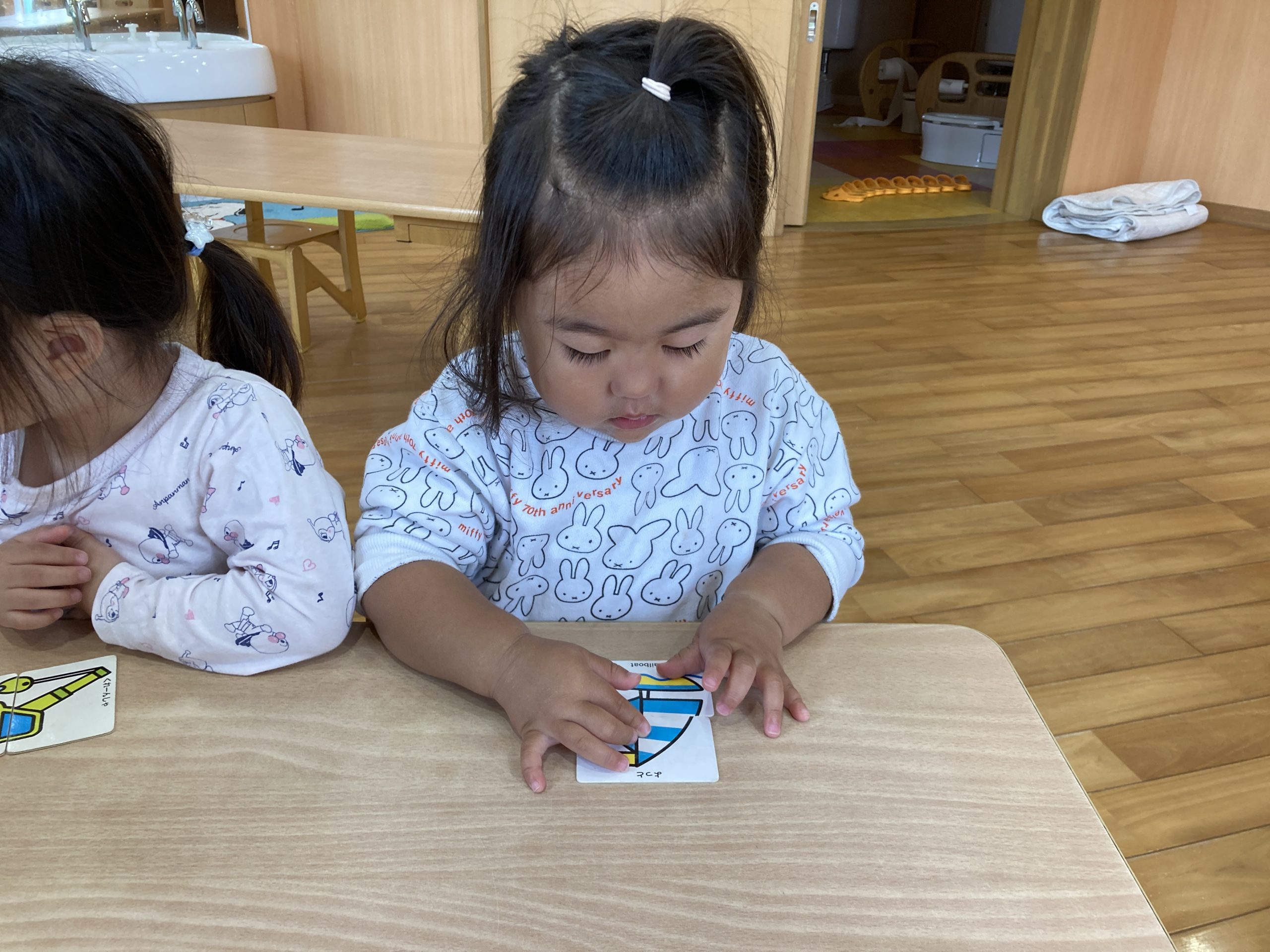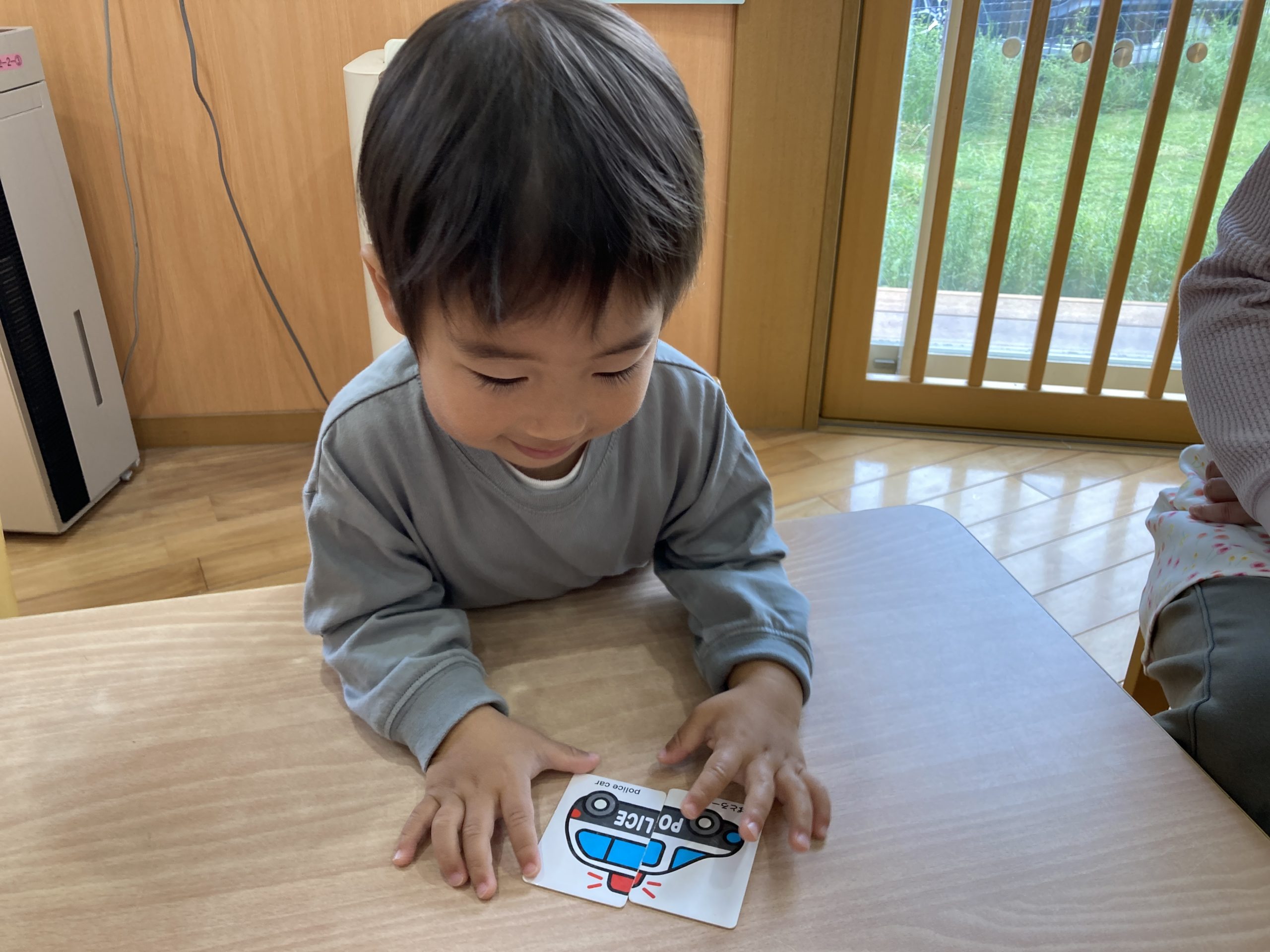 今日は、絵合わせカードをしました♪2枚のカードをくっつけて絵を完成させることができましたよ!絵が完成すると「ぞうさん!」「パトカー」と、楽しそうに絵の名前を答えていました😊