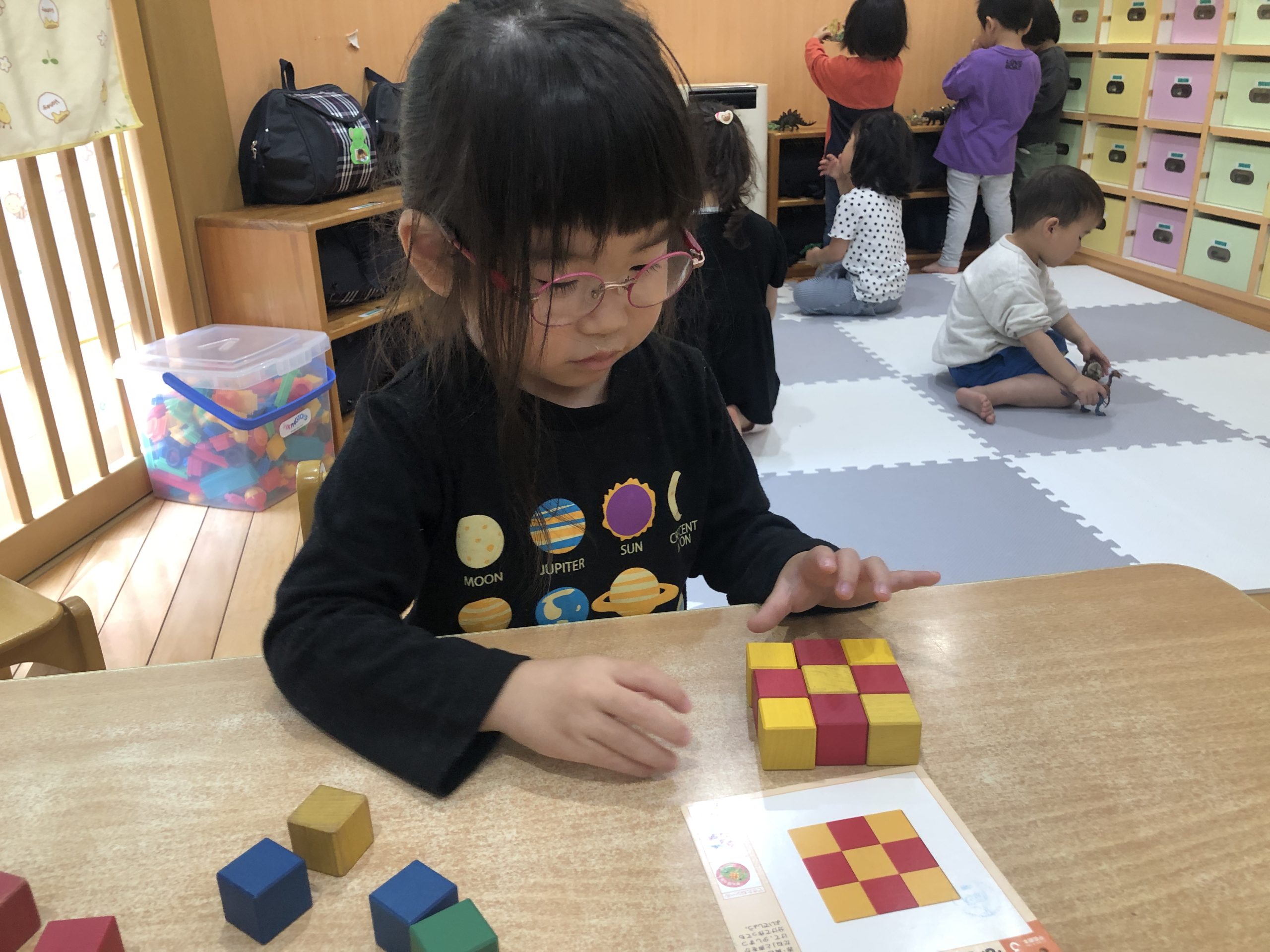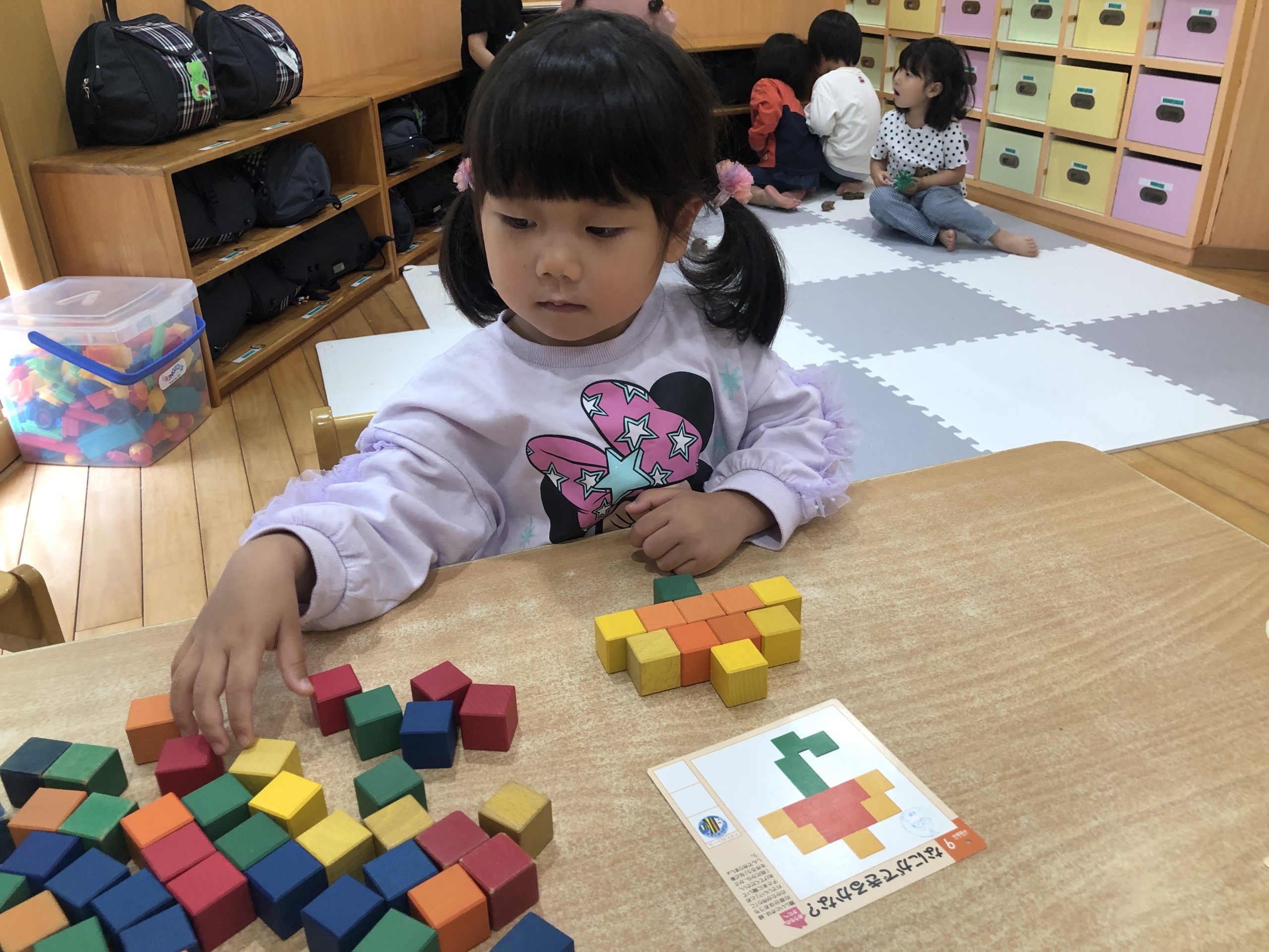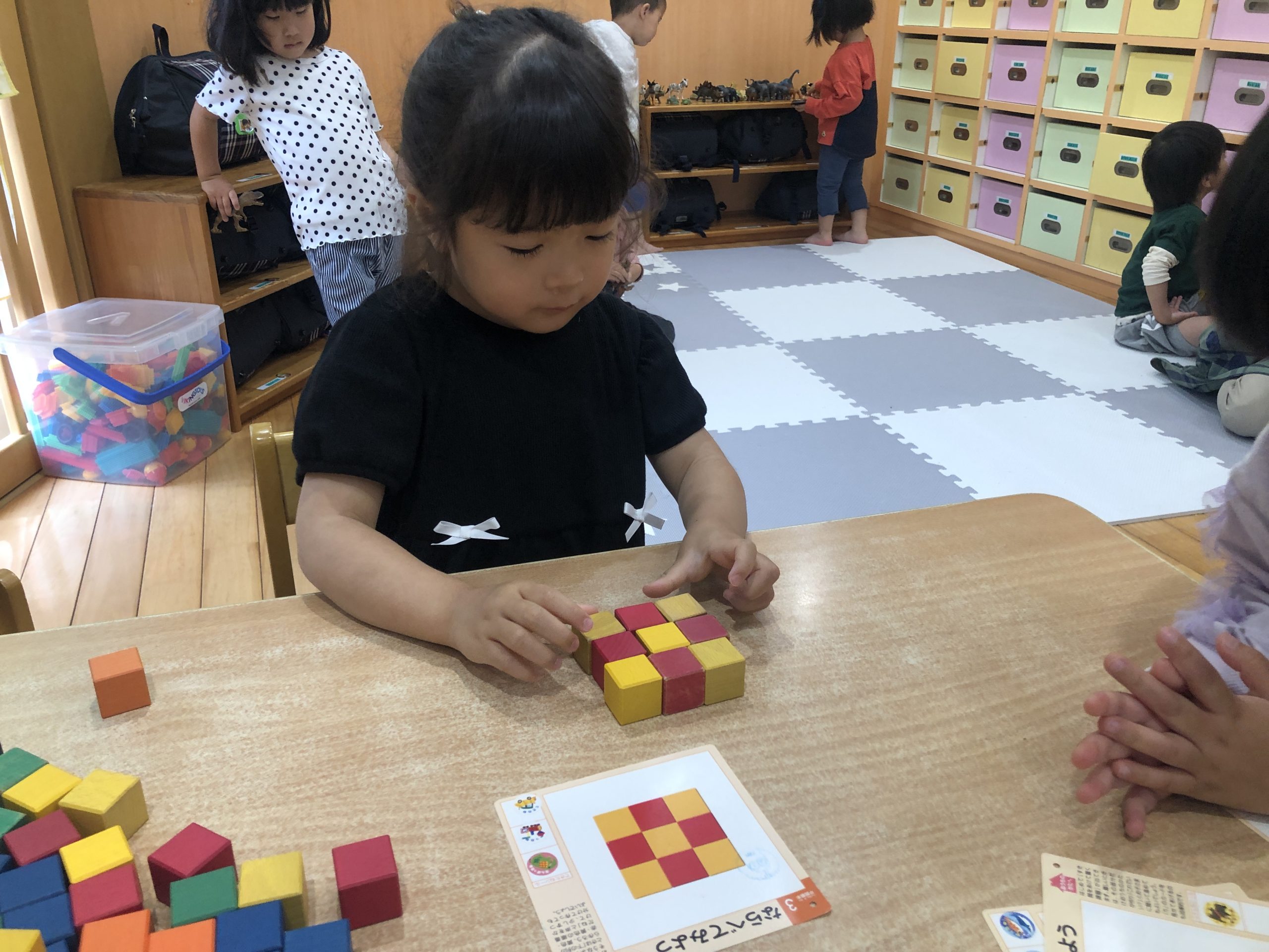 今日は、公文キューブをしました。見本の写真と同じ形になるように、ブロックの色を確認しながら組み立てました。写真と見比べながら、頑張って組み立てできるとうれしそうに「みてー😆」と教えてくれていました。
