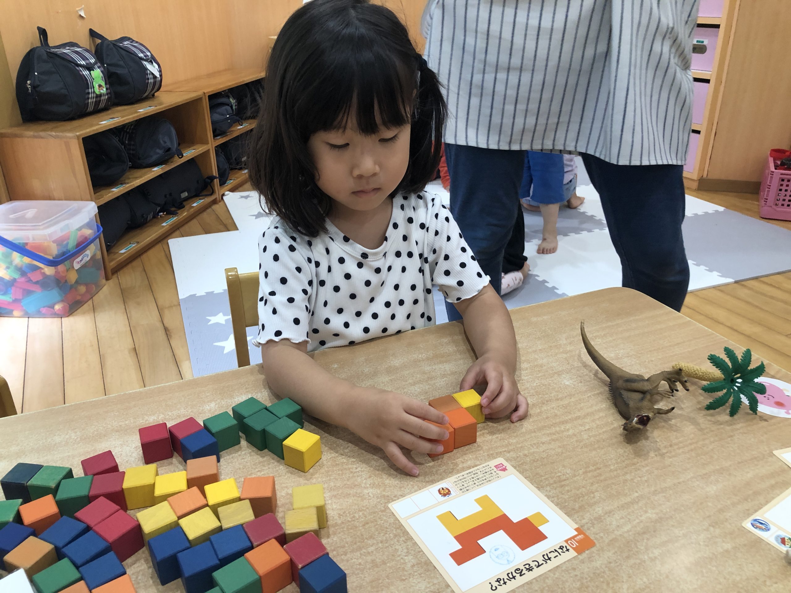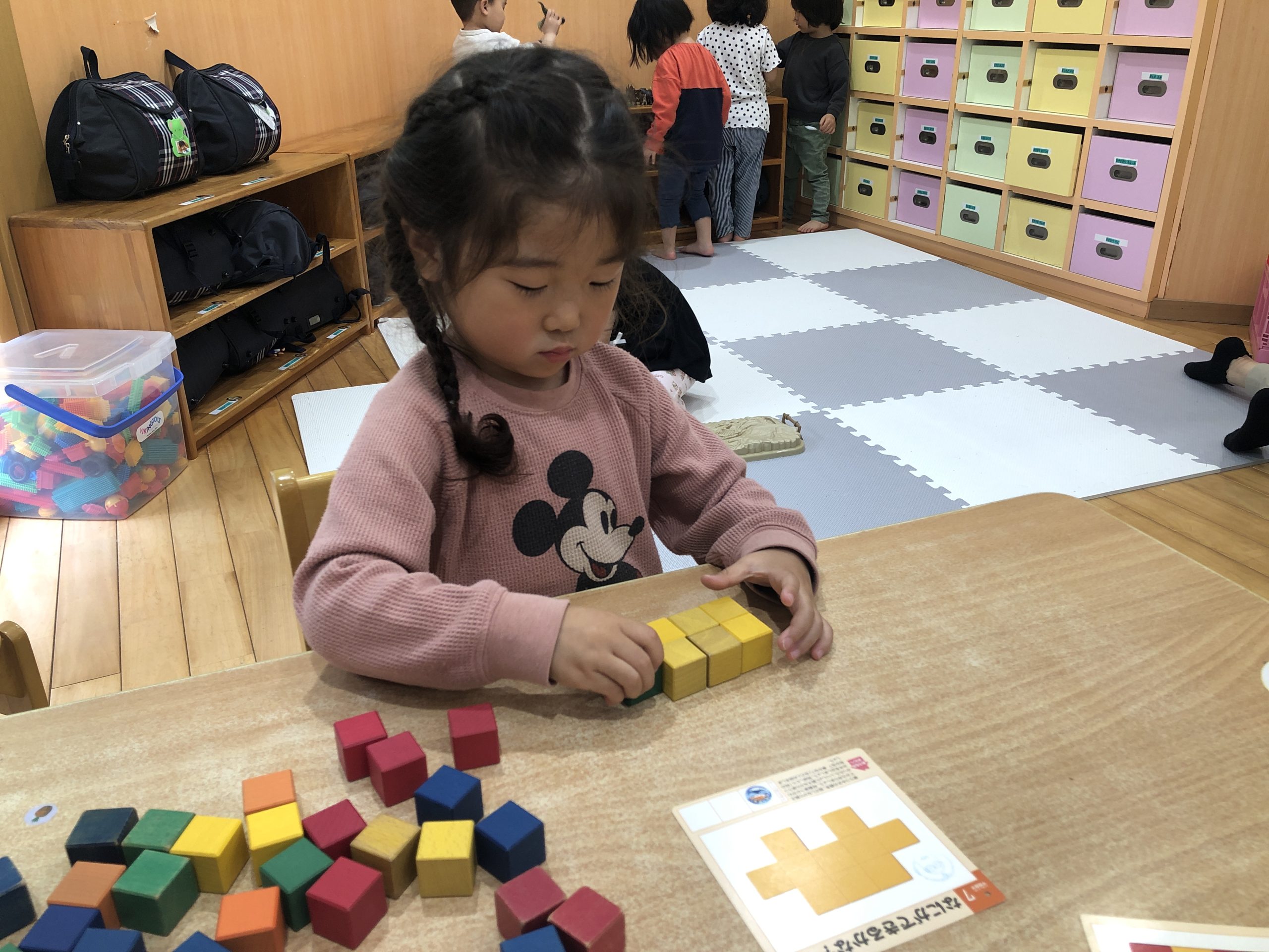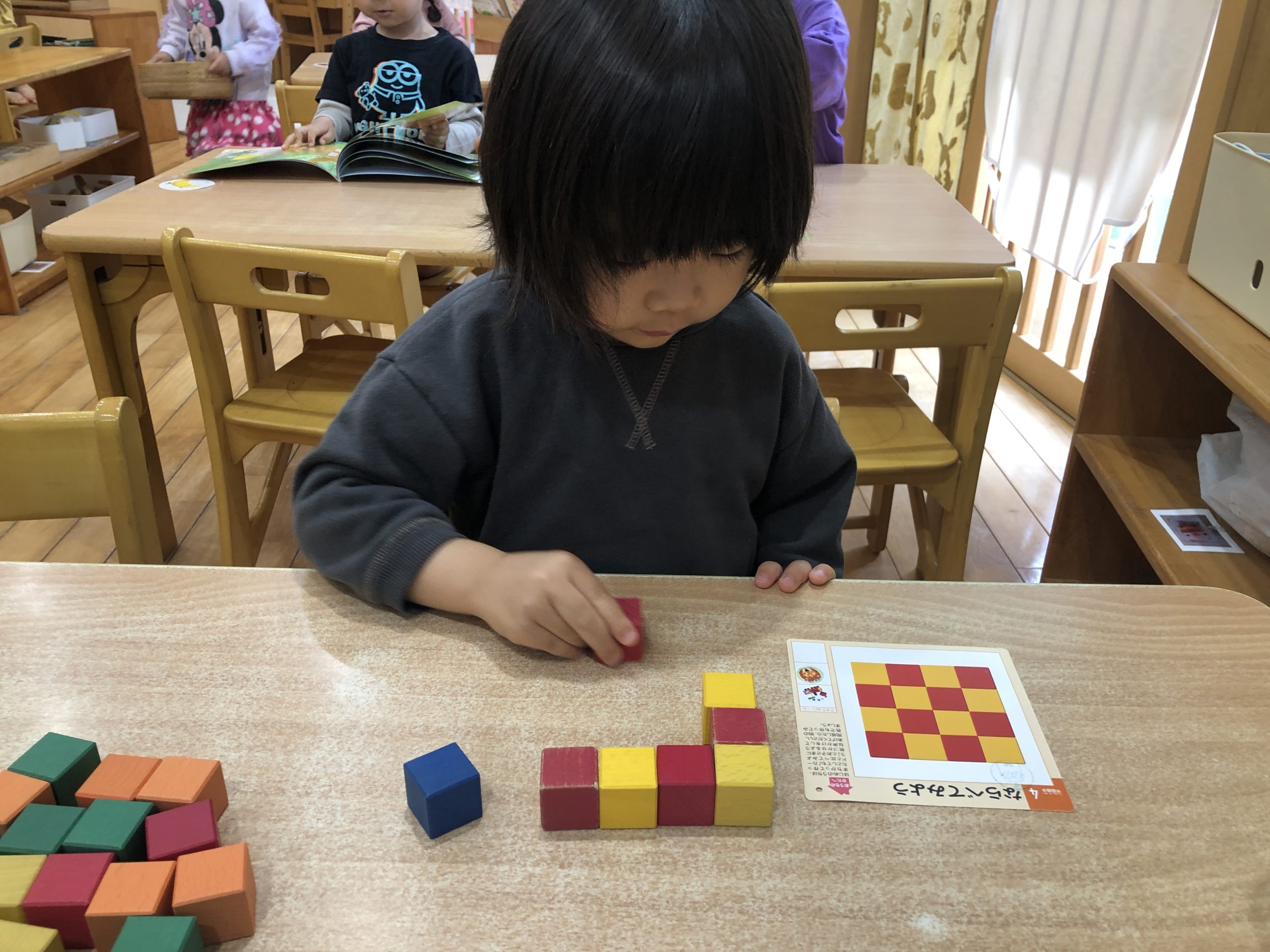 今日は、公文キューブをしました。見本の写真と同じ形になるように、ブロックの色を確認しながら組み立てました。写真と見比べながら、頑張って組み立てできるとうれしそうに「みてー😆」と教えてくれていました。