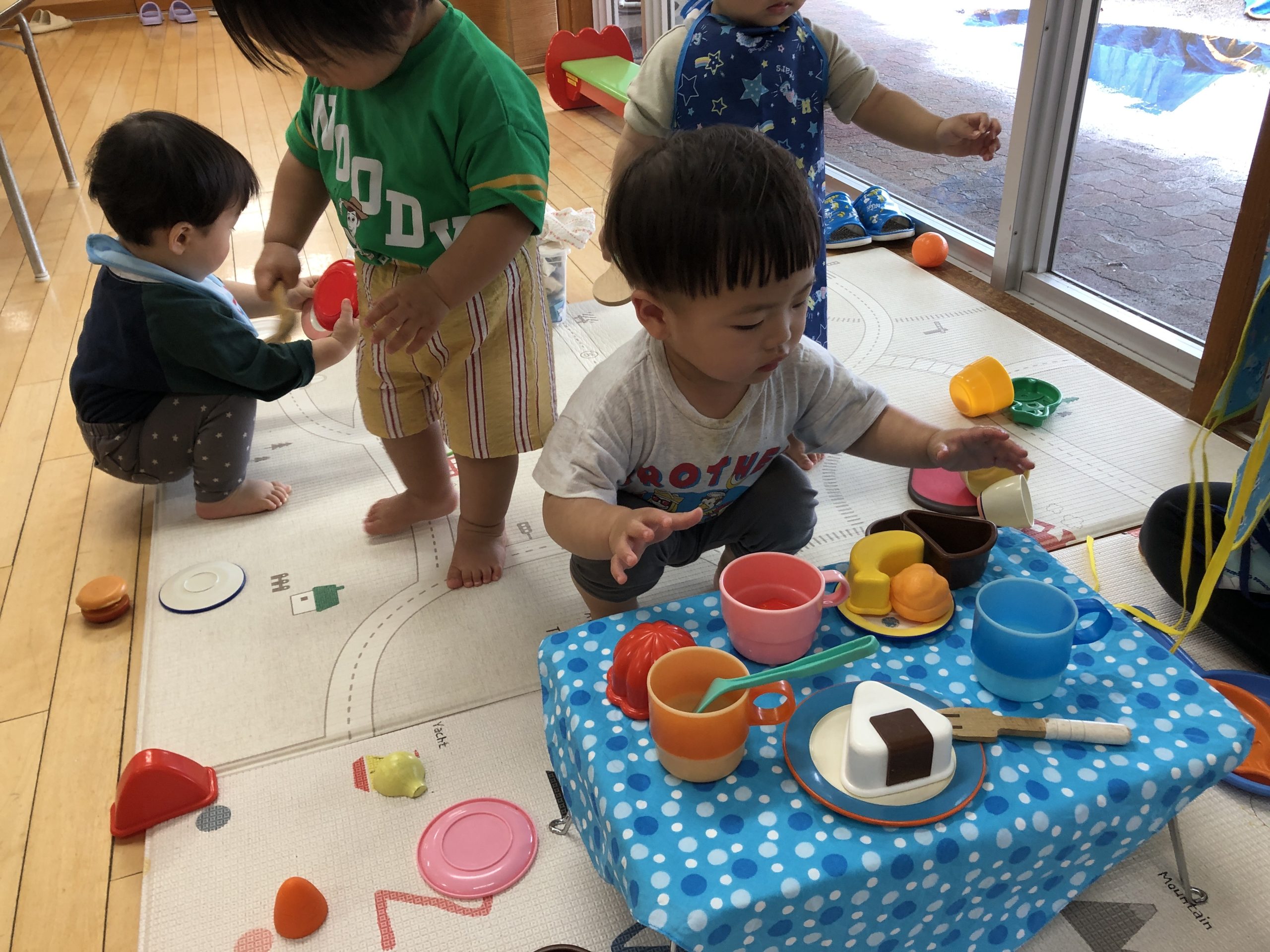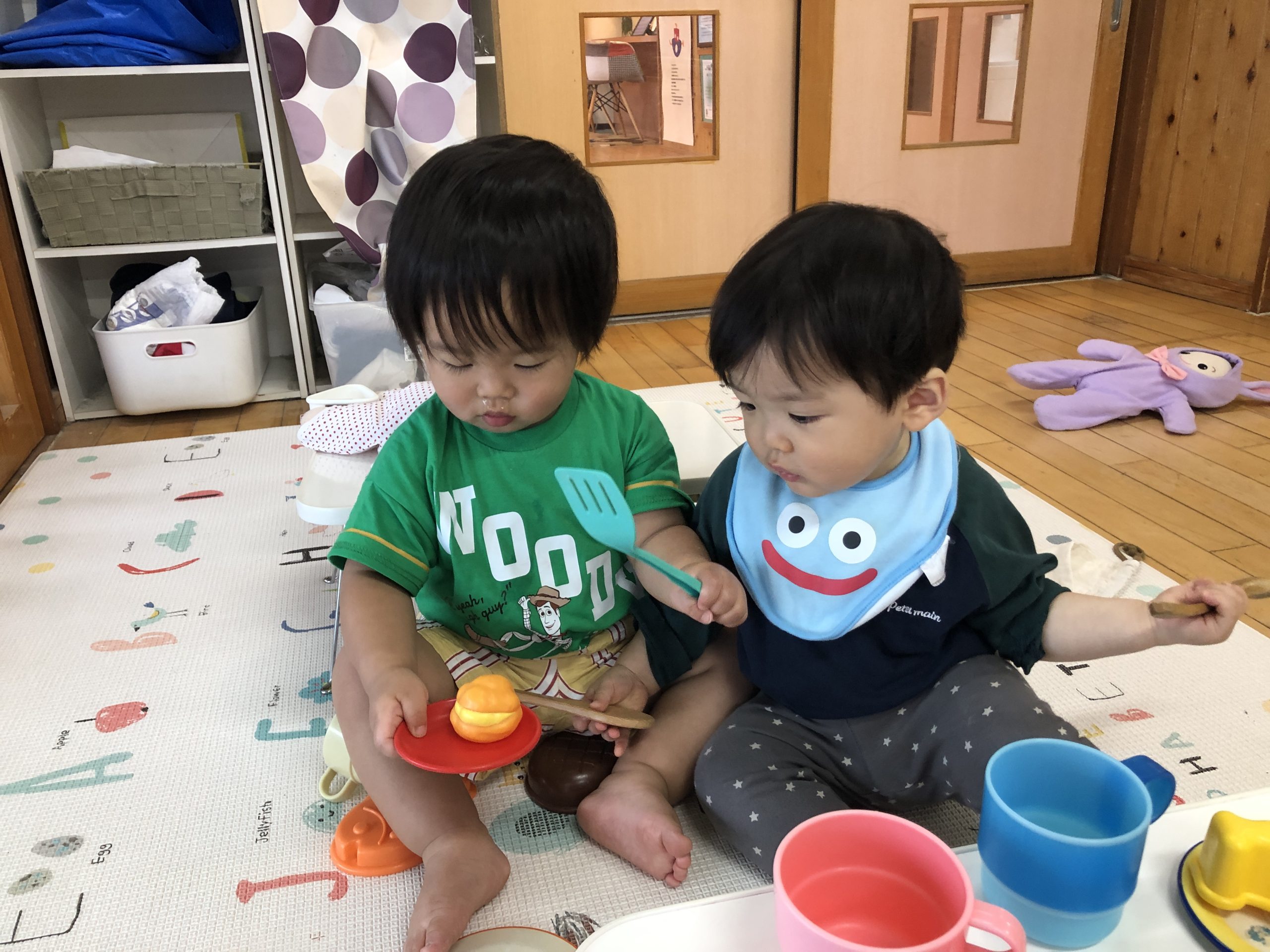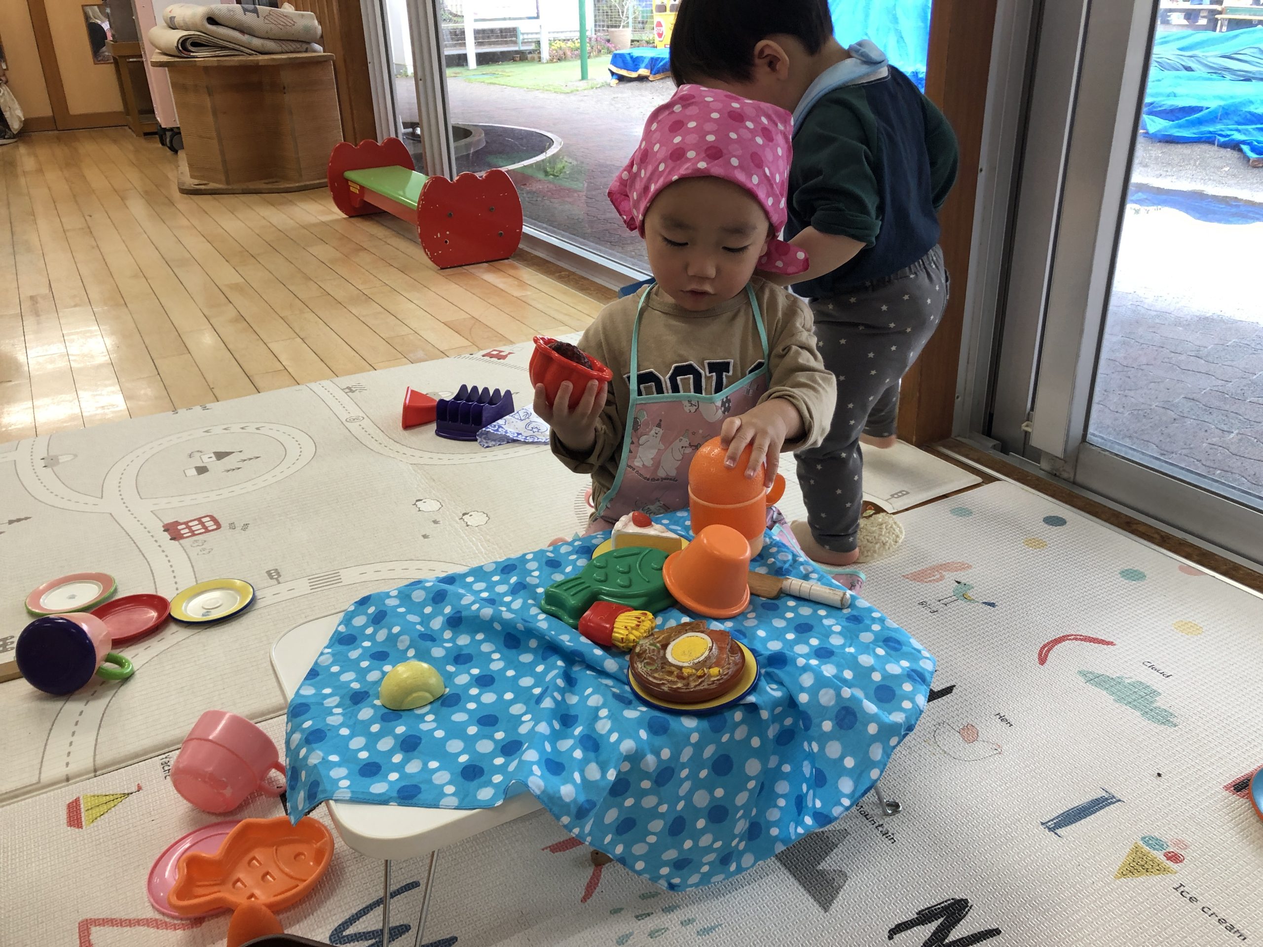今日はままごと遊びをしました。エプロンや三角巾を身につけて、ご飯を作ったり、赤ちゃん人形のお世話をしたりしました。