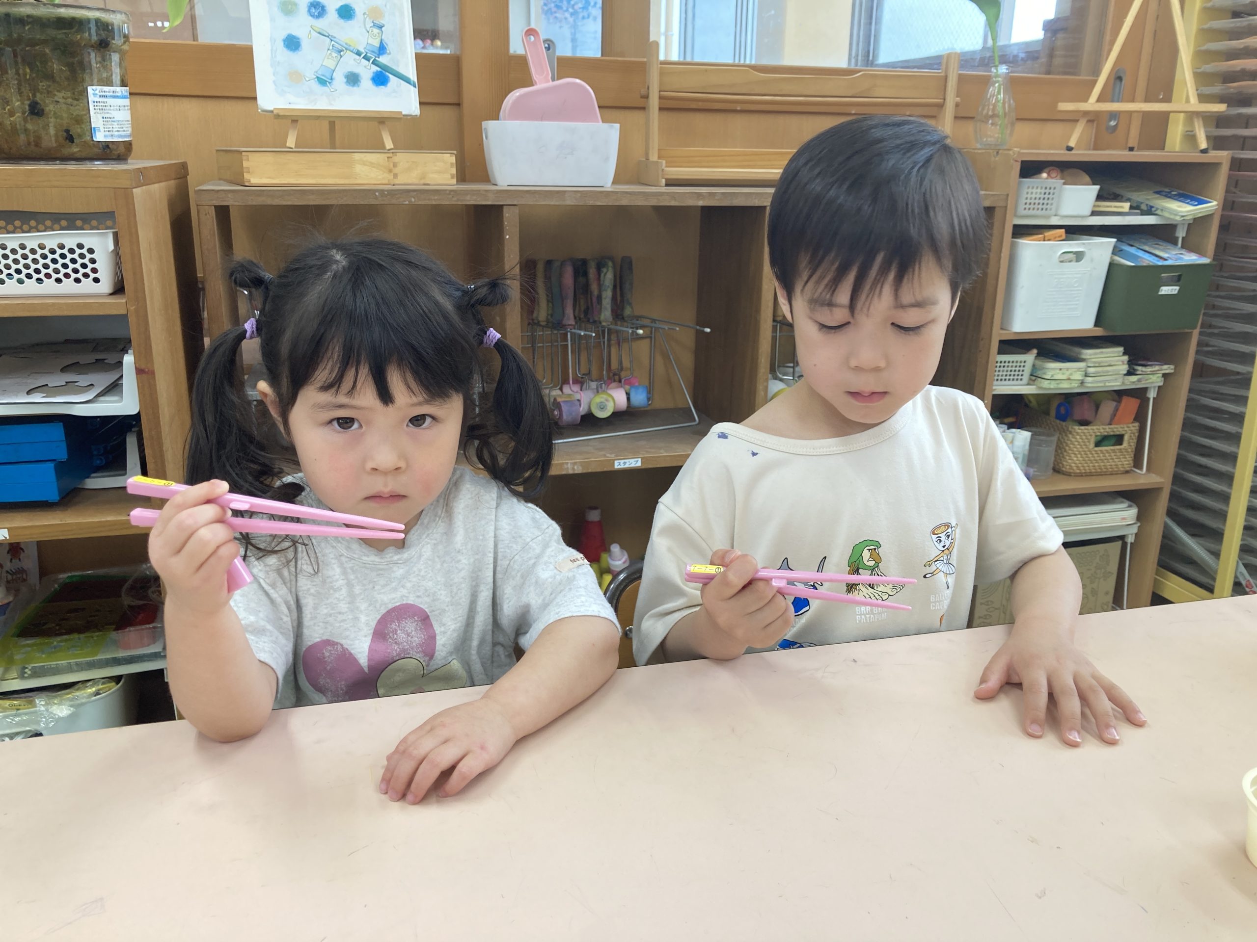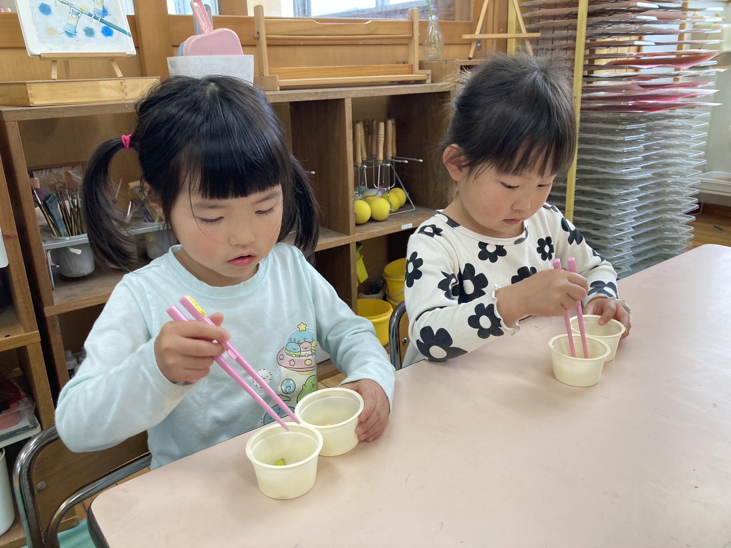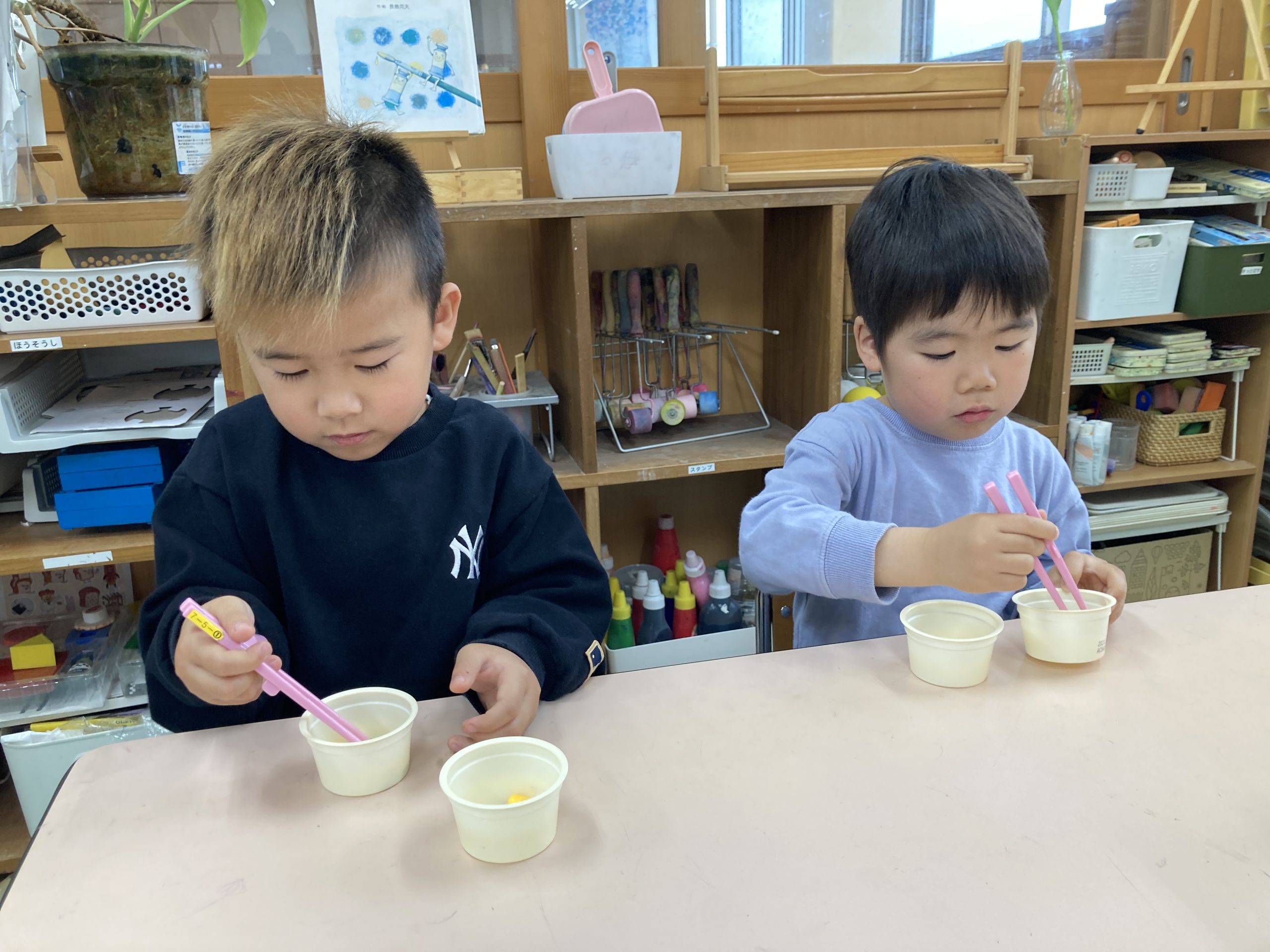今日はお部屋で『豆うつし』をしました。最初に正しいお箸の持ち方を確認してから、箸を使って豆をうつす練習をしました。すべってしまい、なかなかつかめない様子も見られましたが、くりかえし練習するとコツをつかんでいました✨