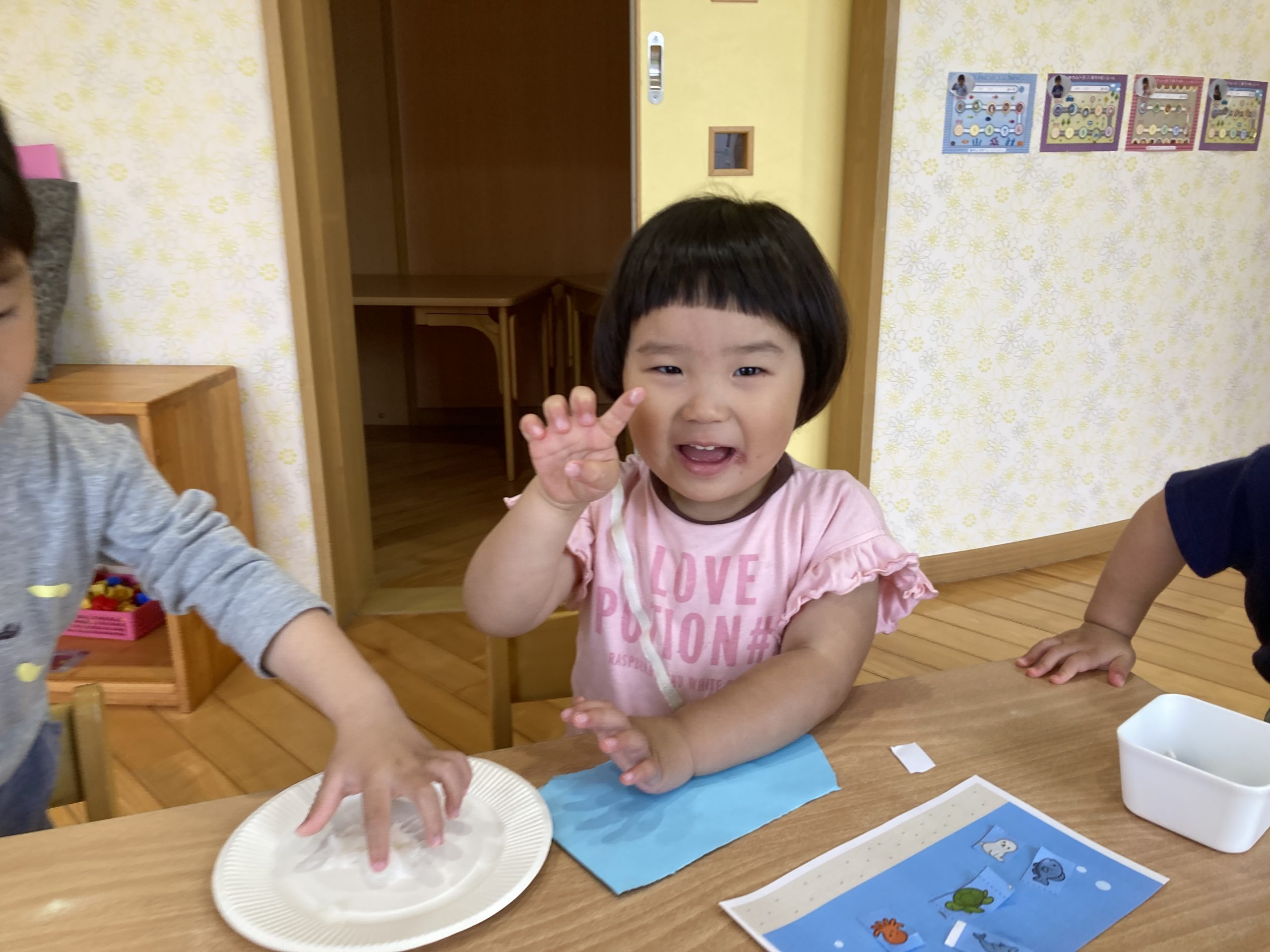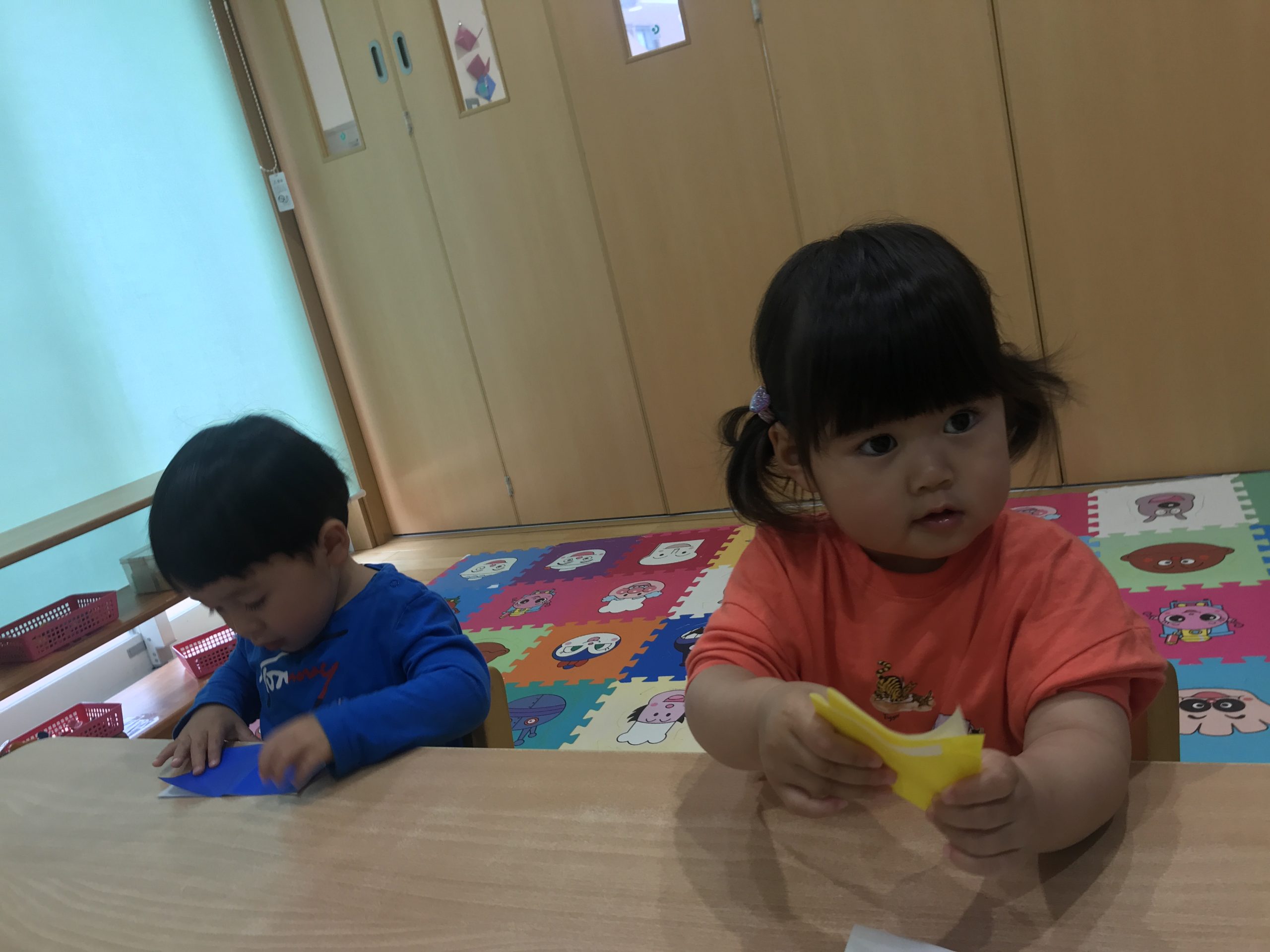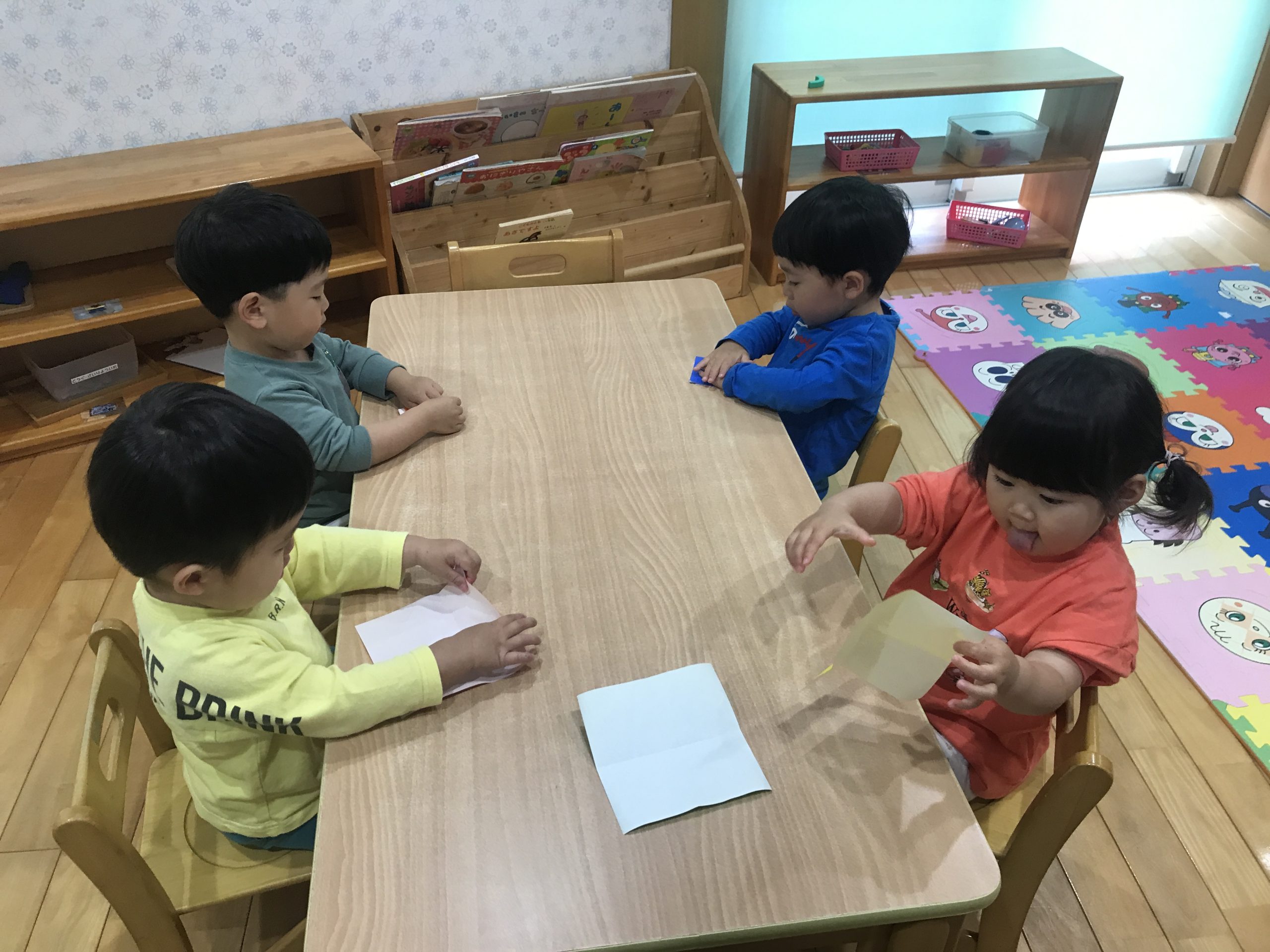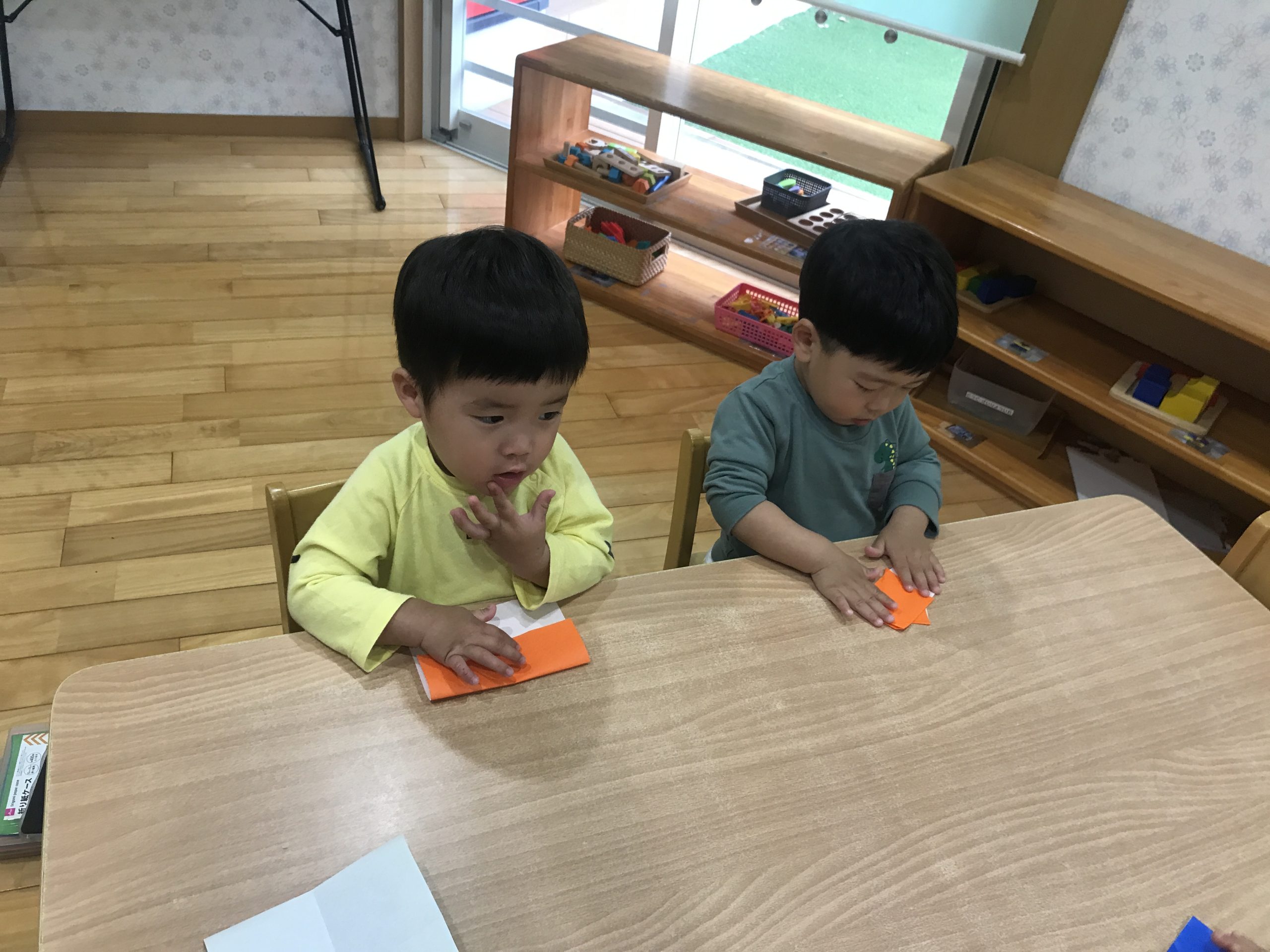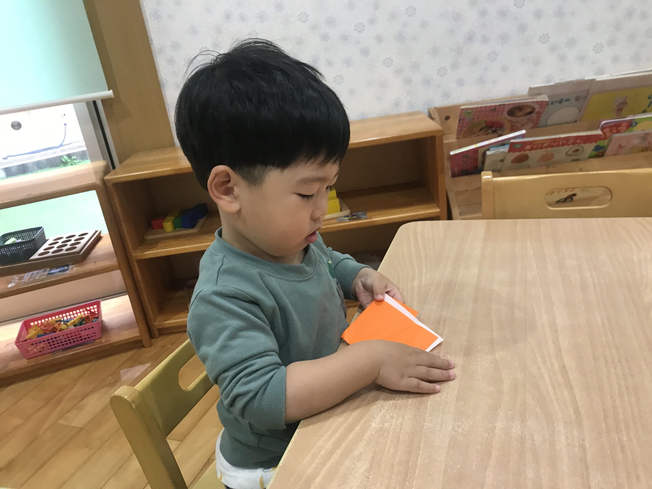 今日は、折り紙をしました♪端と端を合わせて集中して取り組んでいましたよ✨