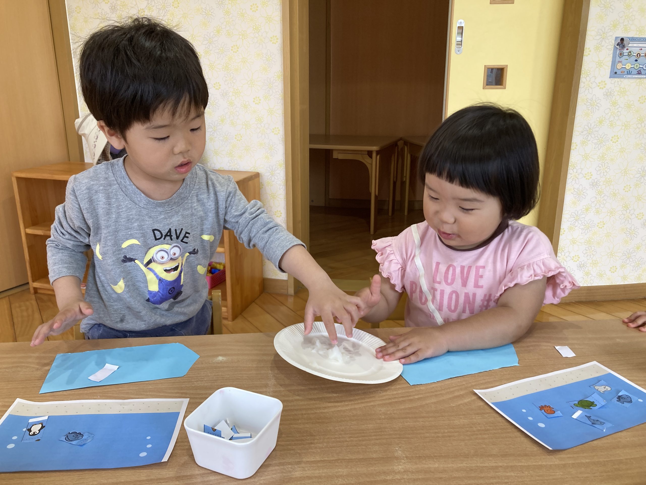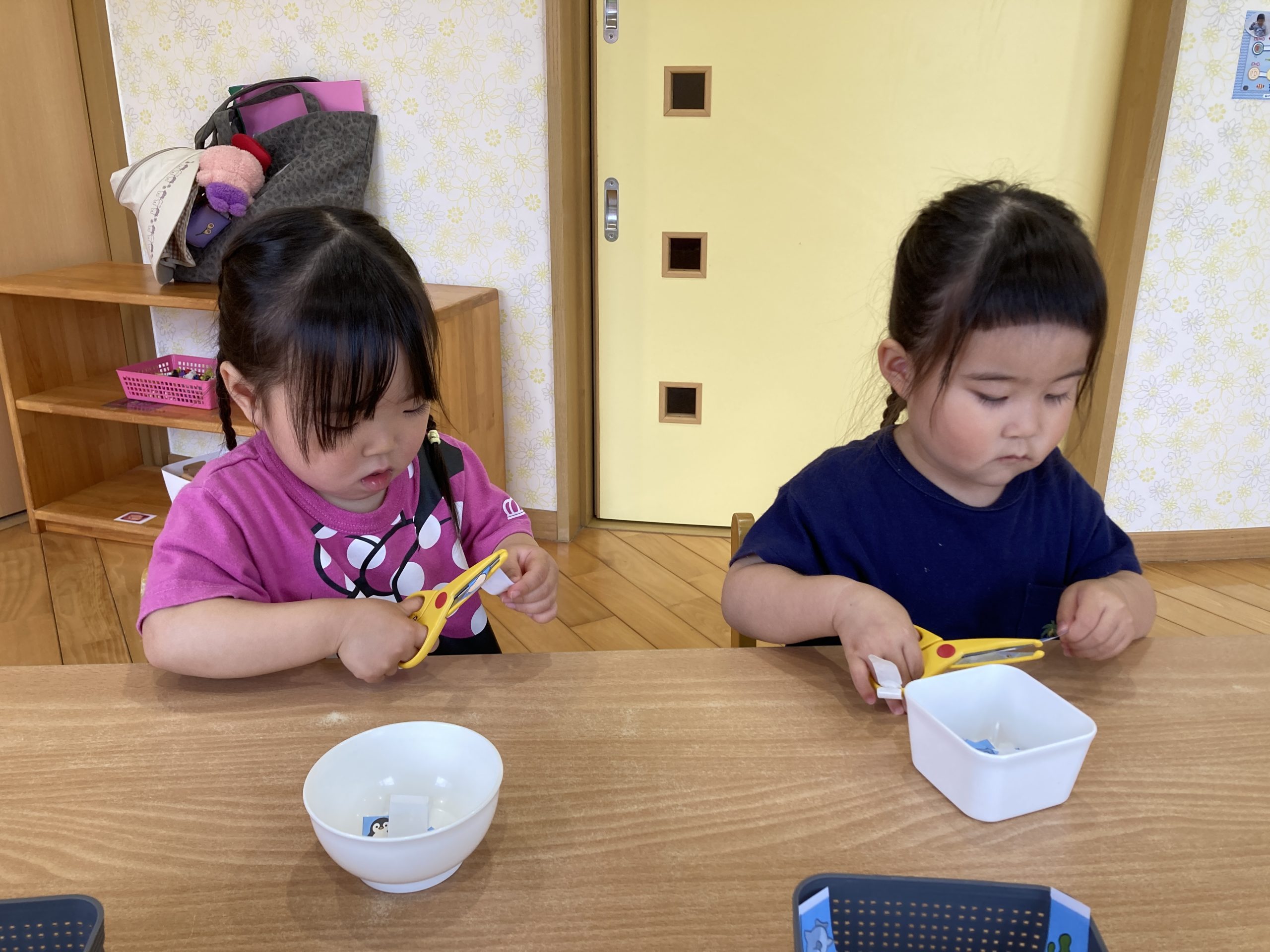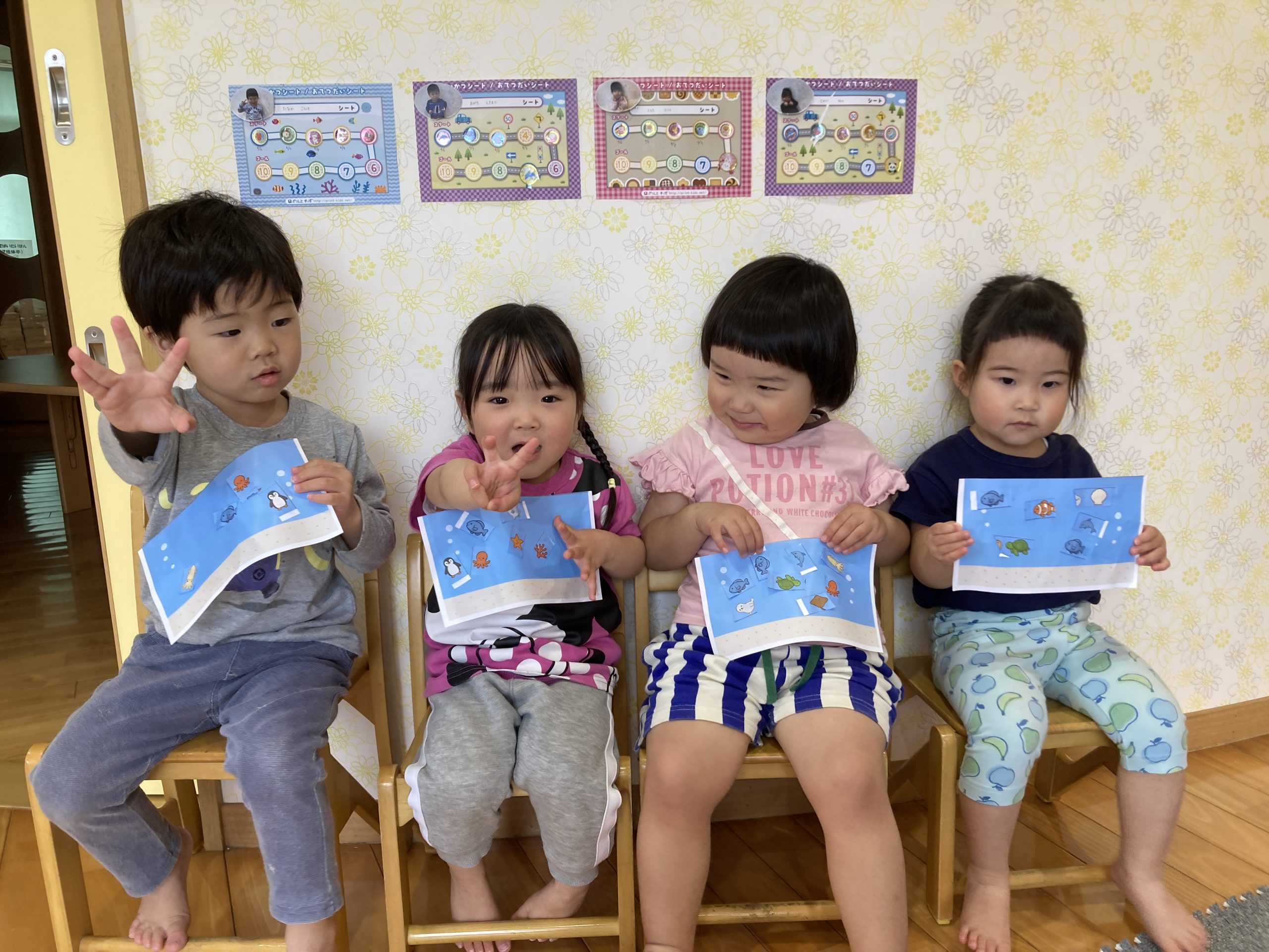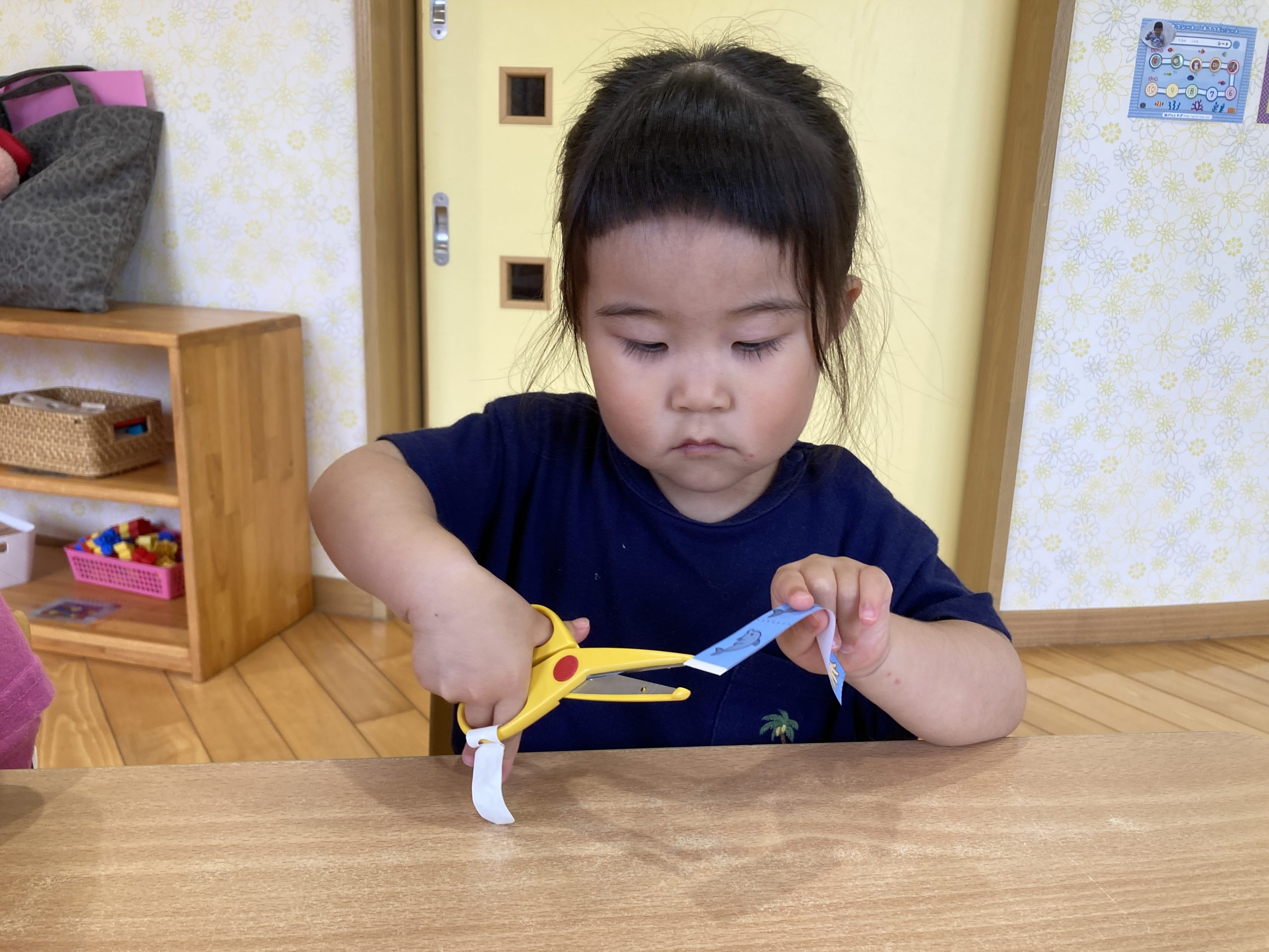 今日は、はさみの練習をしました✂️上手にはさみを握りながら集中して1回切りに取り組んでいましたよ⭐️切った魚たちをのりで貼りながら泳がせていました〜🐠