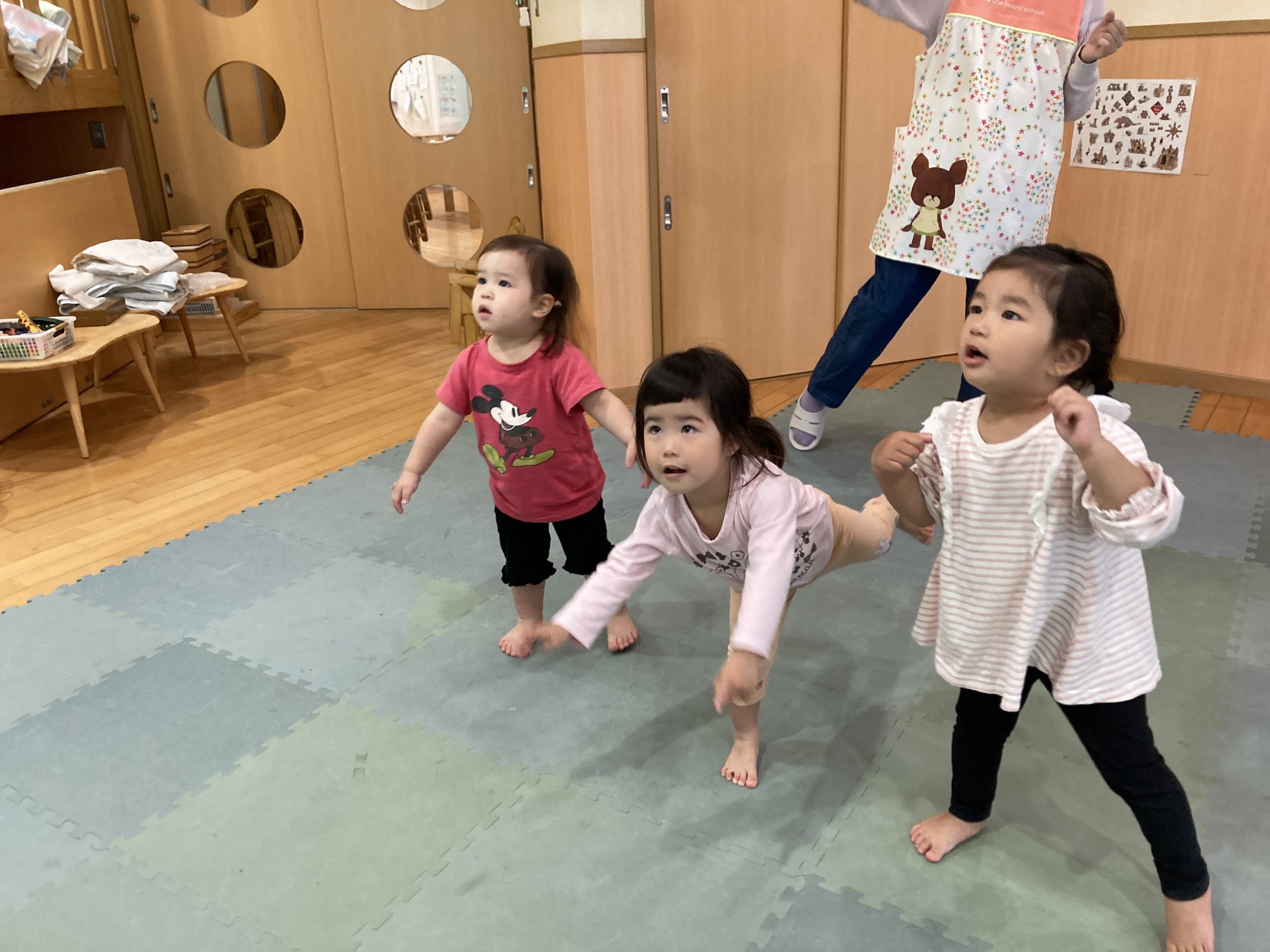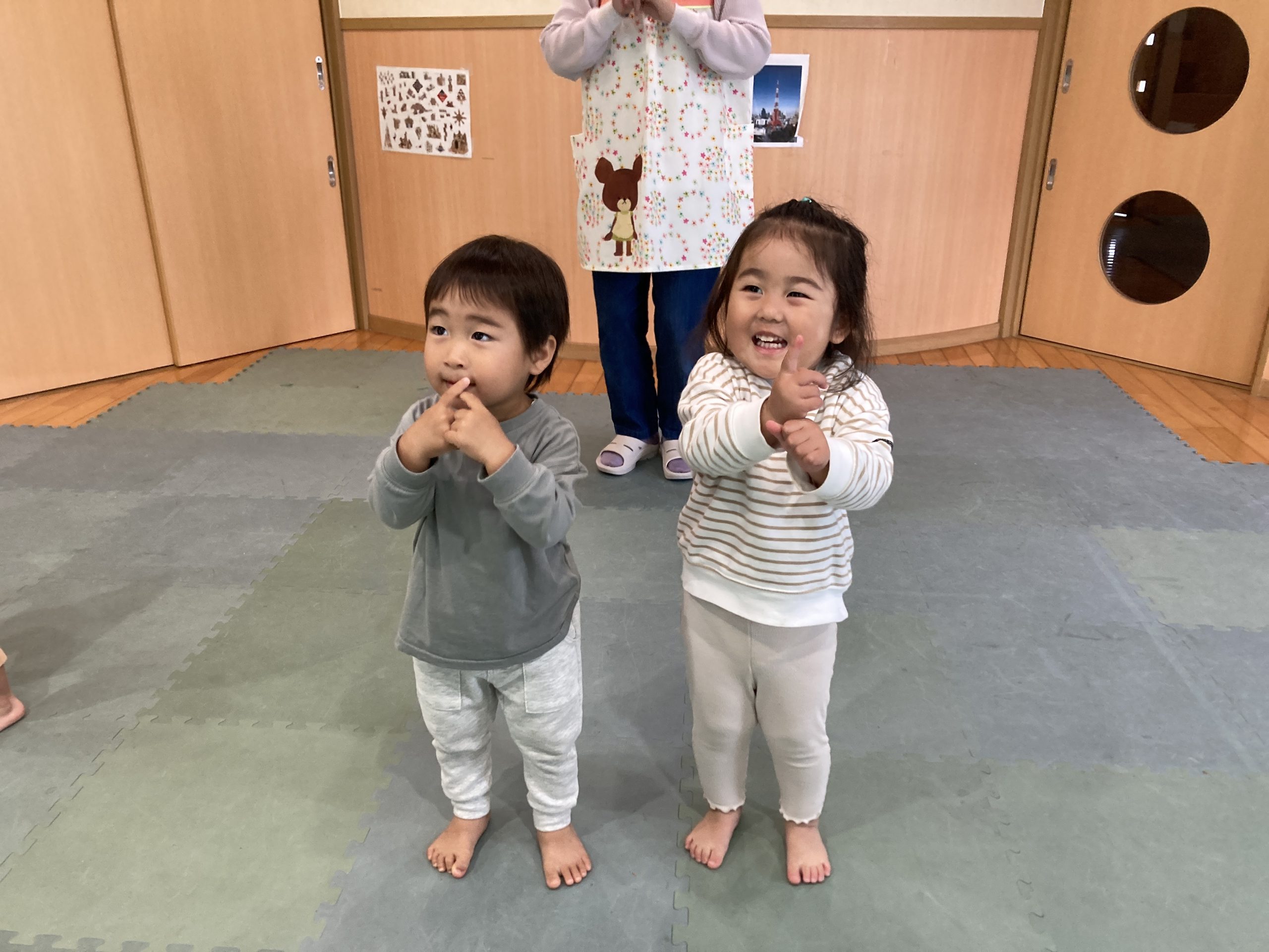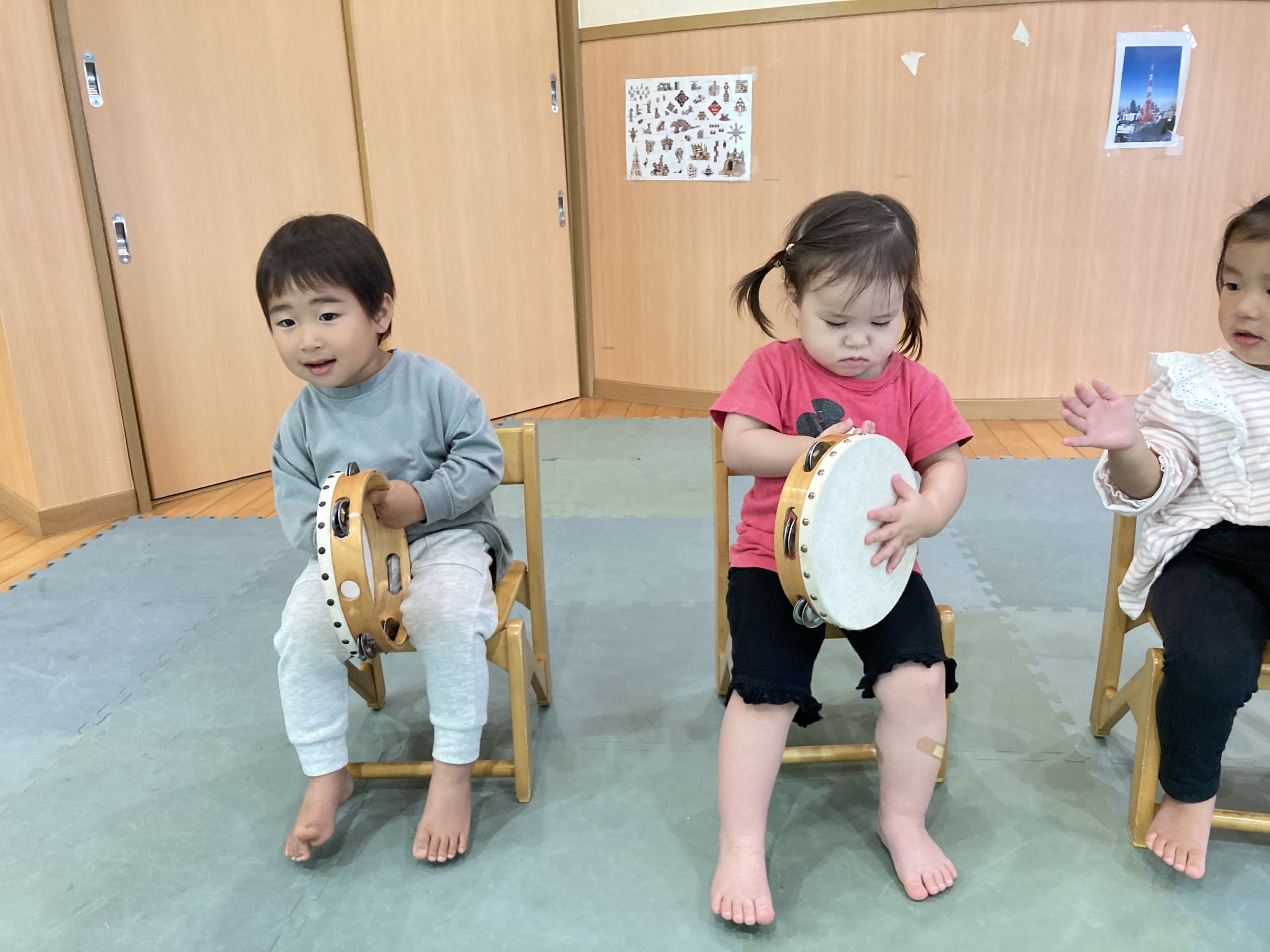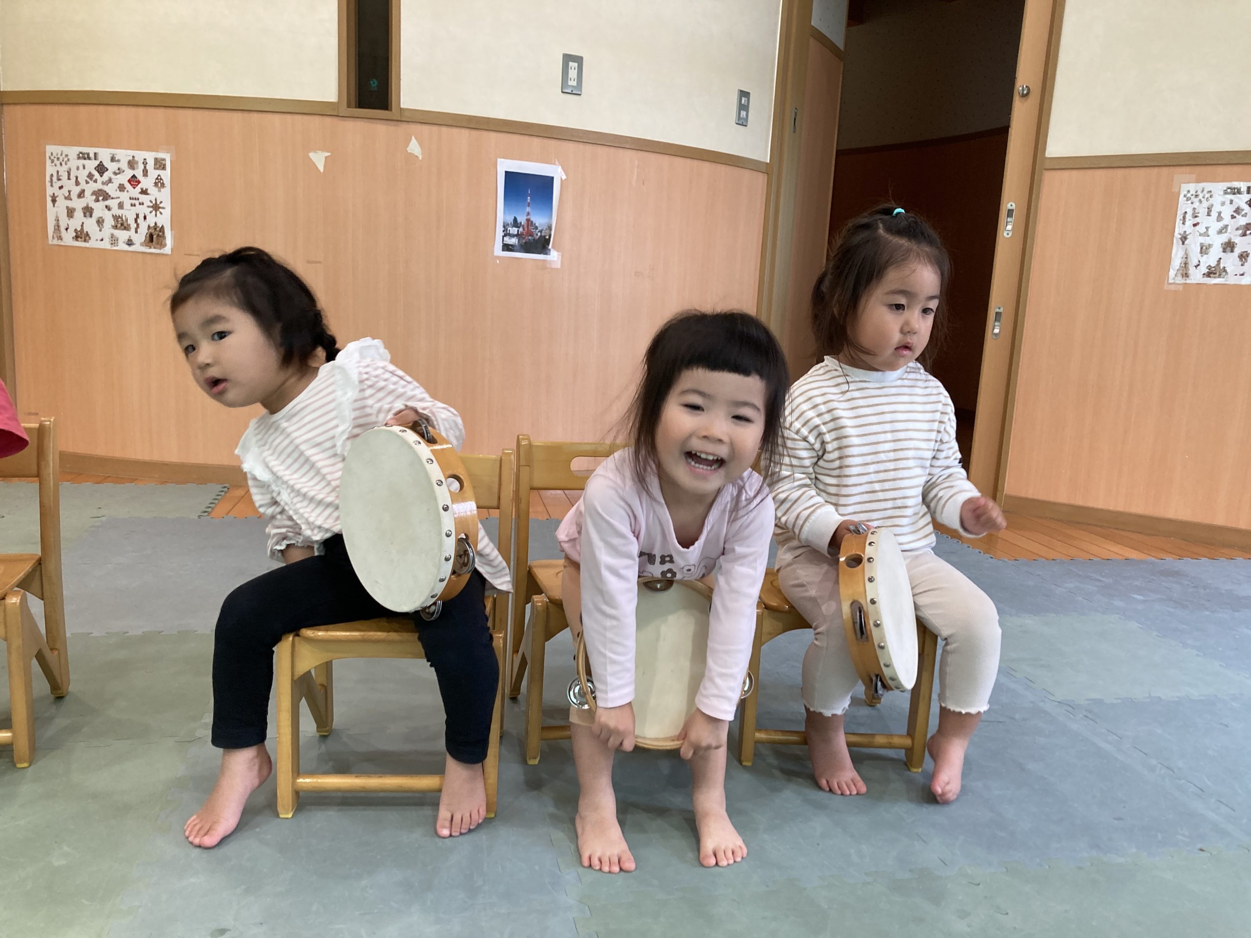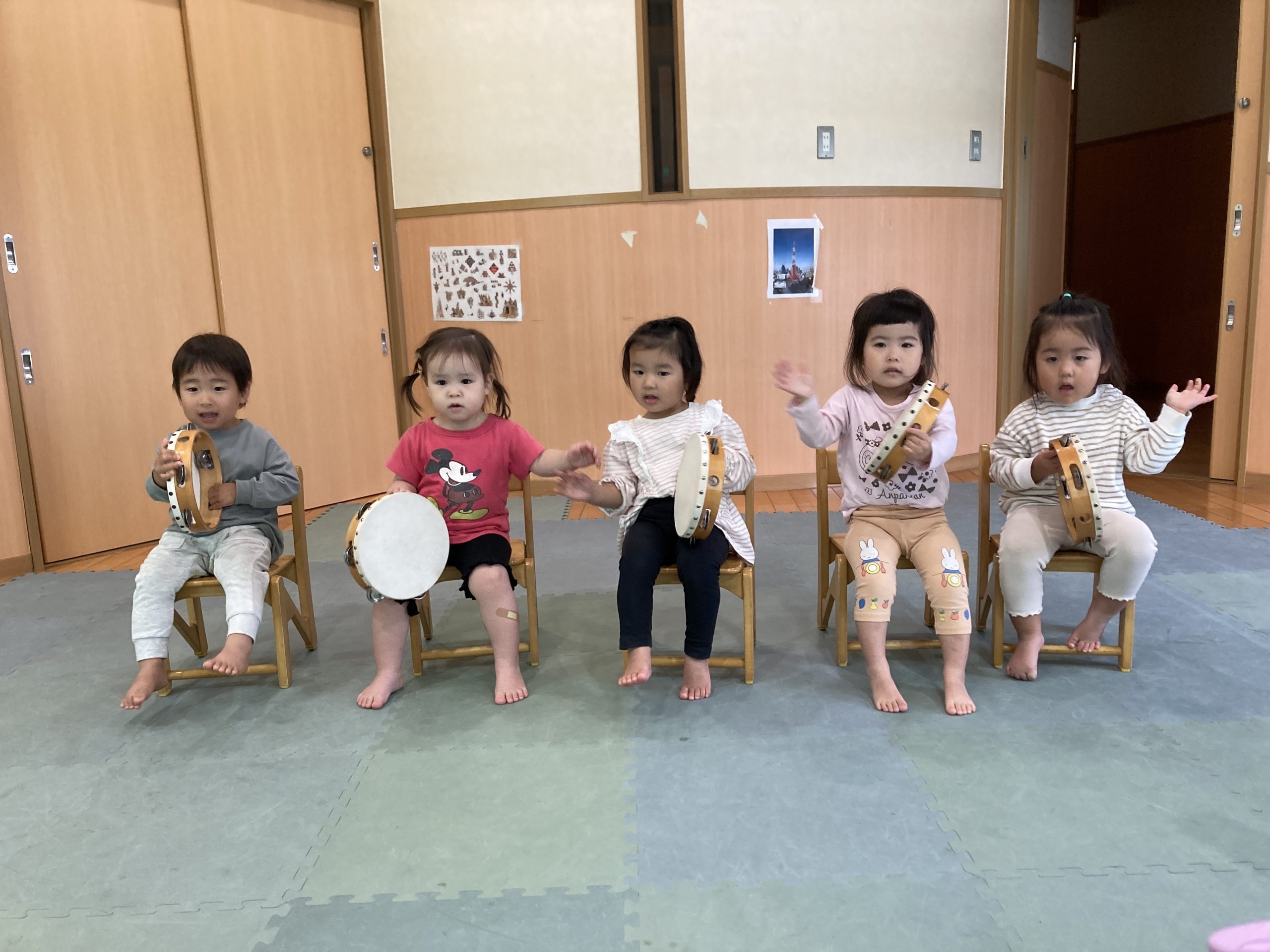 今日は、楽器遊びをしました!音楽に合わせてタンバリンを上手に叩くことができました😊後半はダンスを踊りました♪運動会のダンスなど、お友だちと楽しくノリノリで踊っていましたよ💕