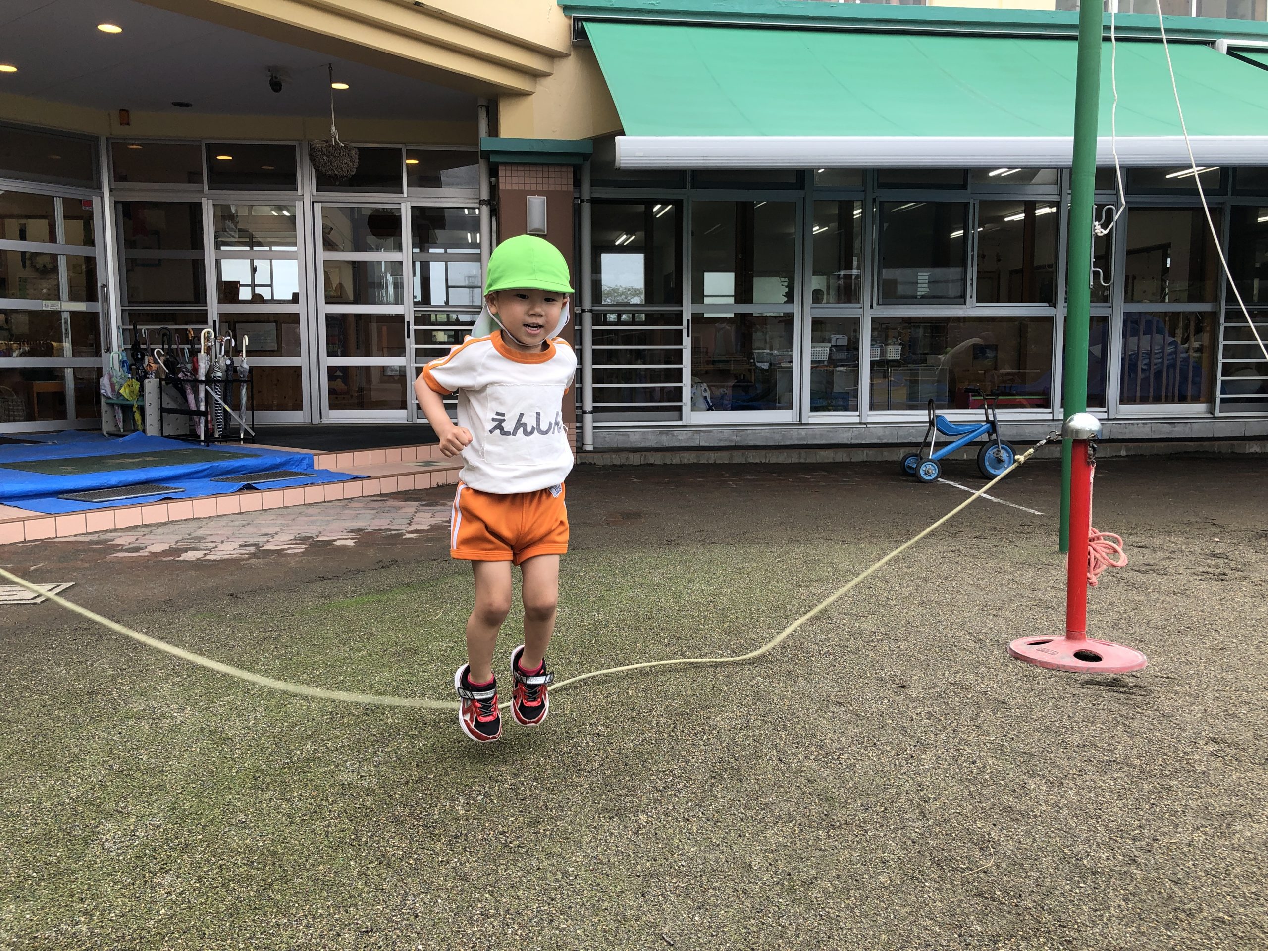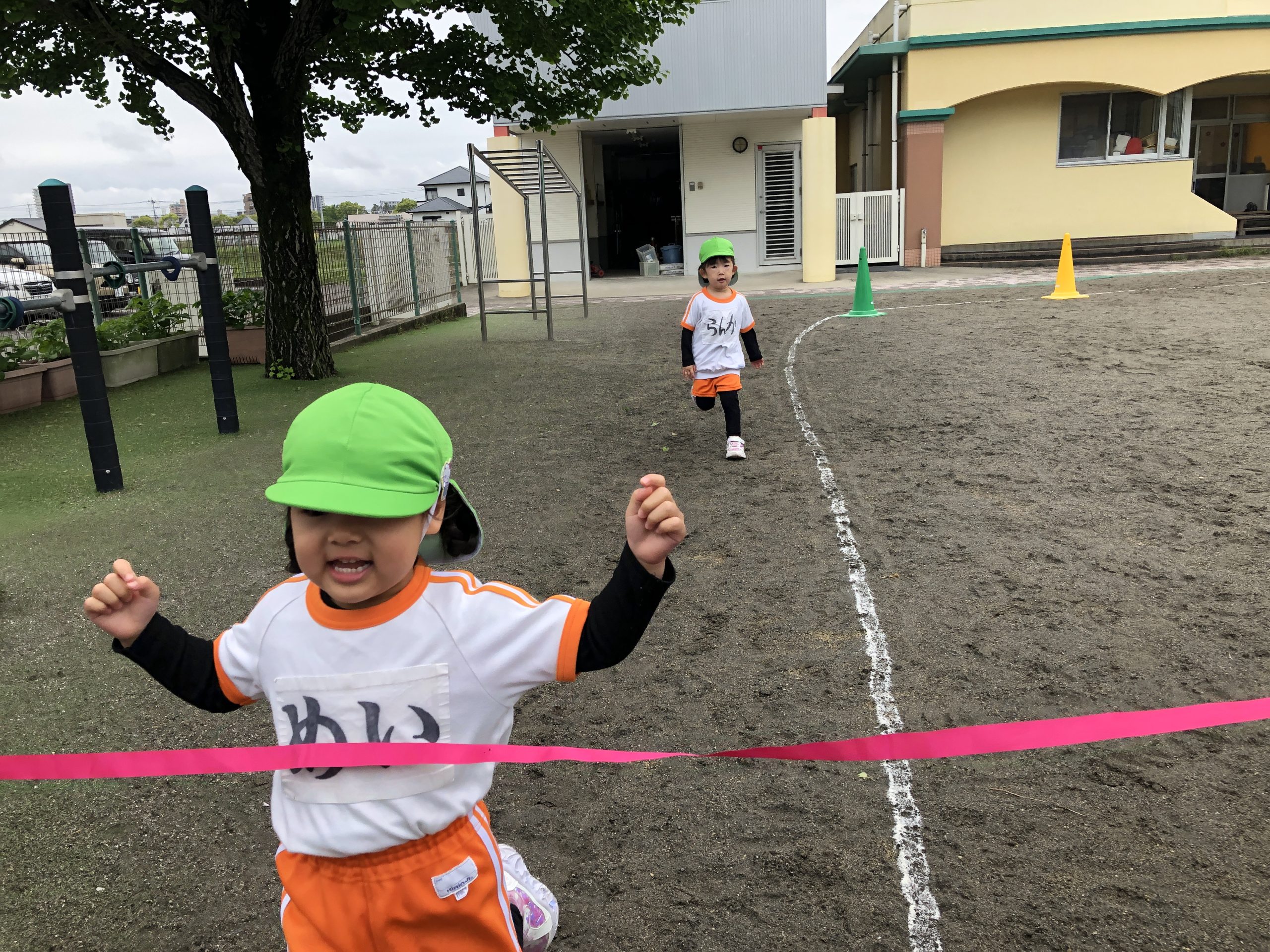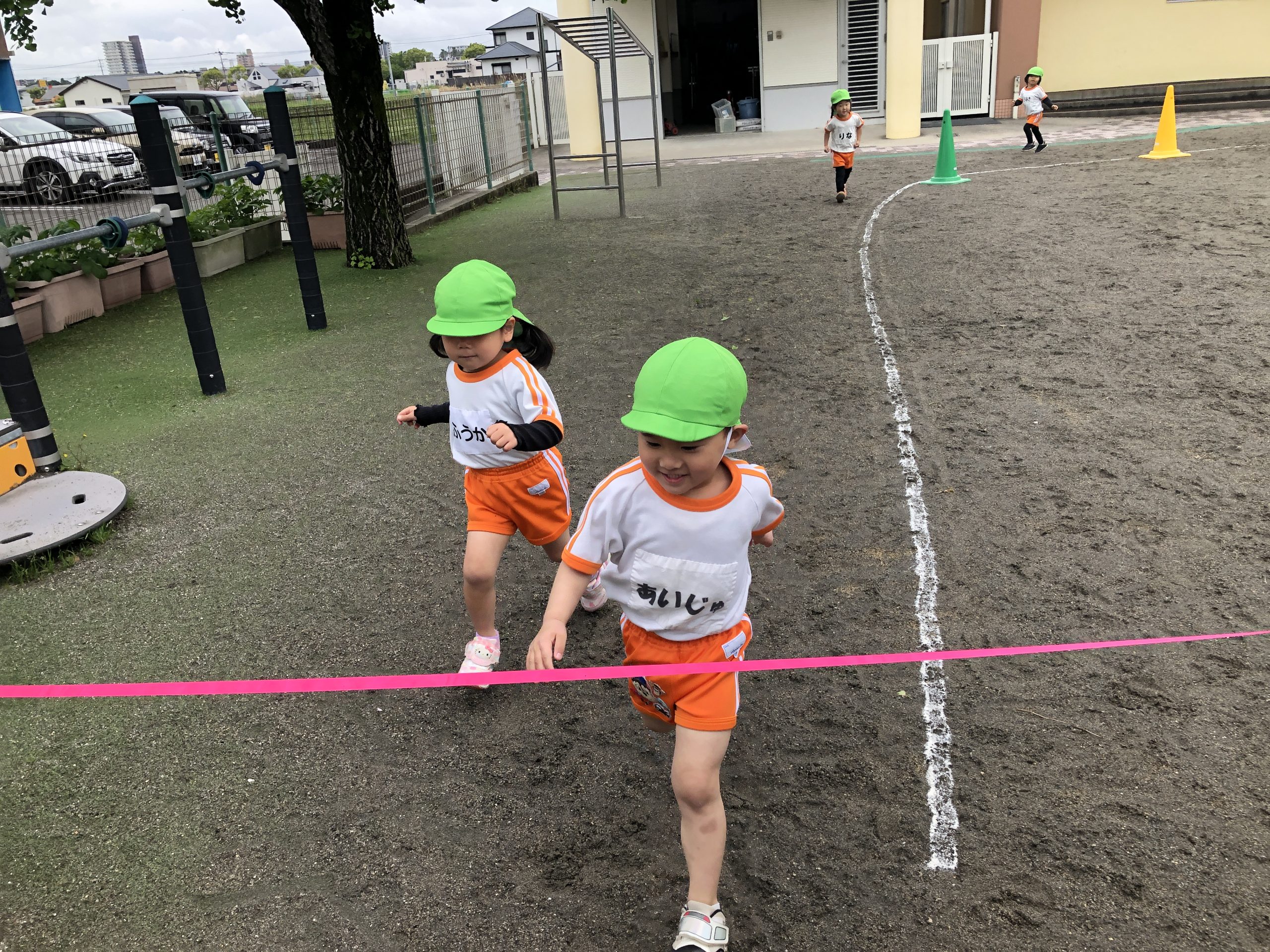 今日は、体育遊びに参加しました。かけっこでは、名前を呼ぶと元気良く返事をしてゴールまで走っていました。抜かされると泣いてしまうお友だちもいましたが何度か挑戦すると走れるようになっていました。