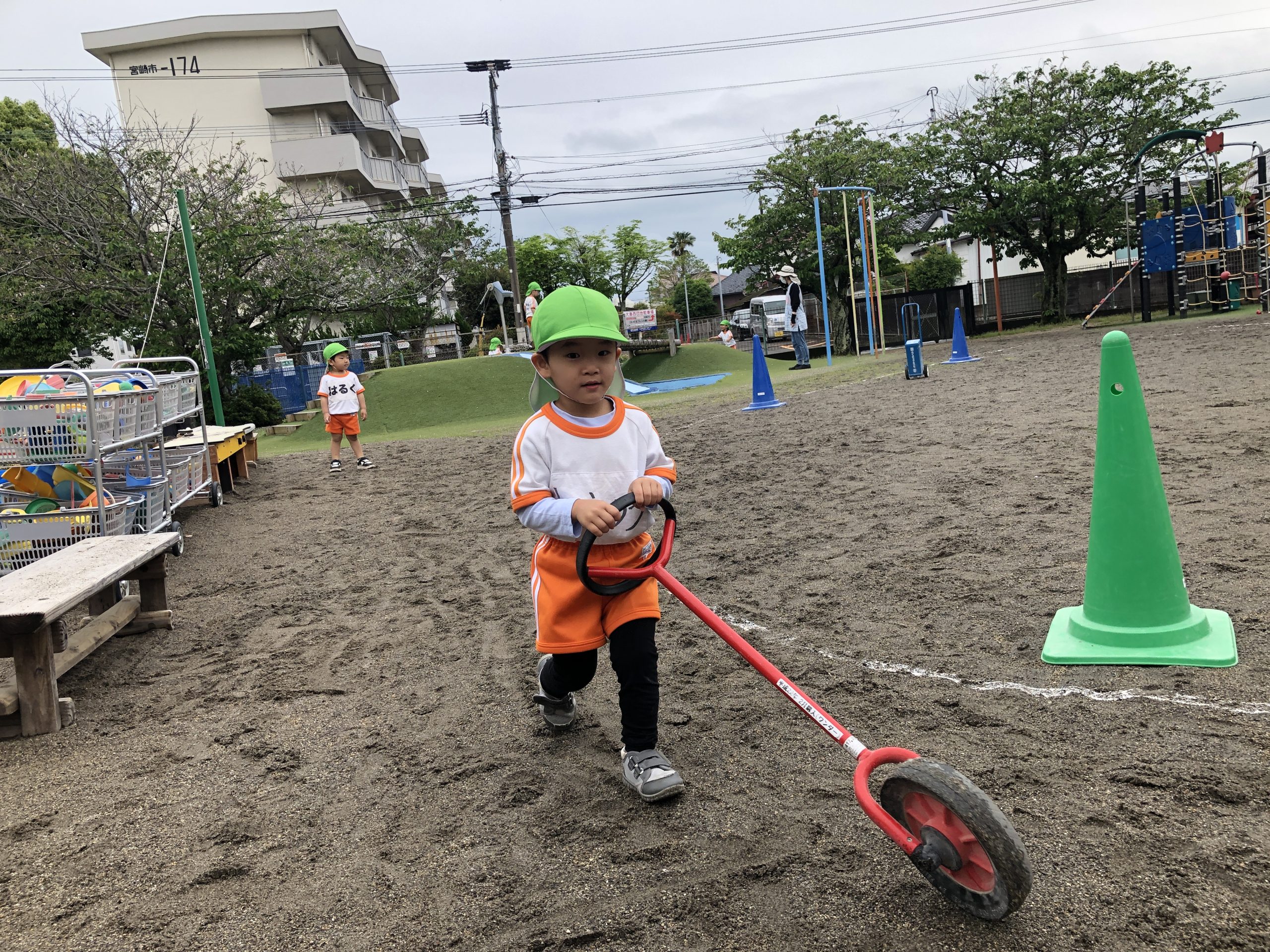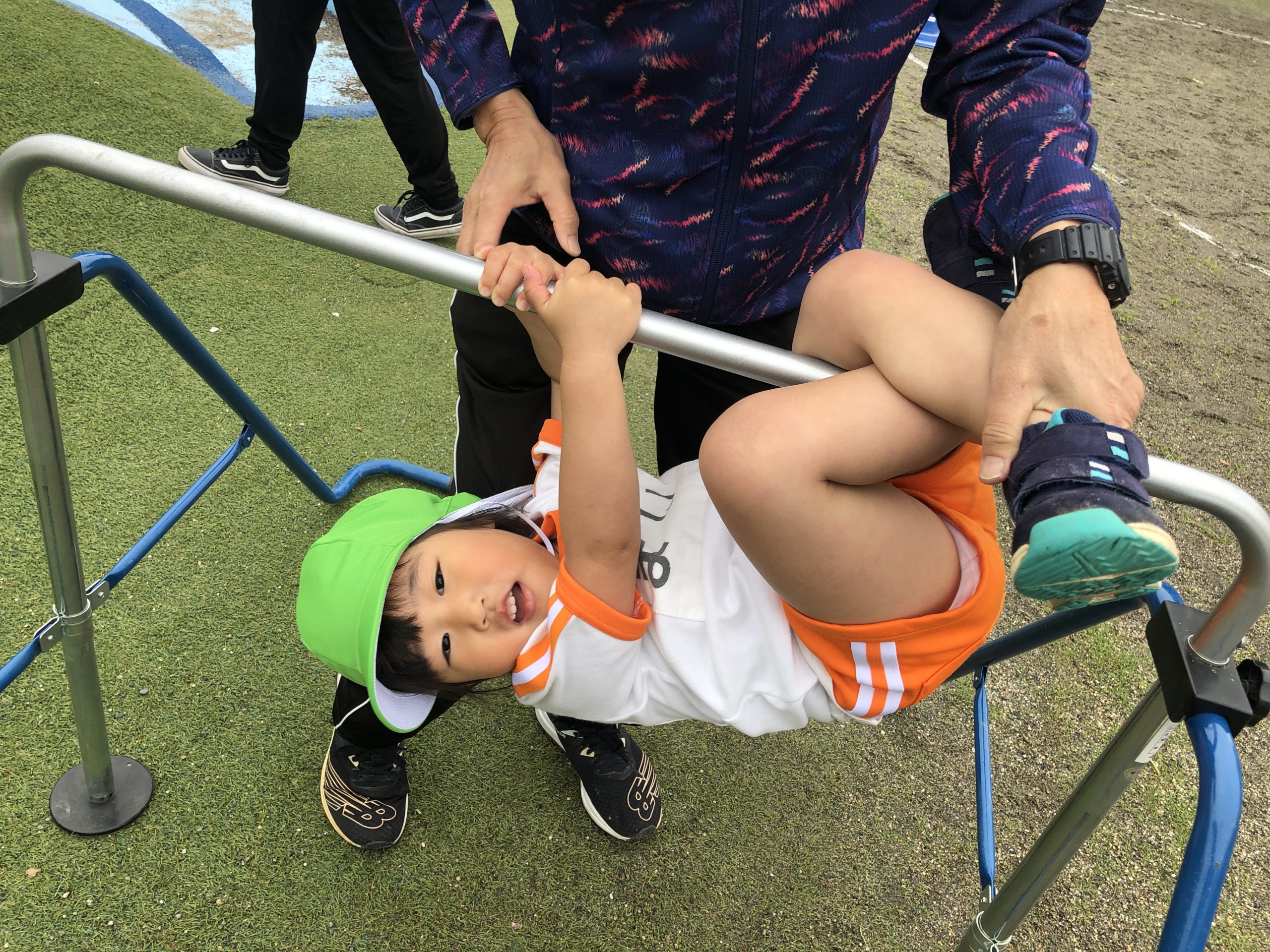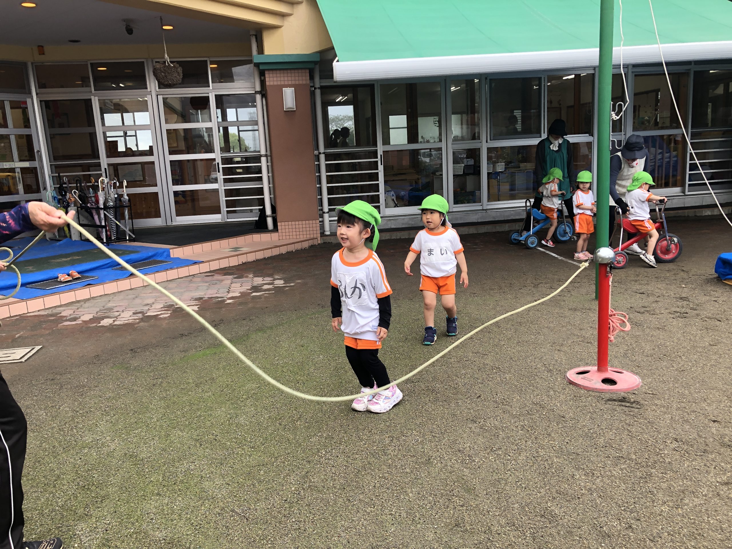 今日は、体育遊びに参加しました。かけっこでは、名前を呼ぶと元気良く返事をしてゴールまで走っていました。抜かされると泣いてしまうお友だちもいましたが何度か挑戦すると走れるようになっていました。