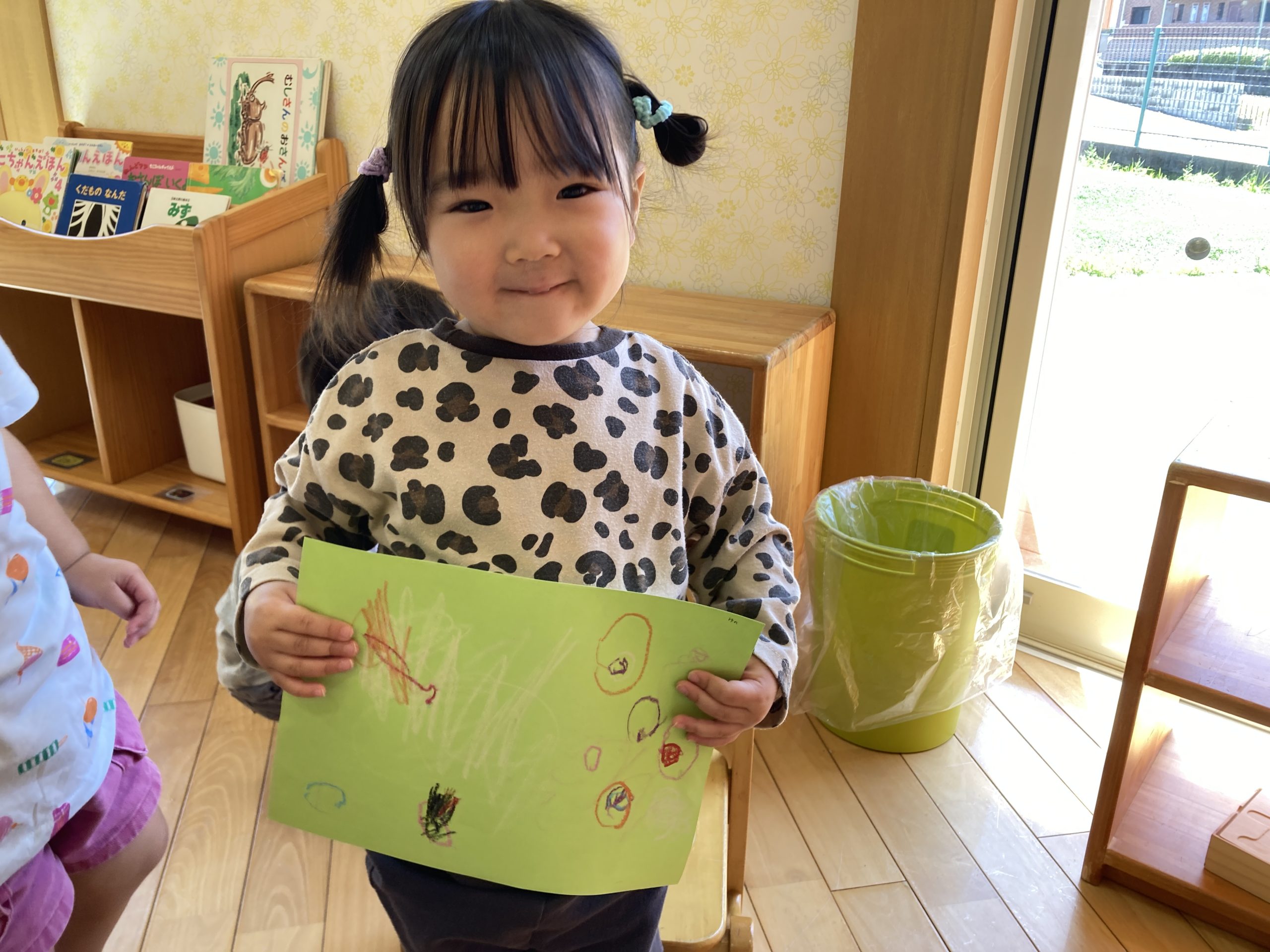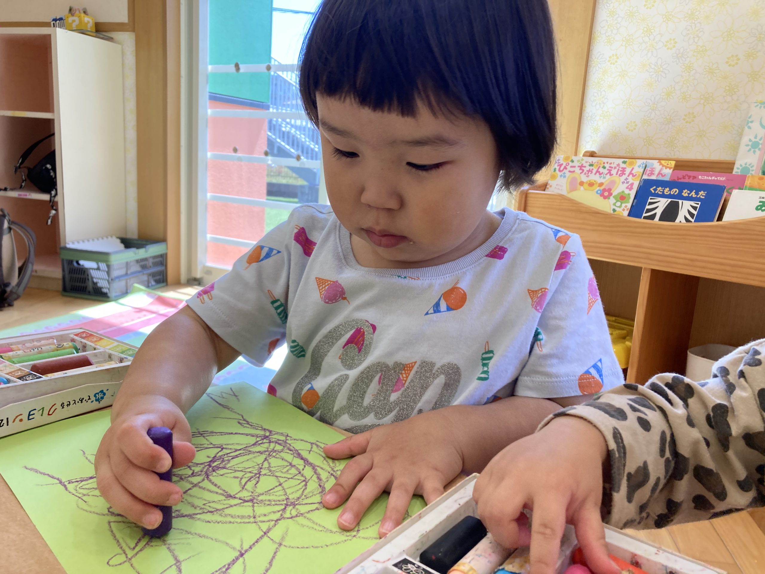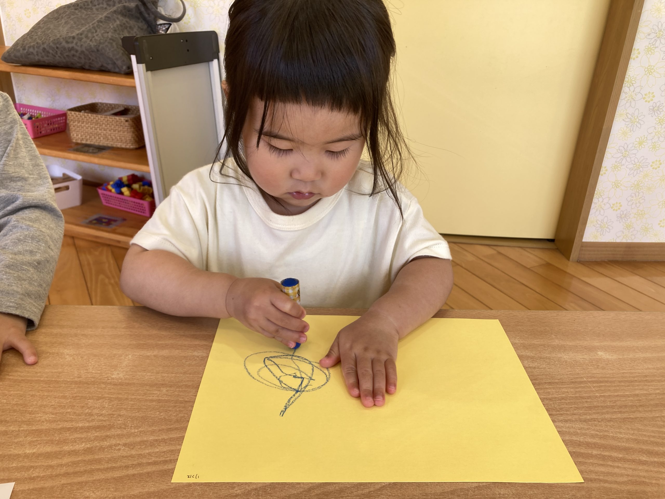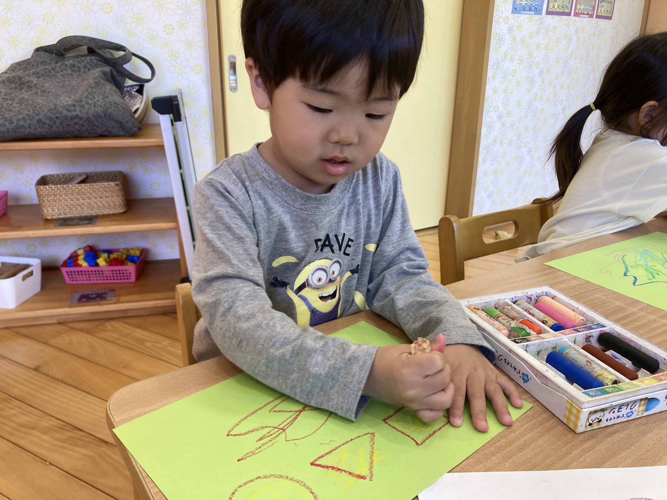 今日は、お絵描きをしました🎶好きな色のクレヨンを使って、〇△▢の形を描くことに挑戦してみました!難しそうにしながらも頑張って取り組んでいました🔥その後は、いろんなクレヨンを使って自由にお絵描きを楽しんでいましたよ😊