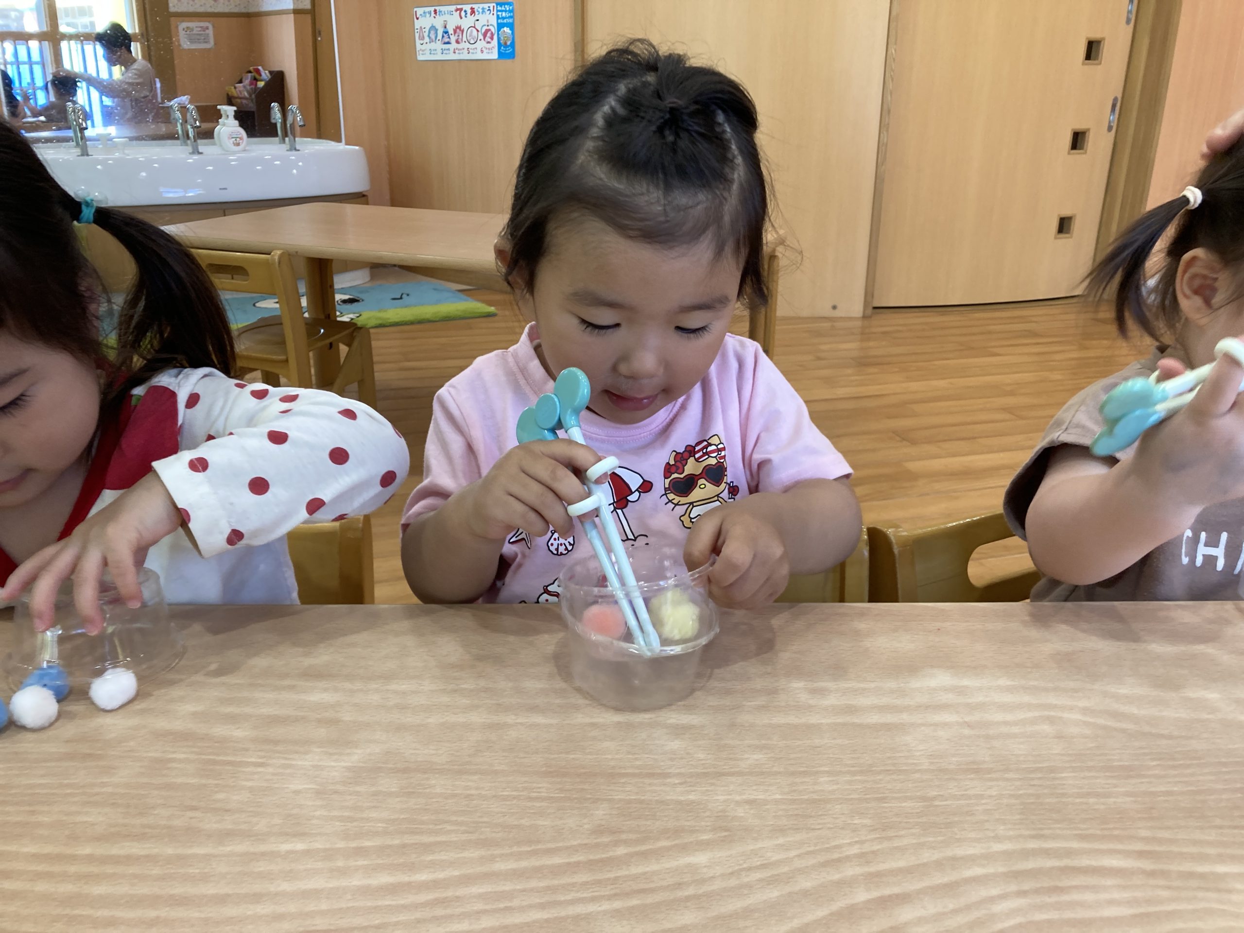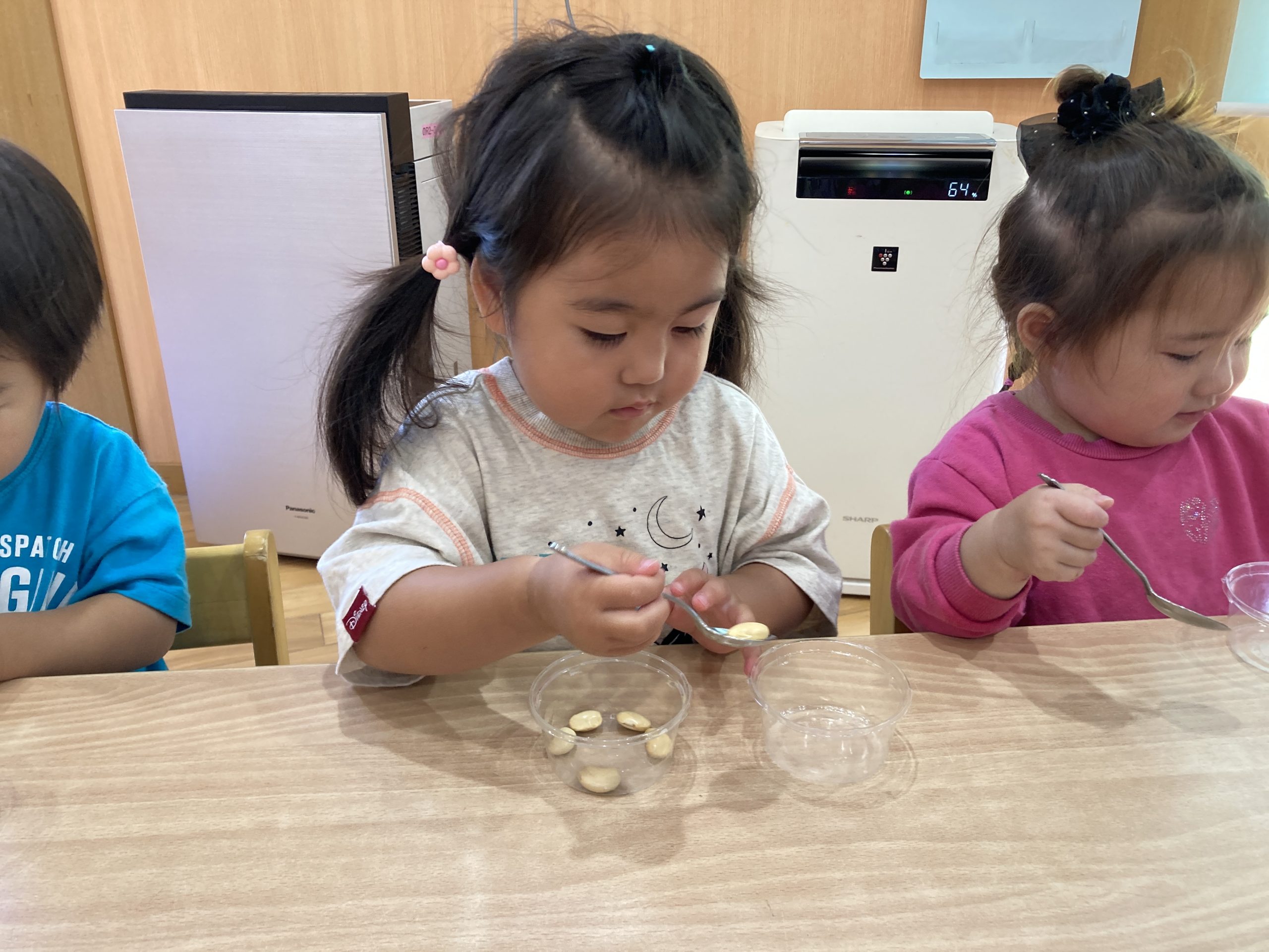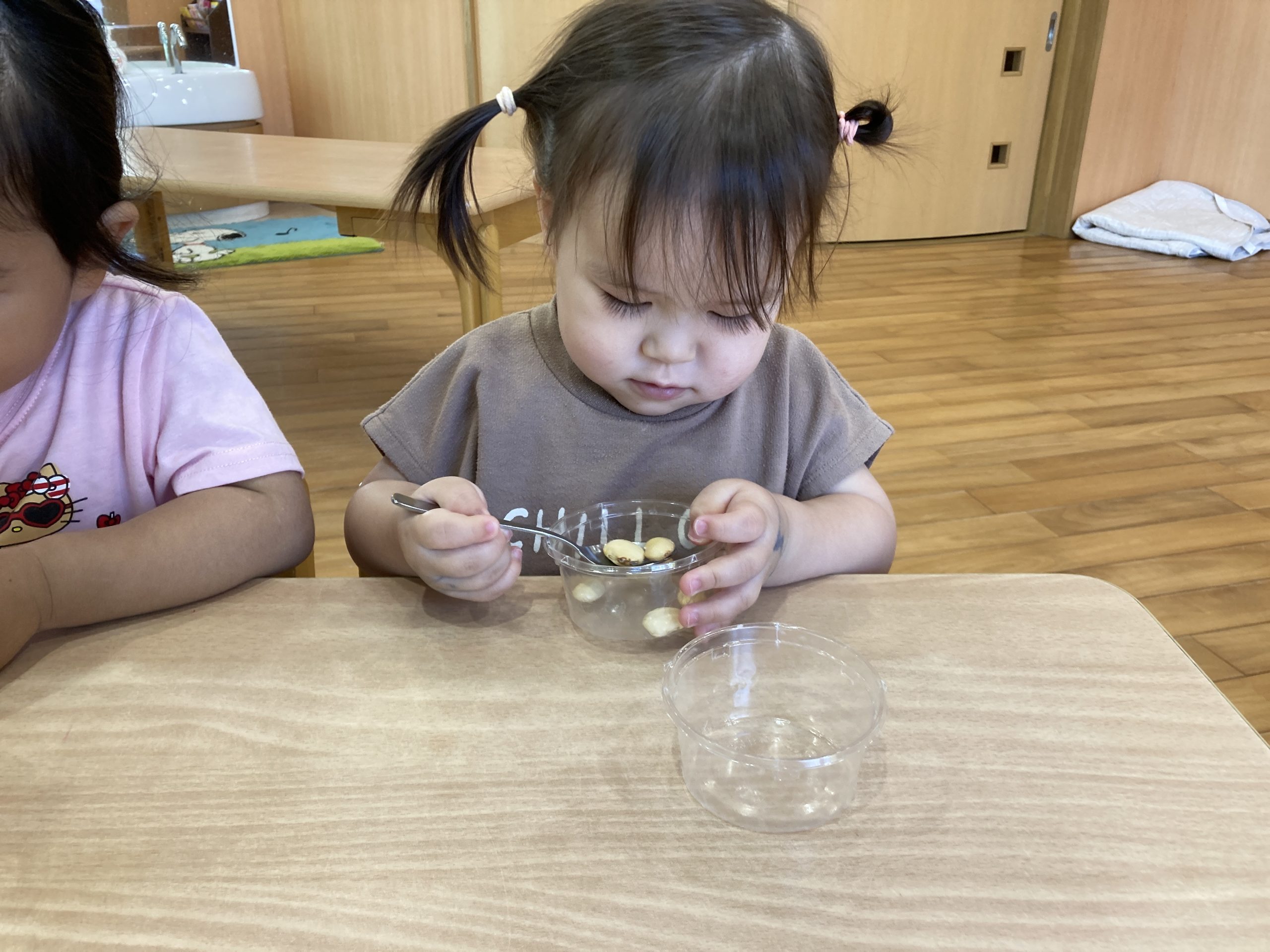 今日は、豆うつしをしました!スプーンやトング、エジソン箸を上手に使って、豆やスポンジを移すことができましたよ😊