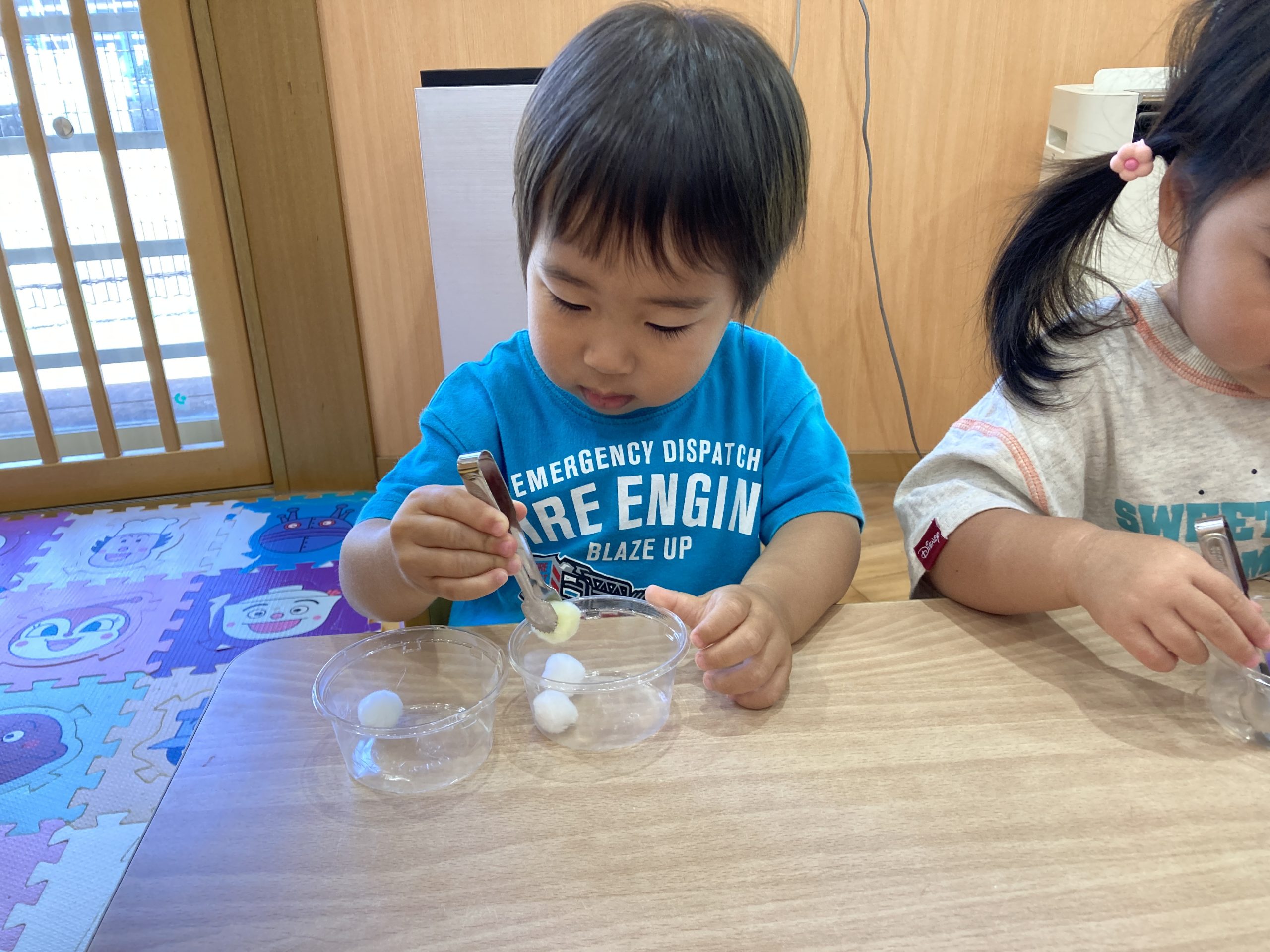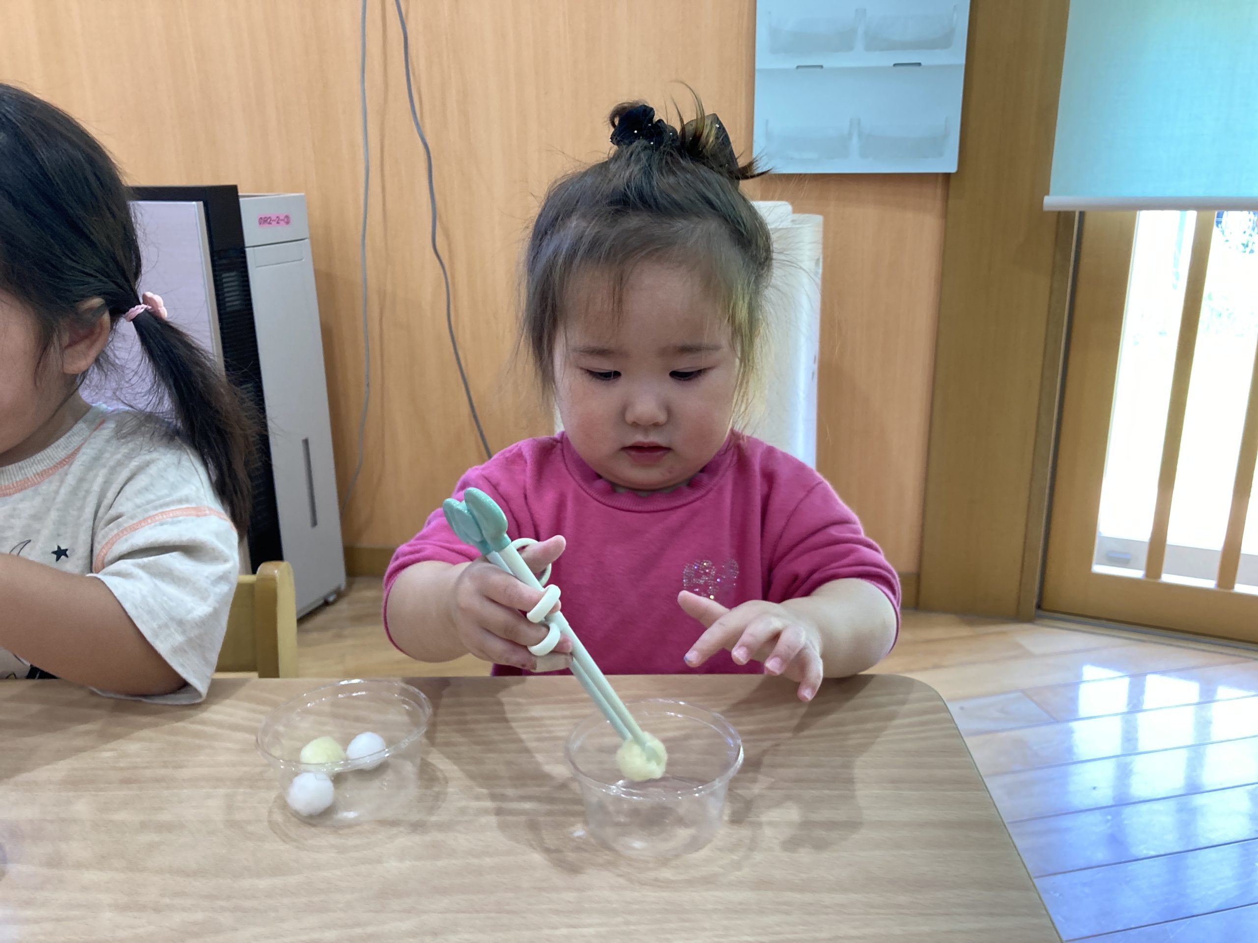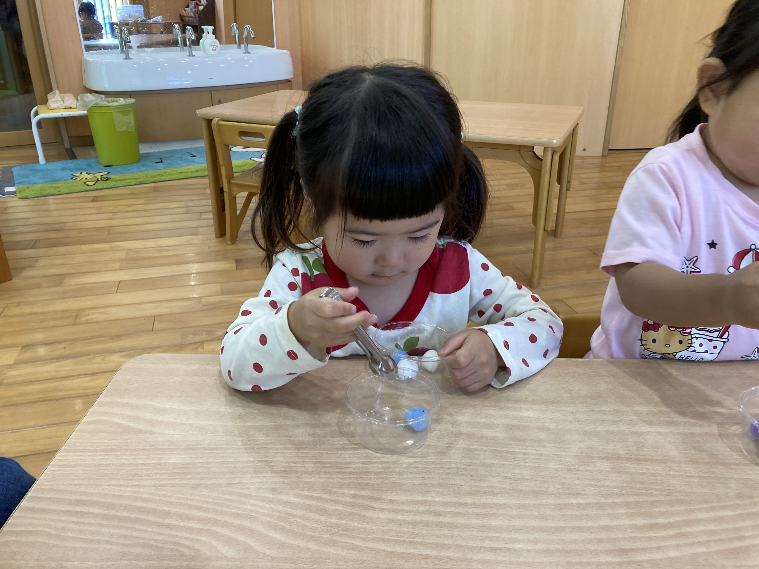 今日は、豆うつしをしました!スプーンやトング、エジソン箸を上手に使って、豆やスポンジを移すことができましたよ😊