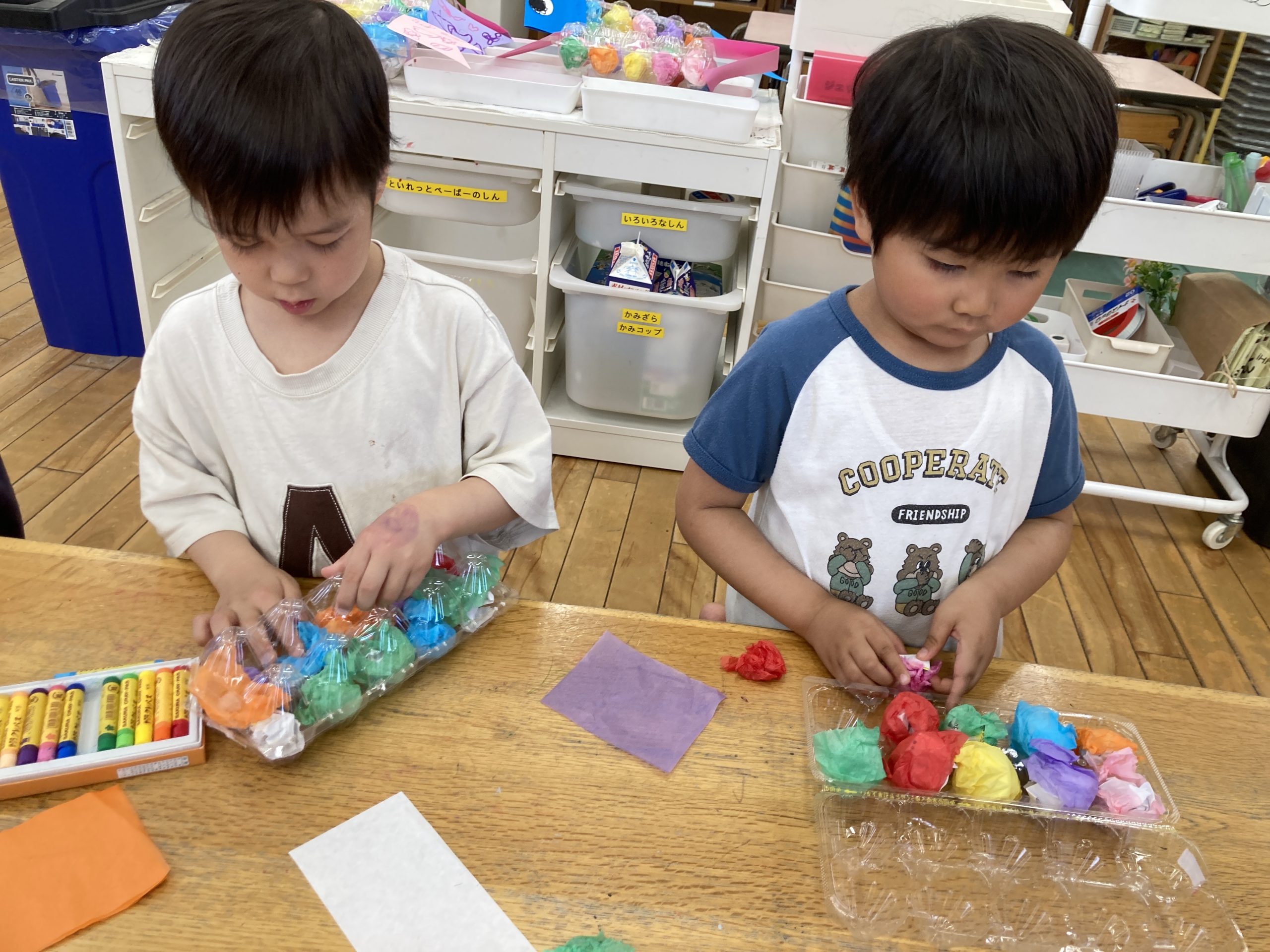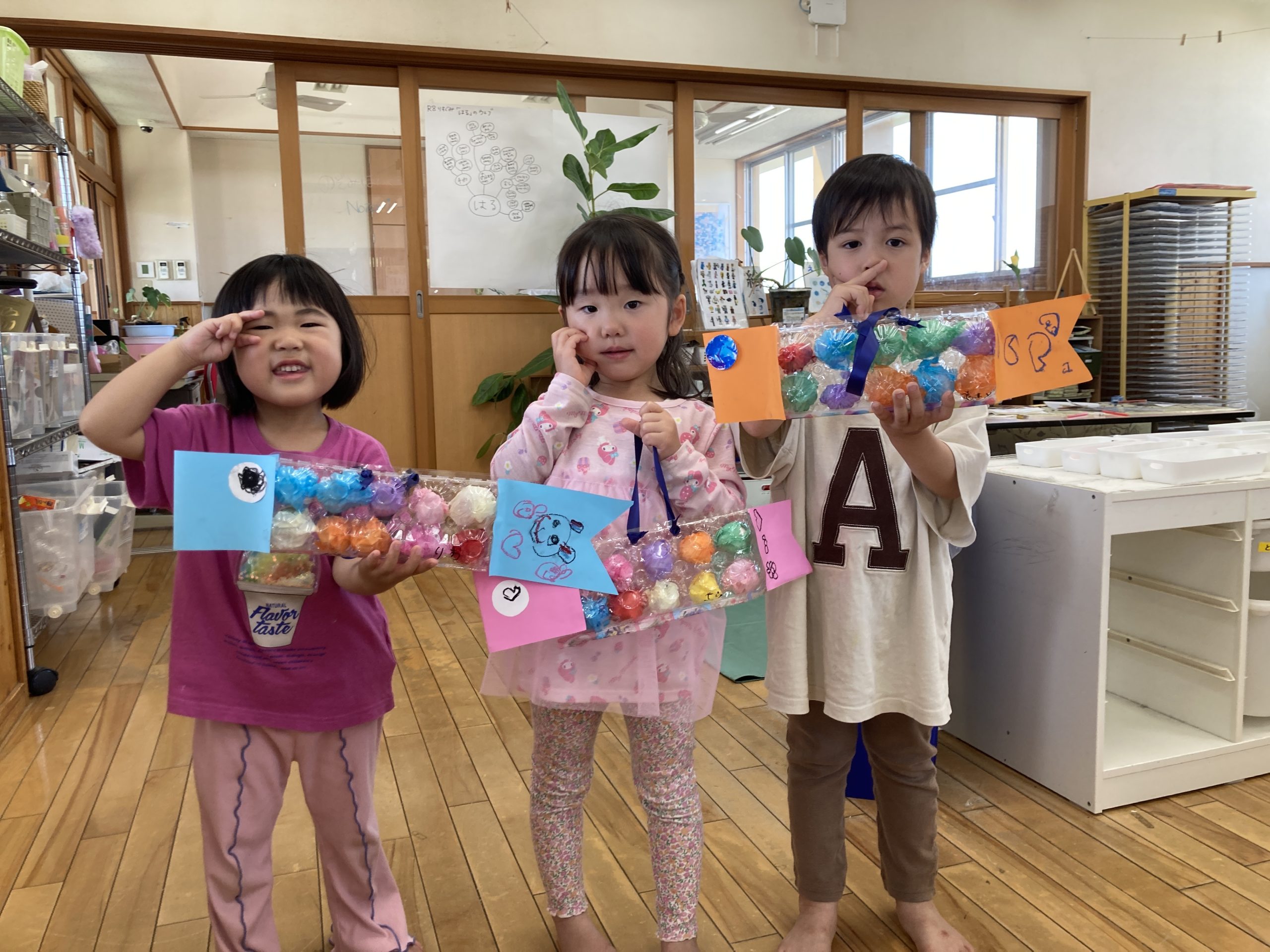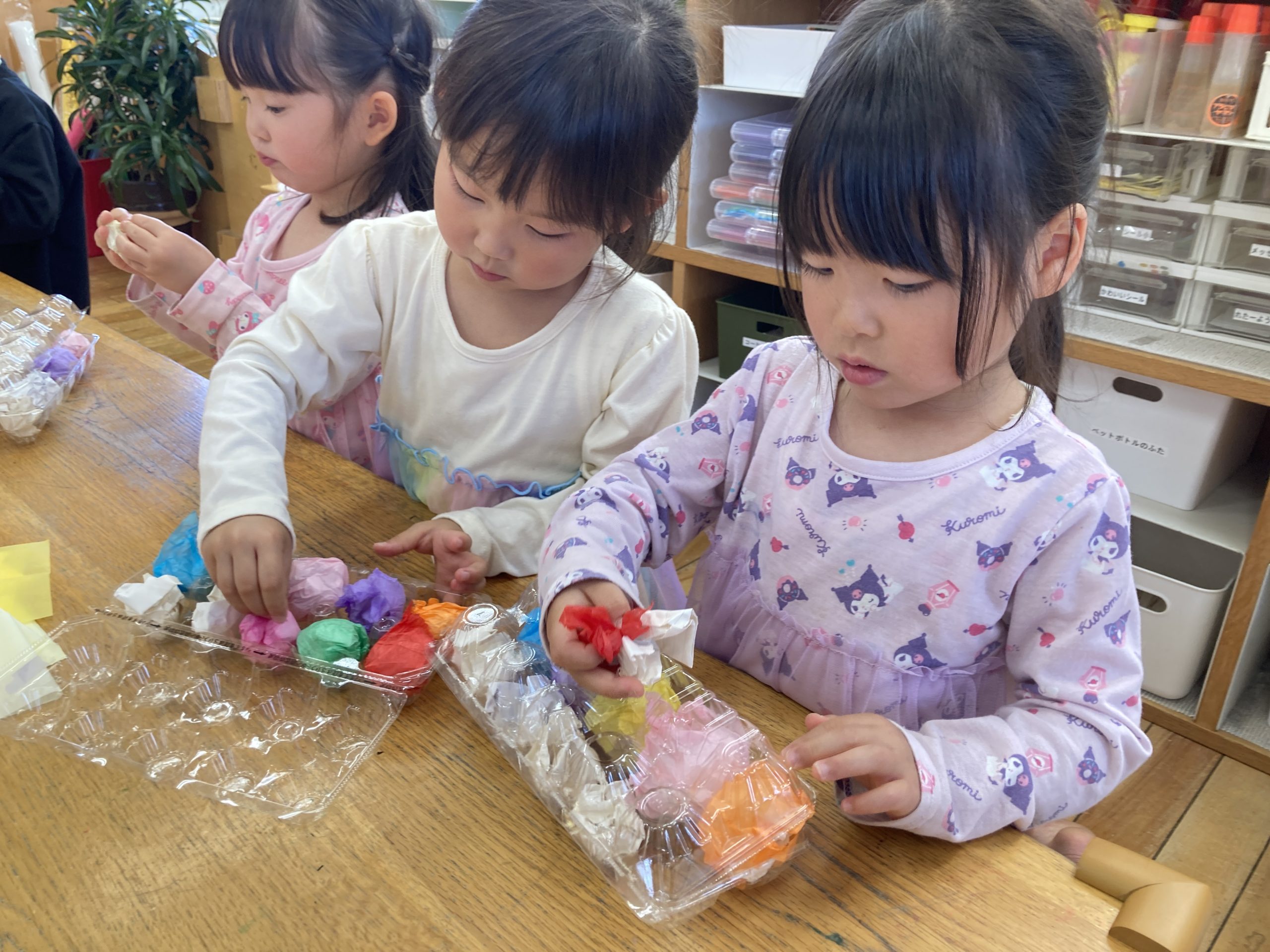今日は造形あそびで『こいのぼりのバッグ作り』をしました。卵パックを使って作りました。紙を丸めたり、お花紙で包んだり、クレヨンでお絵描きをしたりして、完成させました🎏