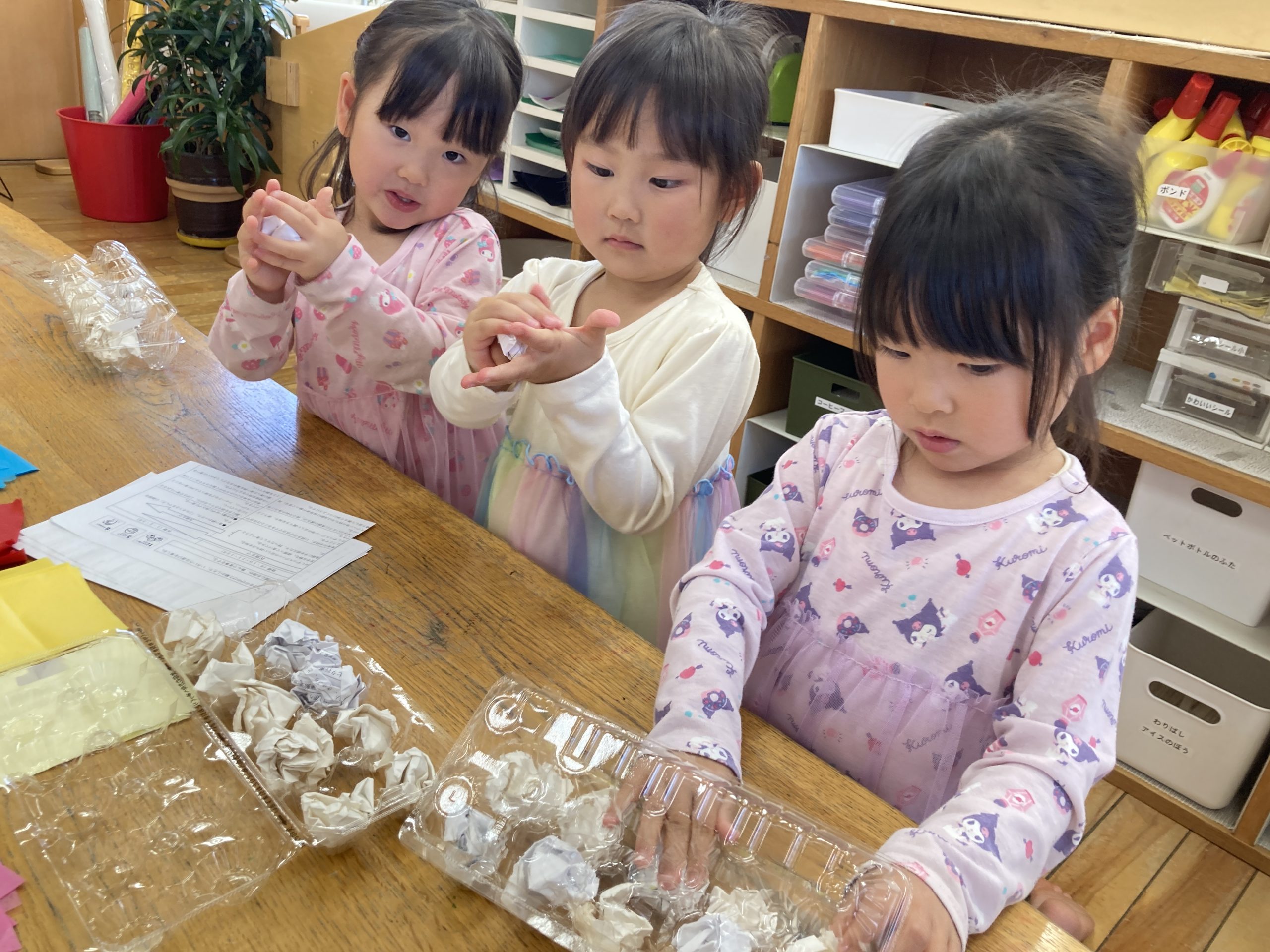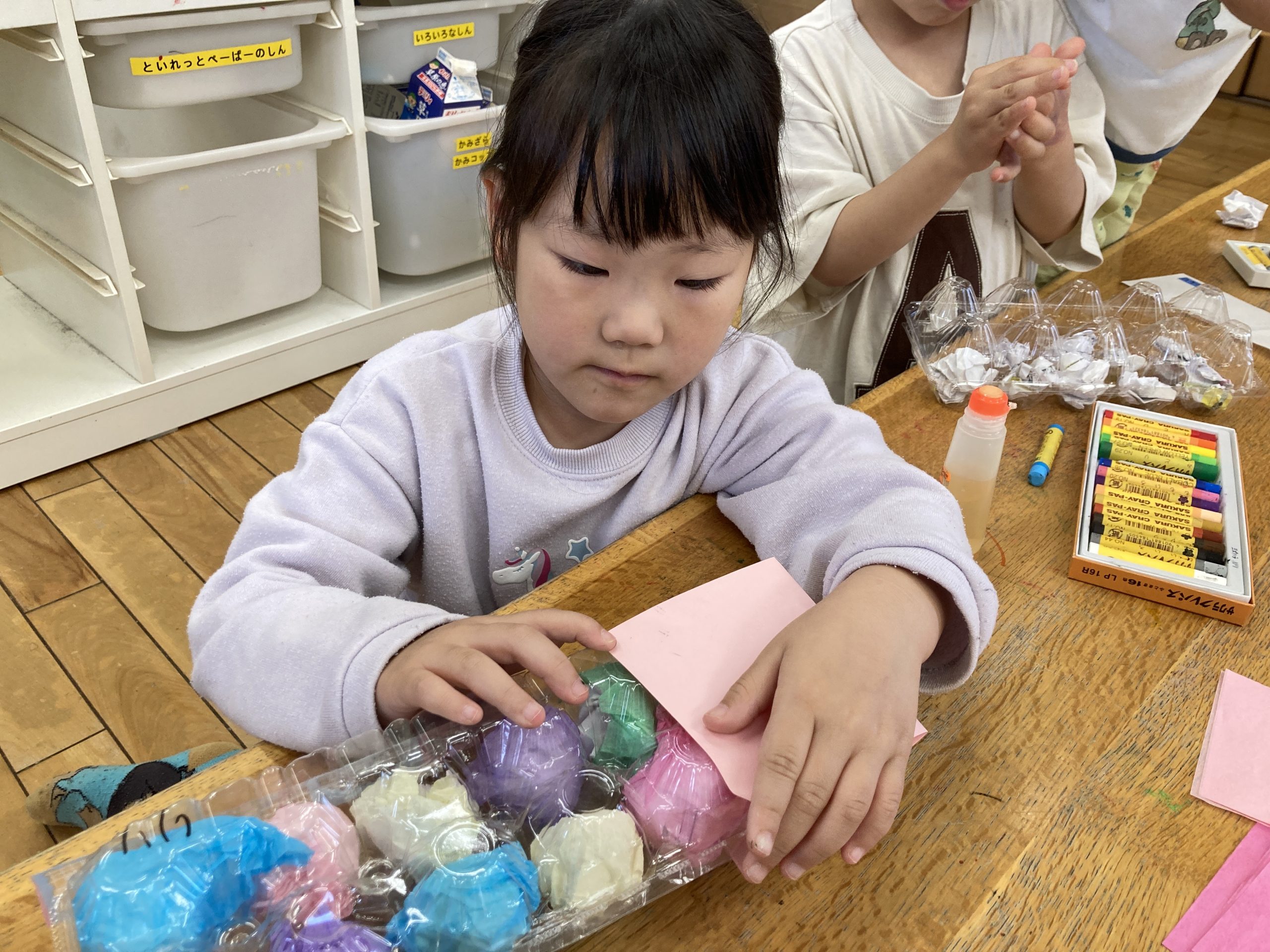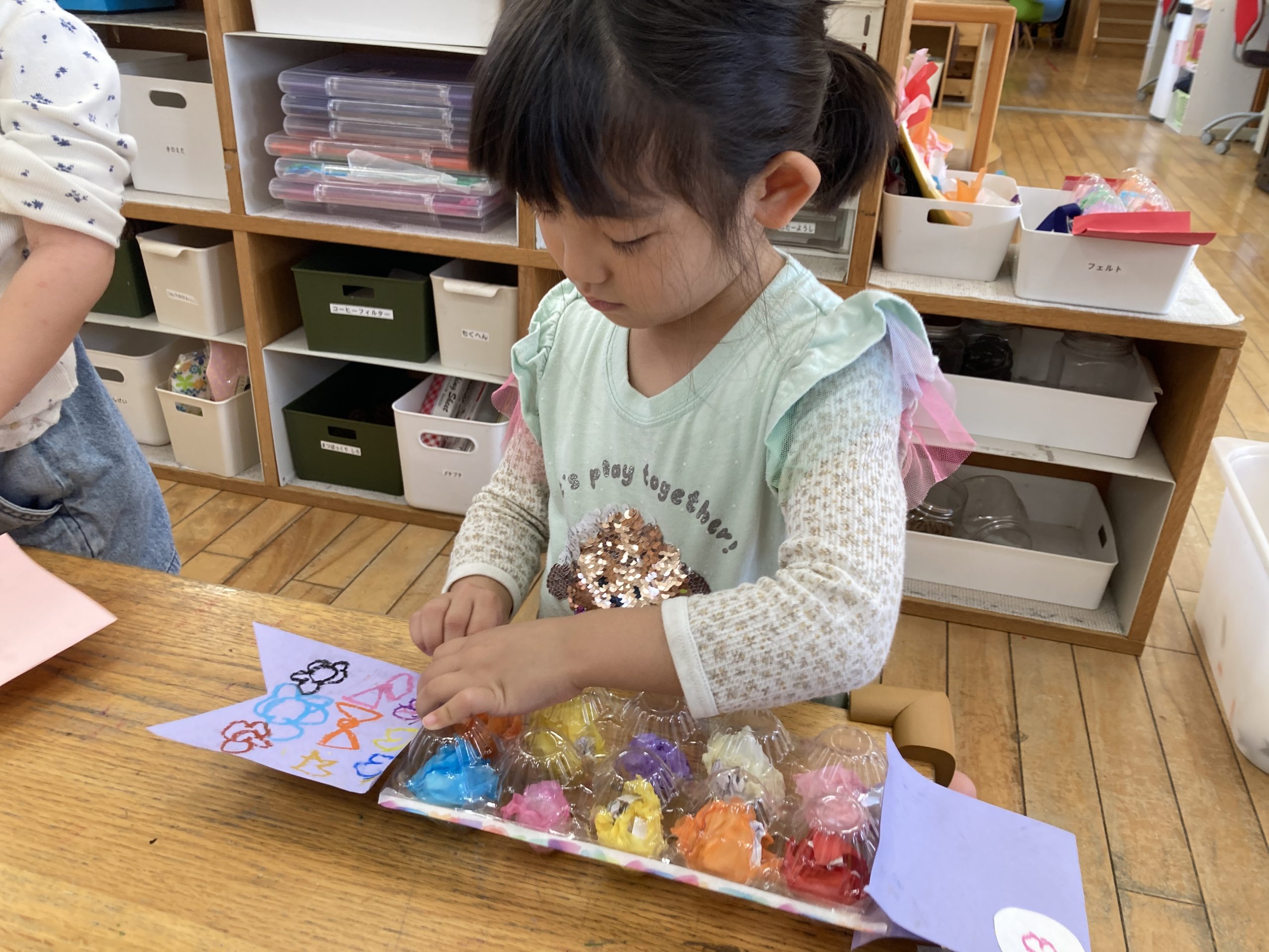 今日は造形あそびで『こいのぼりのバッグ作り』をしました。卵パックを使って作りました。紙を丸めたり、お花紙で包んだり、クレヨンでお絵描きをしたりして、完成させました🎏