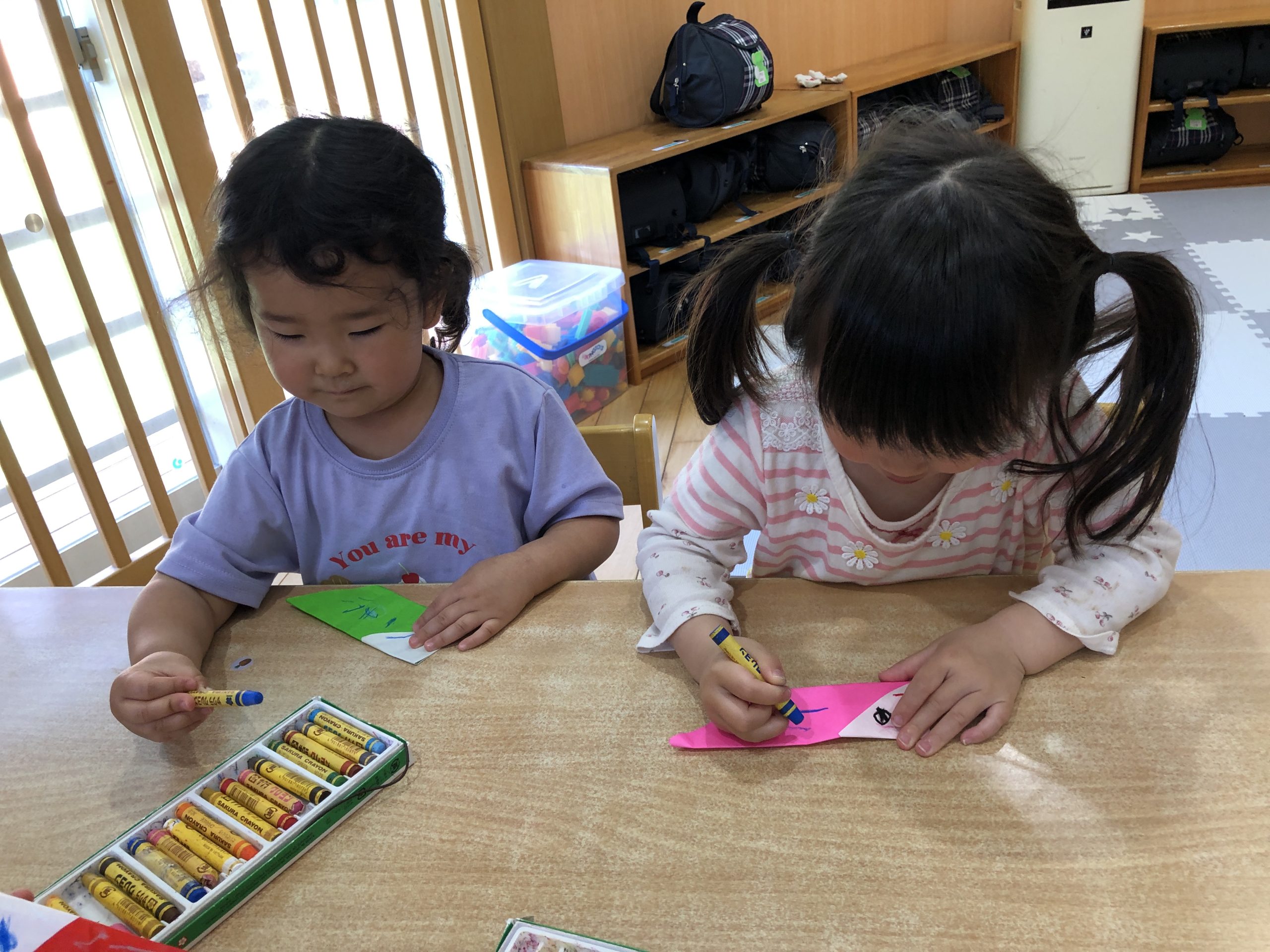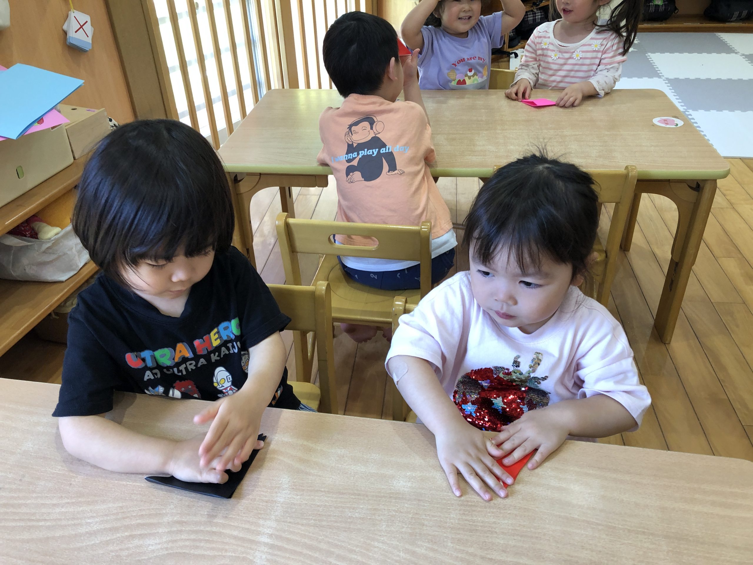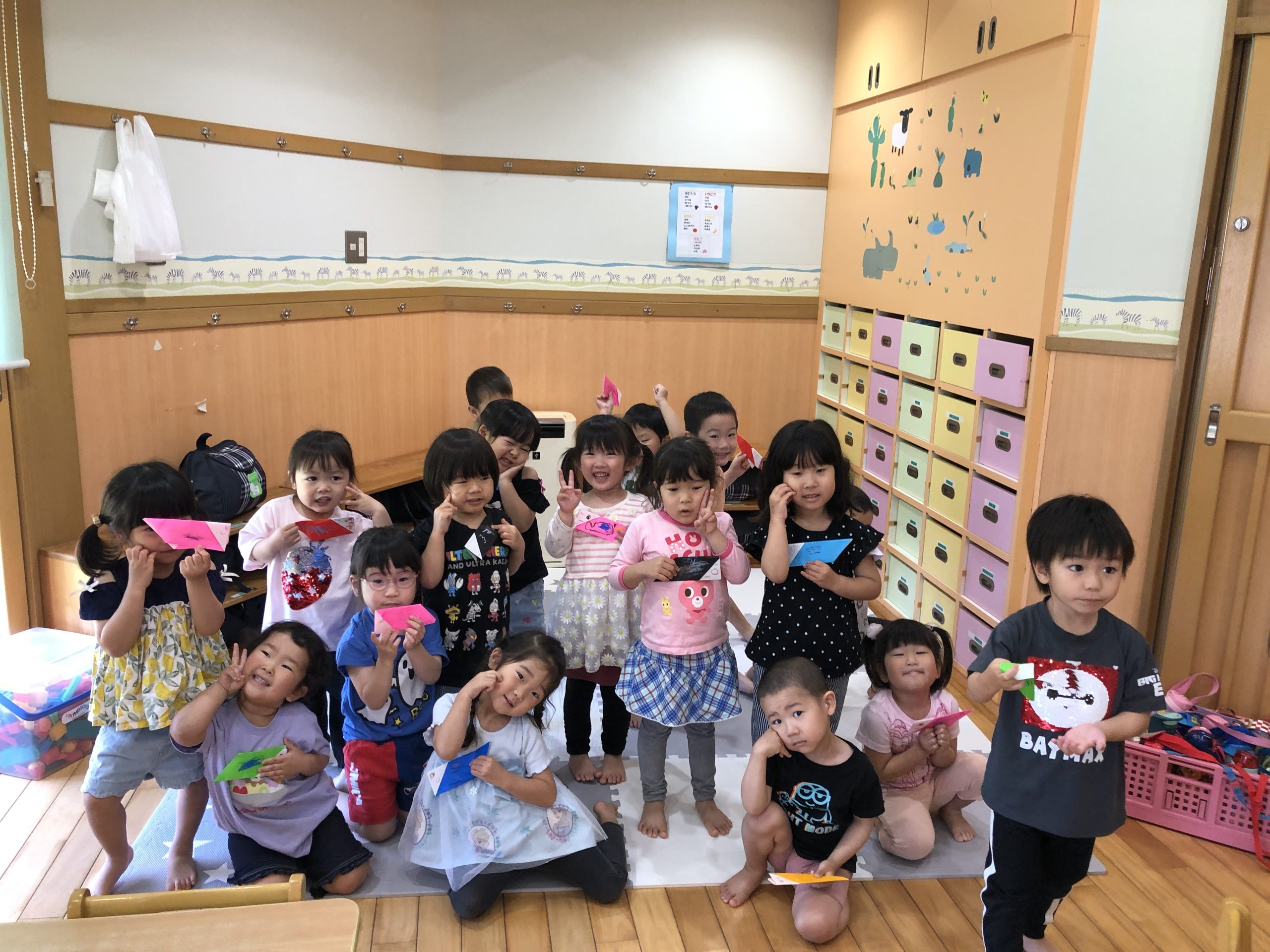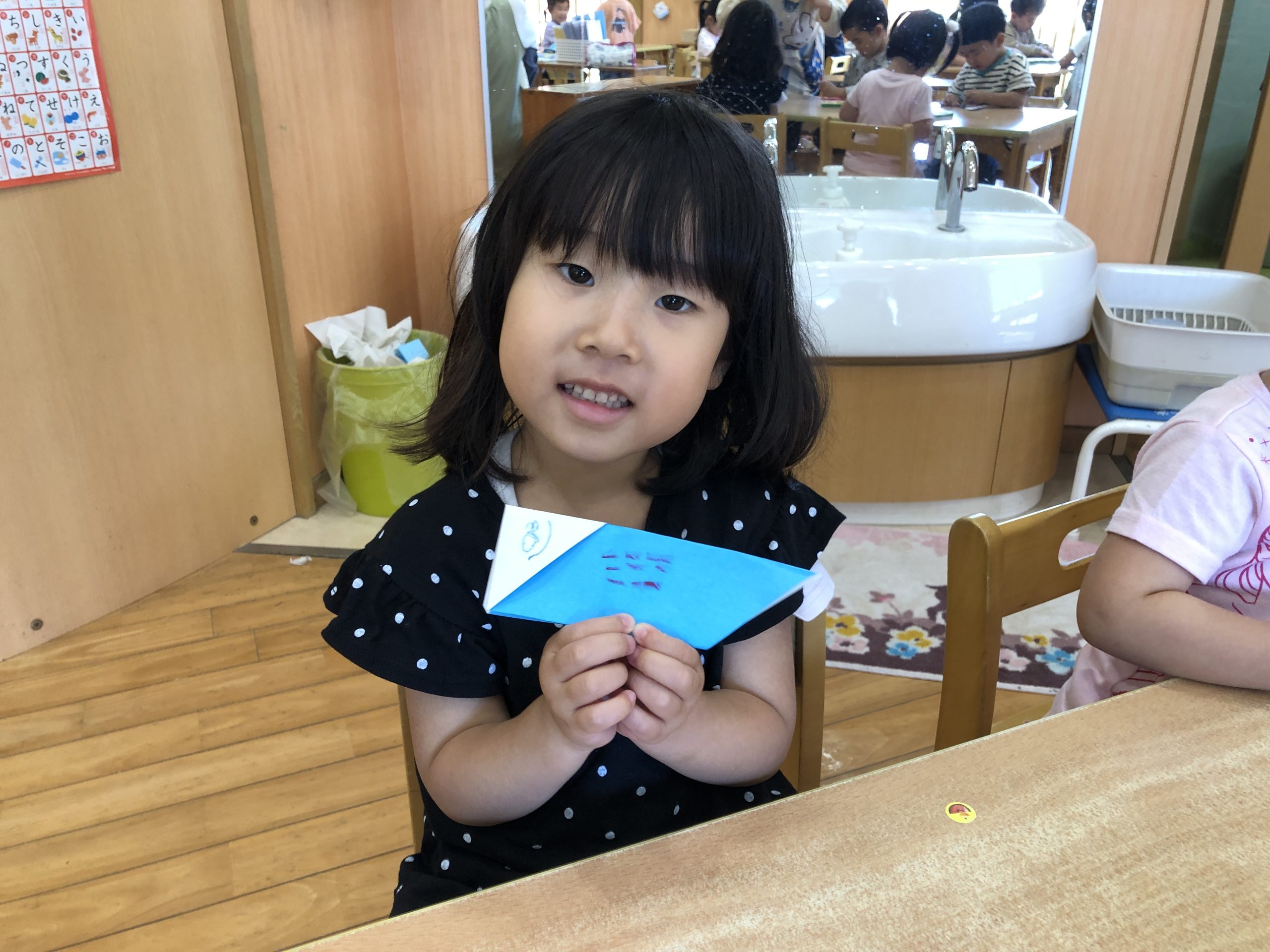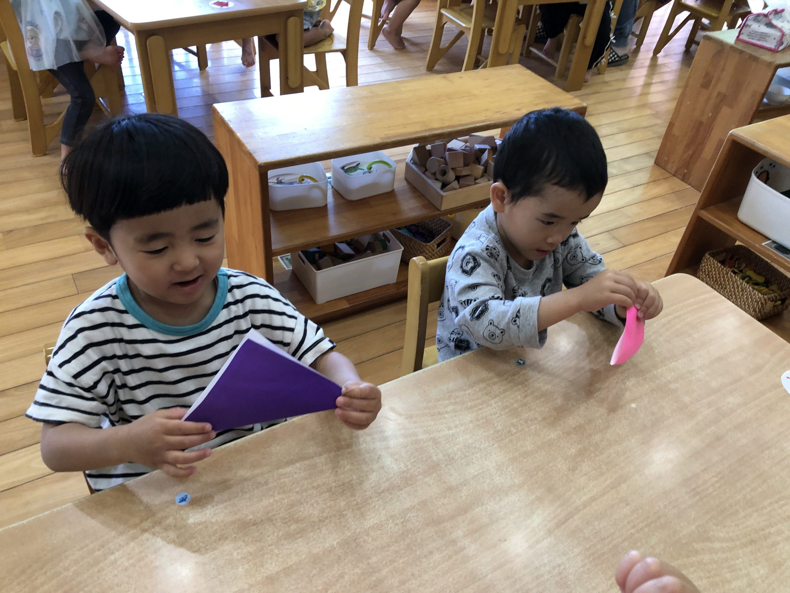 今日は、折り紙で「こいのぼり」をつくりました。保育者の折り方を真似しながら頑張って自分で折っていました。目と口、鱗を描いて完成させていました🎏