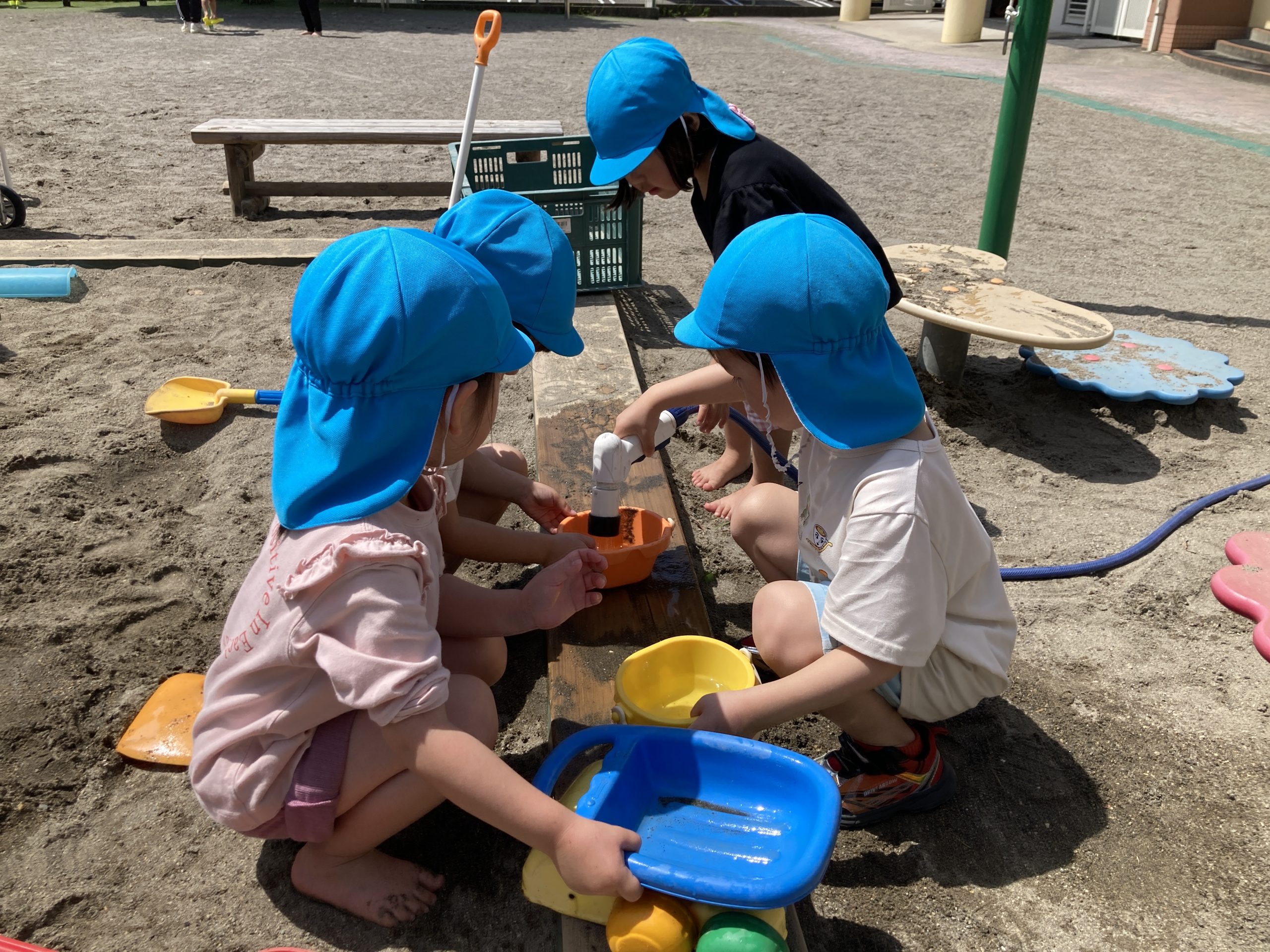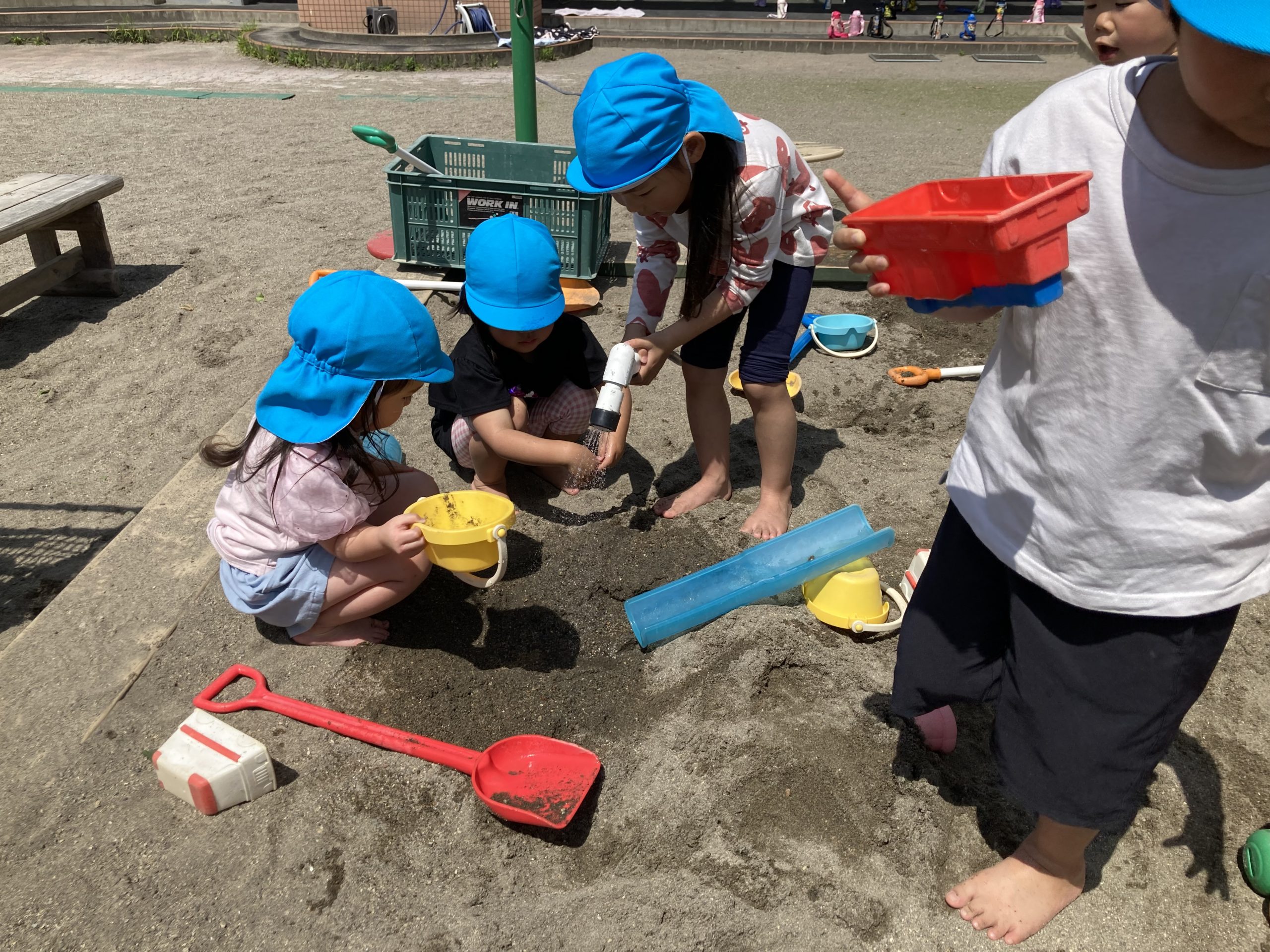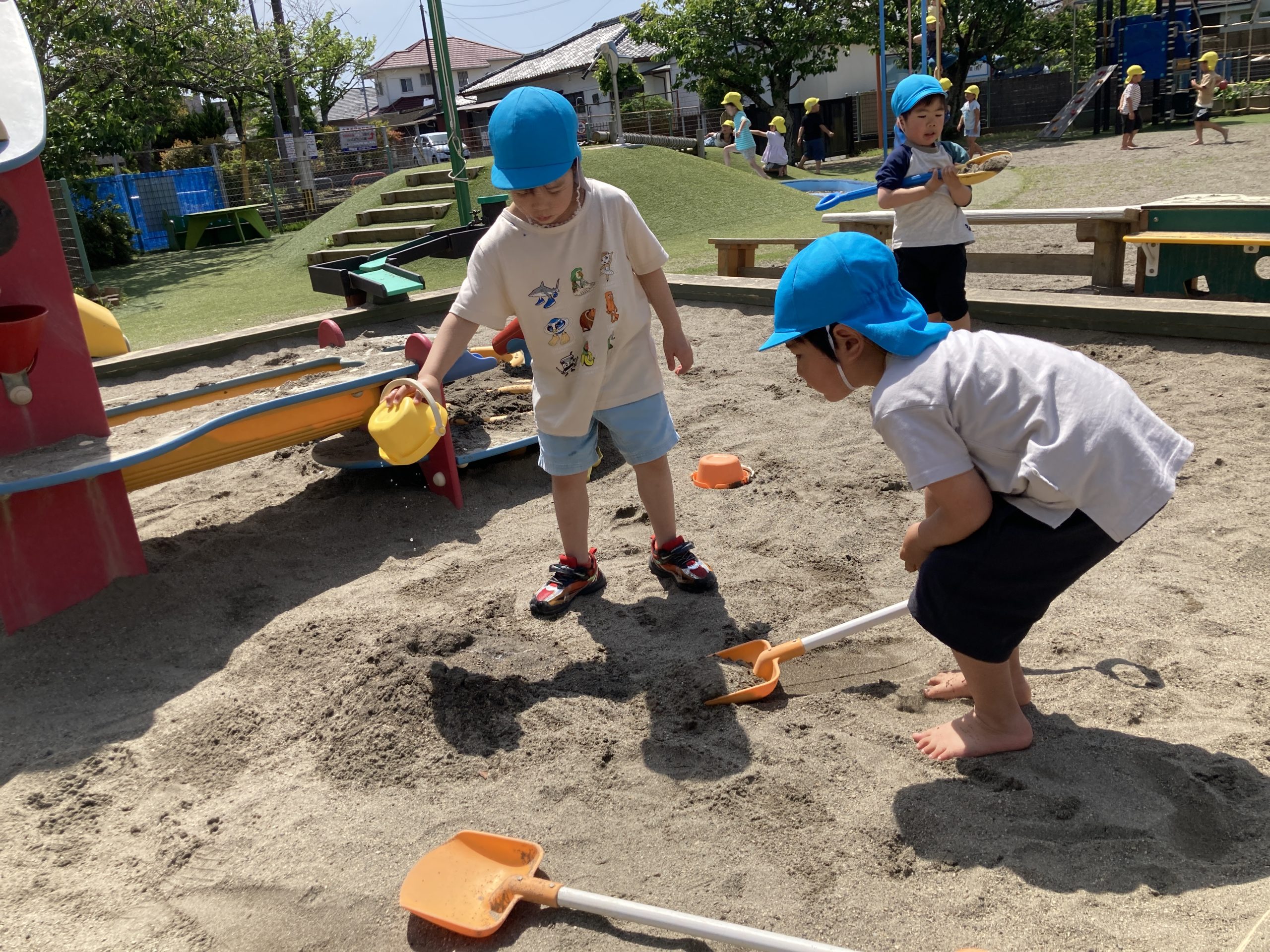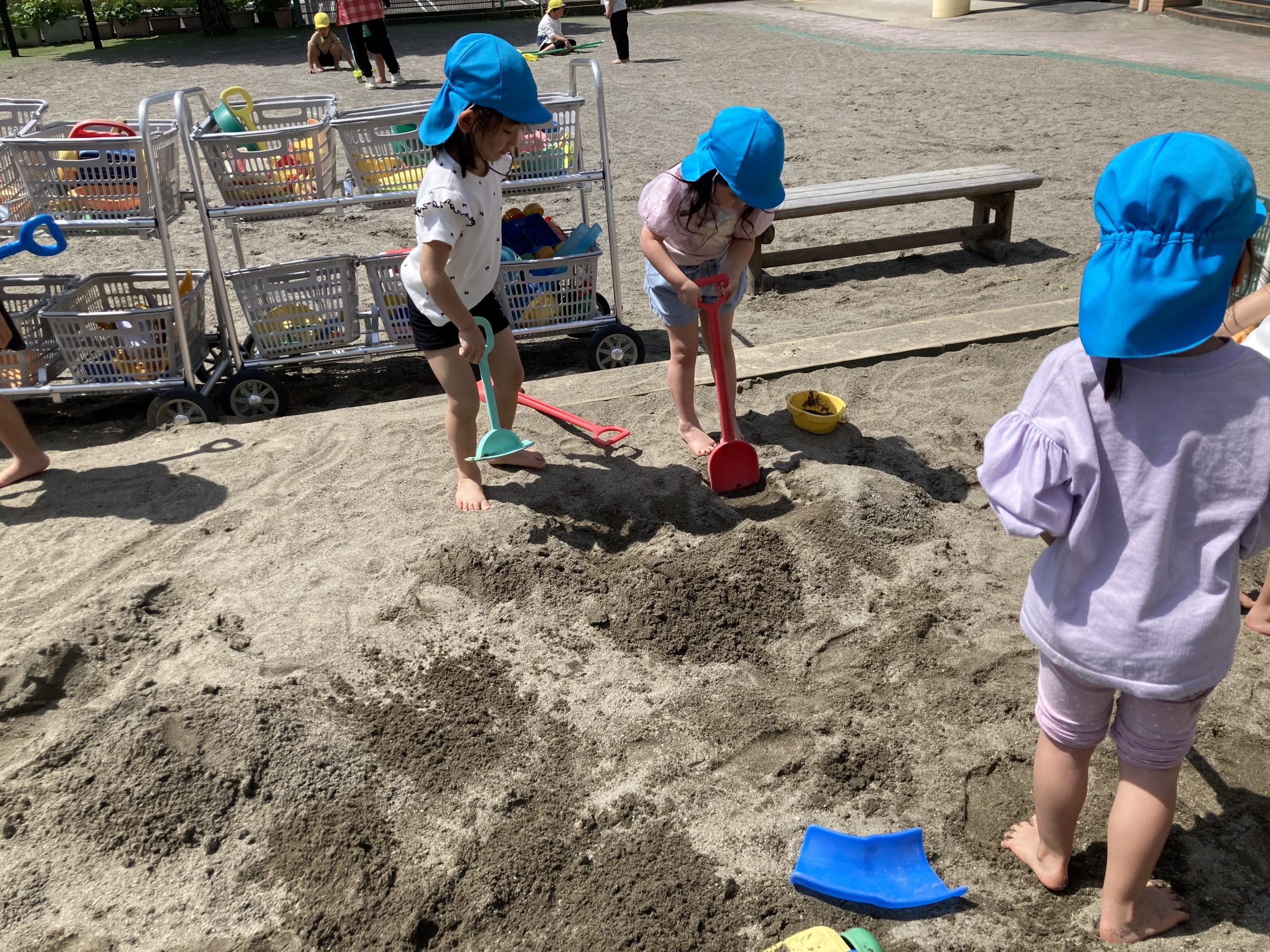 今日は戸外遊びをしました。縄跳び練習をした後、砂場で裸足になって、山や池などを作っていました。