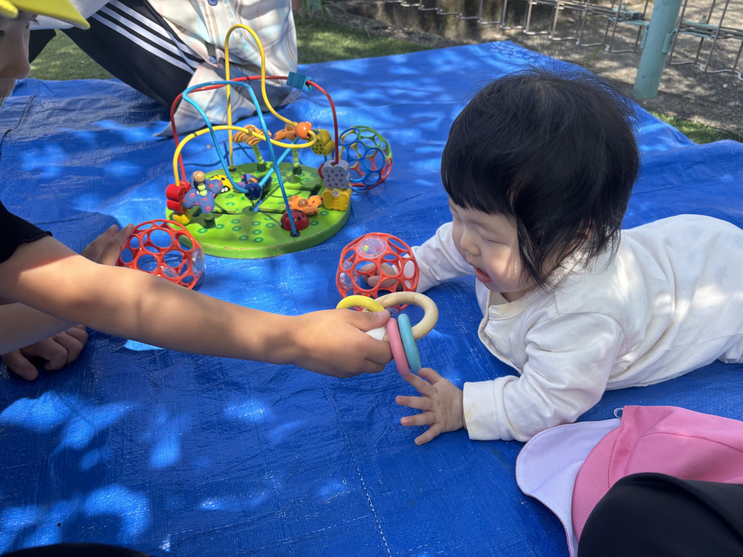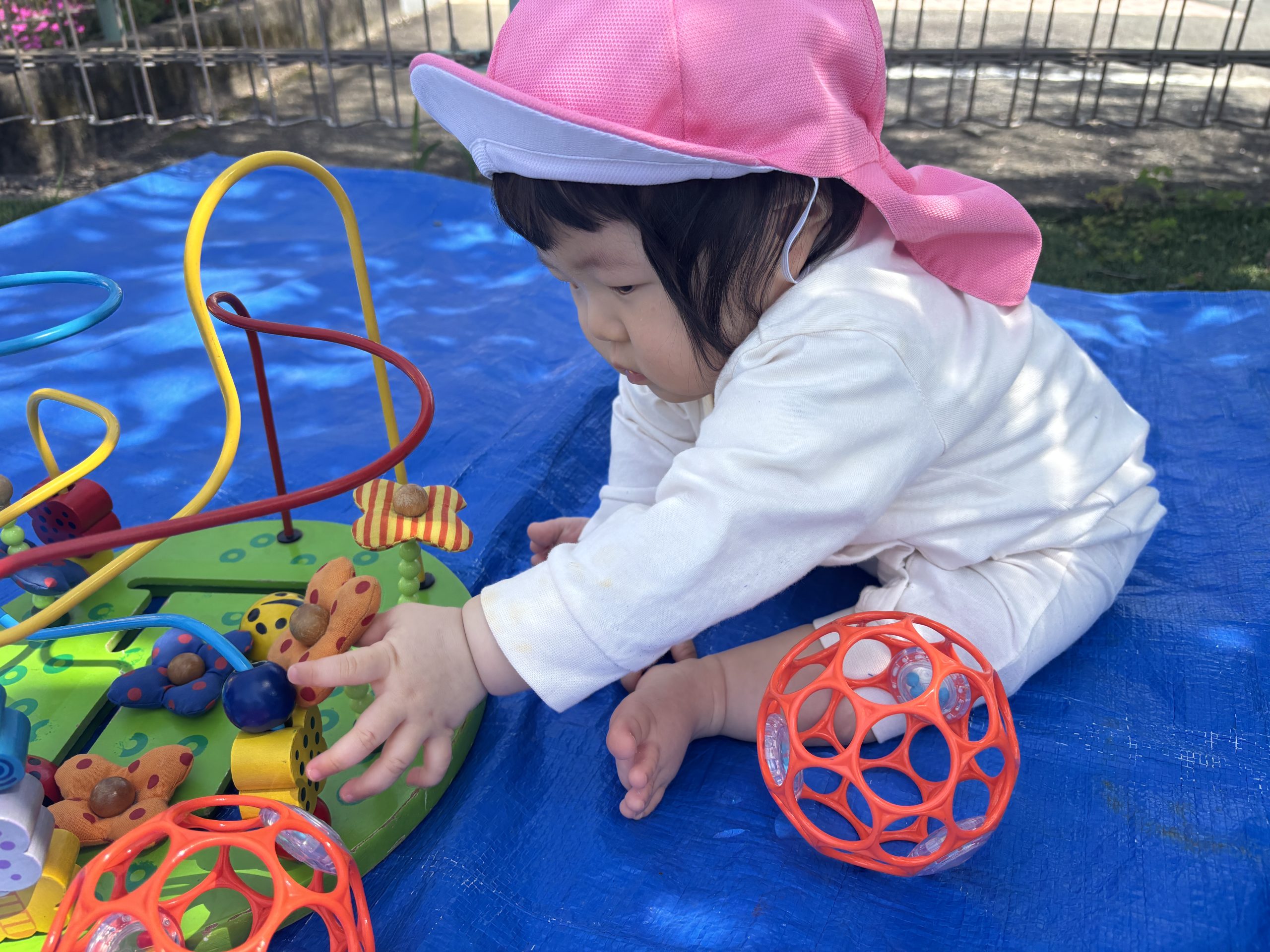 今日は築山でシートの上で遊びました🌿腹這いやお座りでローラーコースターやボールを手に取って遊んでいました🌷